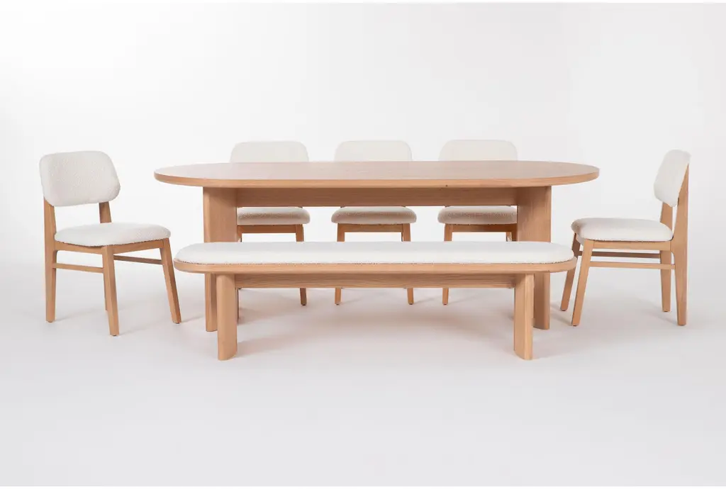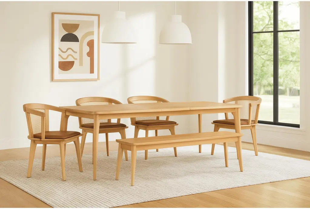 Mariko Natural Rectangular Wood 78-96" Extendable Dining Table With Faux Leather Bench + Armchair Set For 6 | Birch