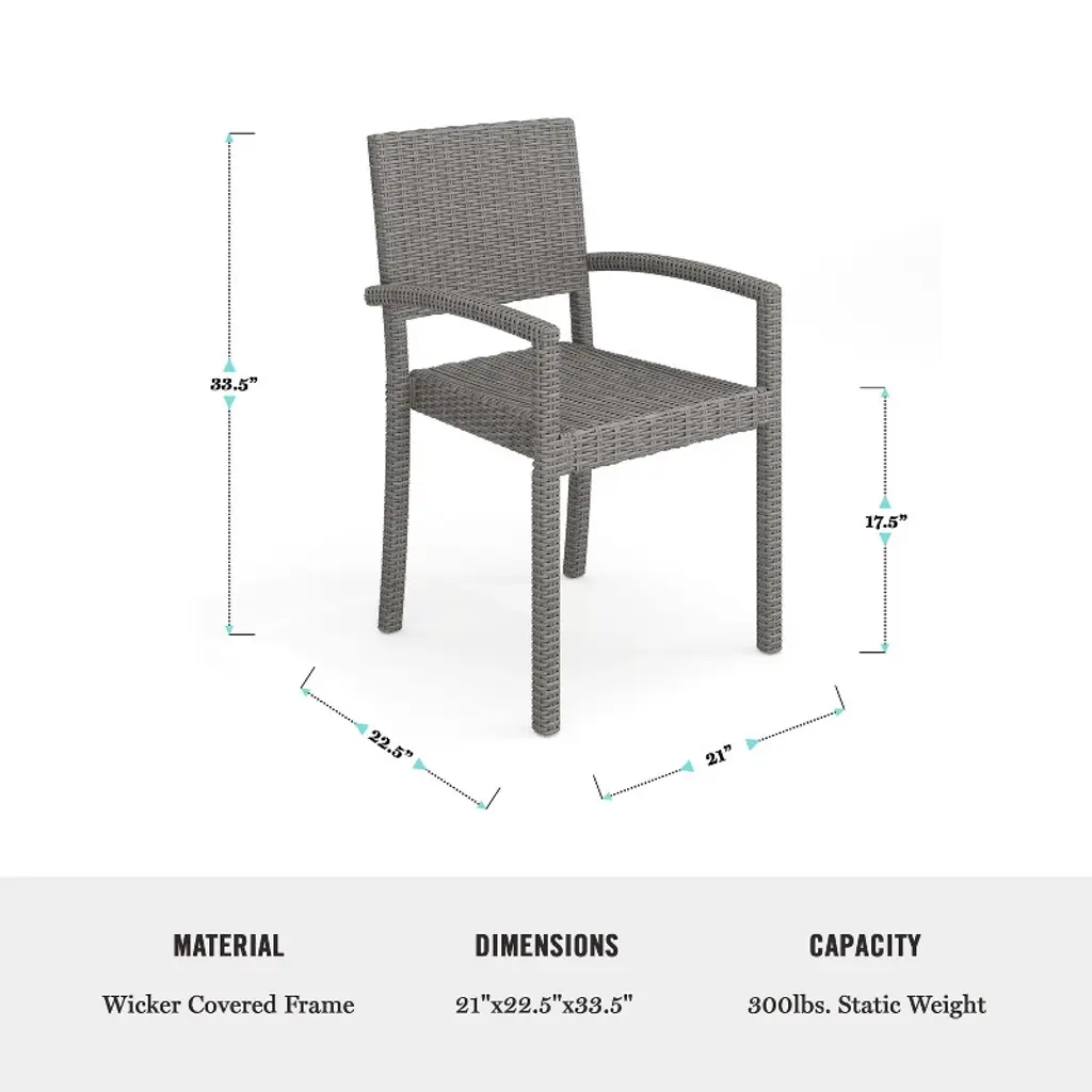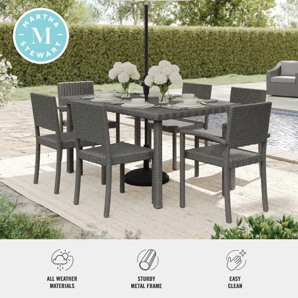 Refresh your patio space with the chic style and cozy comfort of this Martha Stewart Bedford Patio Dining Set. Sturdily built, this set with two patio armchairs, four side chairs, and a 62” patio table is ideal for reading al fresco, enjoying cocktails with friends, or simply relaxing. With a recommended stack quantity up to eight chairs high, you can effortlessly store multiple chairs when not using. The table boasts a faux wood top with an umbrella hole (umbrella not included) and adjustable floor glides for a level surface while you make the most of sunny days or starlit evenings. Part of our Bedford collection, this set pairs wonderfully with the coordinating pieces allowing you to craft a custom collection that fits your entertaining needs. For your convenience, your chairs arrive with no assembly required and table setup is simple with tools included and step-by-step instructions, while upkeep is quick and easy.
