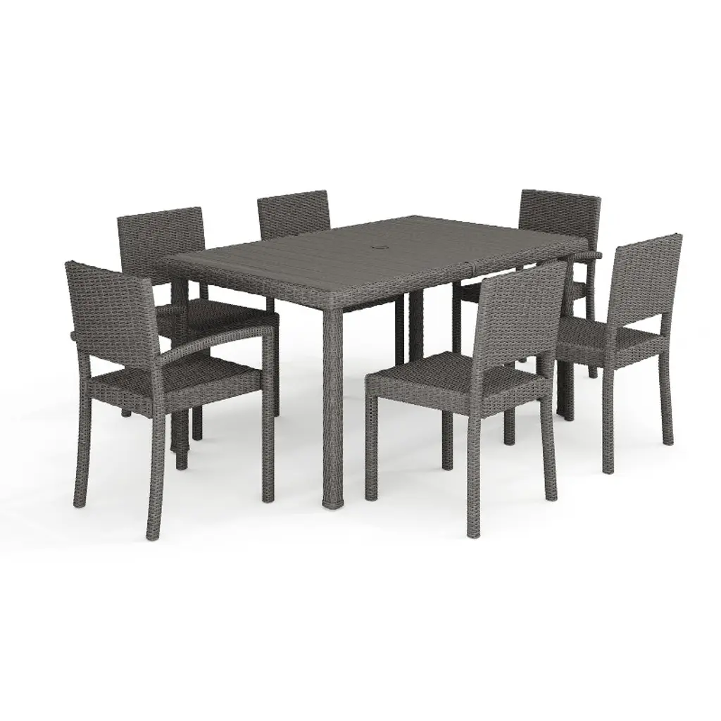 Refresh your patio space with the chic style and cozy comfort of this Martha Stewart Bedford 9-Piece Patio Dining Set. Sturdily built, this set with two patio armchairs, six side chairs, and a 71" patio table is ideal for reading al fresco, enjoying cocktails with friends, or simply relaxing. With a recommended stack quantity up to eight chairs high, you can effortlessly store multiple chairs when not using. The table boasts a faux wood top with an umbrella hole (umbrella not included) and adjustable floor glides for a level surface while you make the most of sunny days or starlit evenings. Part of our Bedford collection, this set pairs wonderfully with the coordinating pieces allowing you to craft a custom collection that fits your entertaining needs. For your convenience, your chairs arrive with no assembly required and table setup is simple with tools included and step-by-step instructions, while upkeep is quick and easy.