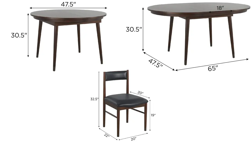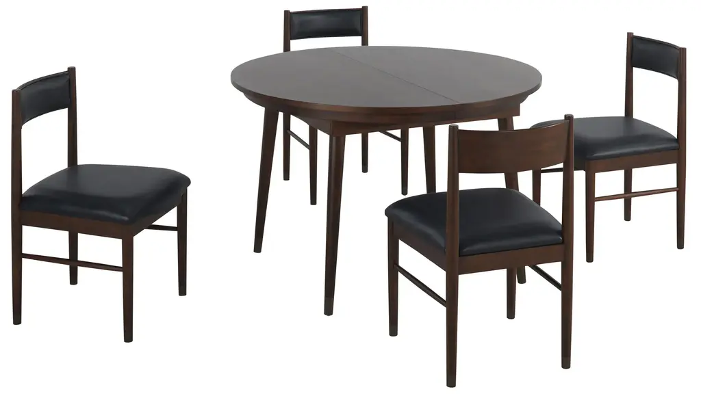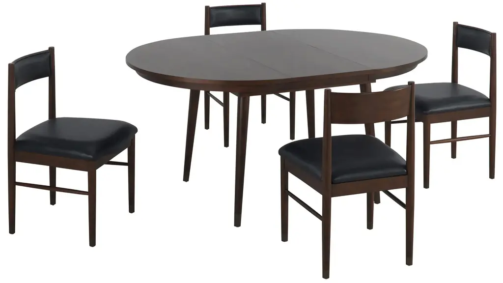 The Mateo 5-pc. Dining Set features an oval table with a cherry finish and an 18-inch butterfly leaf. The table adapts to your size needs without sacrificing style. The clean look and effortless versatility make it a perfect fit for smaller weeknight meals and larger gatherings too. The side chairs have leather upholstery for comfort and durability, with a sturdy, supportive design.