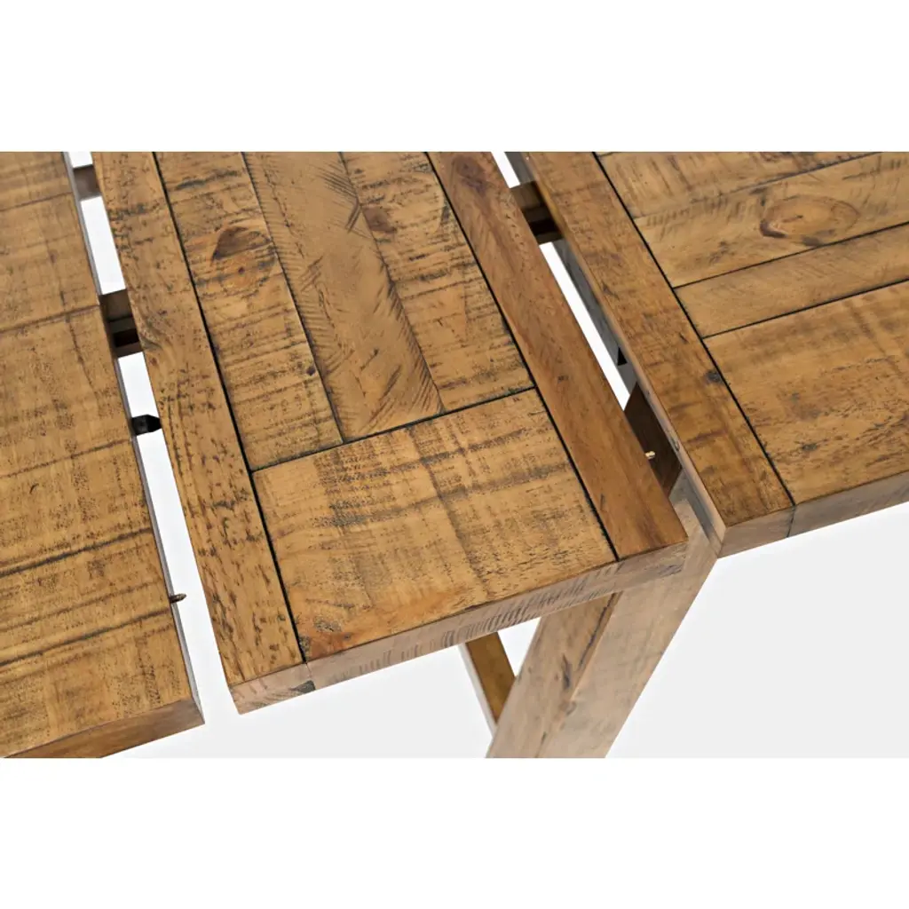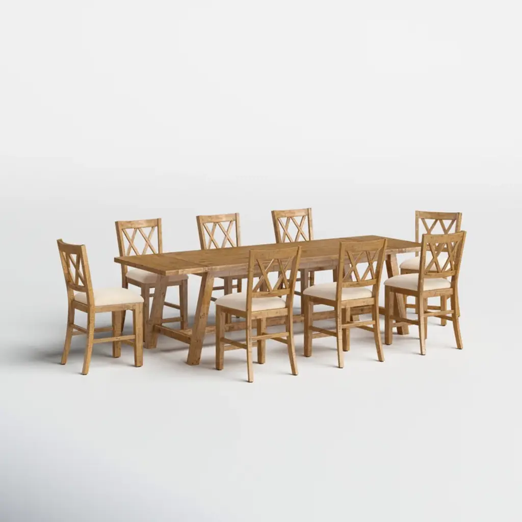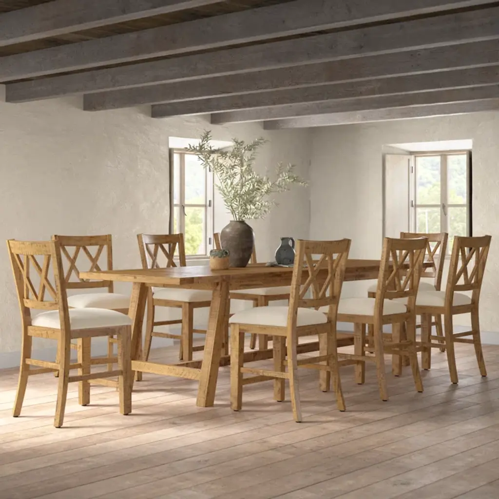 The set is the essence of style with solid pine handcrafted into spectacular furniture perfect for any room in your home. Each piece is unique with subtle distressing that brings out the beauty of the natural wood. The dining table is truly an incredible display of style and includes two removable extensions. Experience the look and feel of solid full-grain pine that has been crafted with the utmost care. This set includes X-back dining chairs with soft upholstered fabric.
