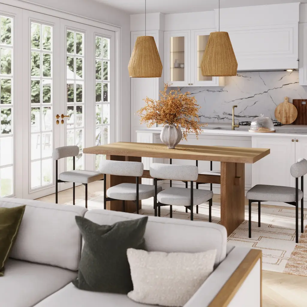 Introducing our latest dining set: the perfect blend of style and function for your home! The Briggs dining table comfortably seats six and features a durable, thick-panel construction topped with a beautifully veneered surface—each table is unique with its own variations in color and texture. Paired with the Dahlia dining chairs, you'll enjoy mid-century inspired wire frames, curved backs, and cushioned seats that make every meal a pleasure. Plus, with easy assembly, you’ll be hosting in no time. Make your dining area a warm and welcoming space with this charming set! Set includes 1 dining table and 6 chairs.