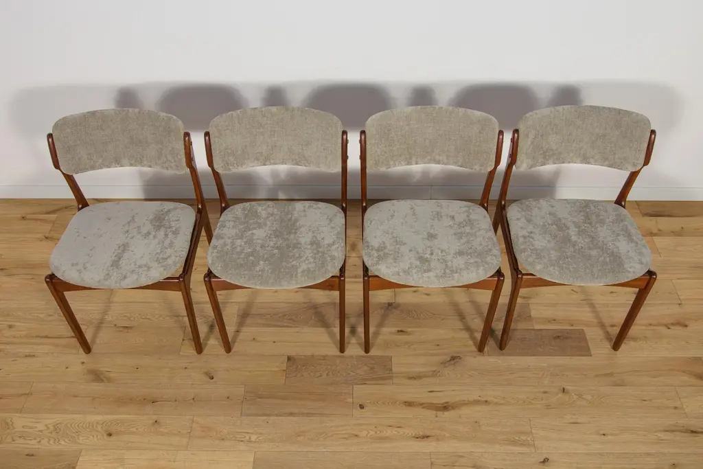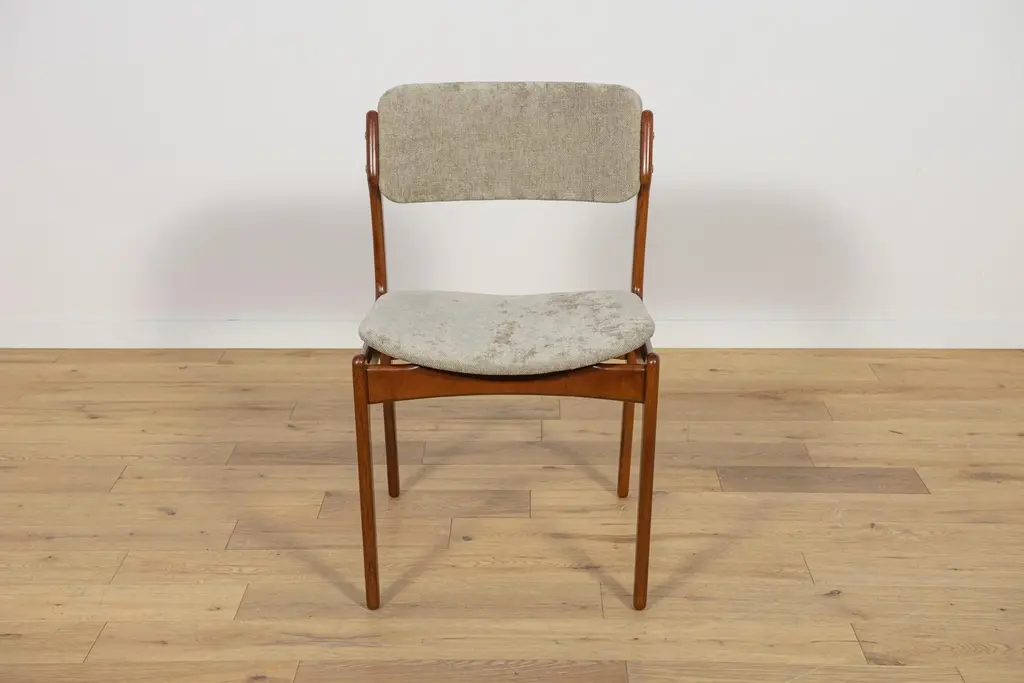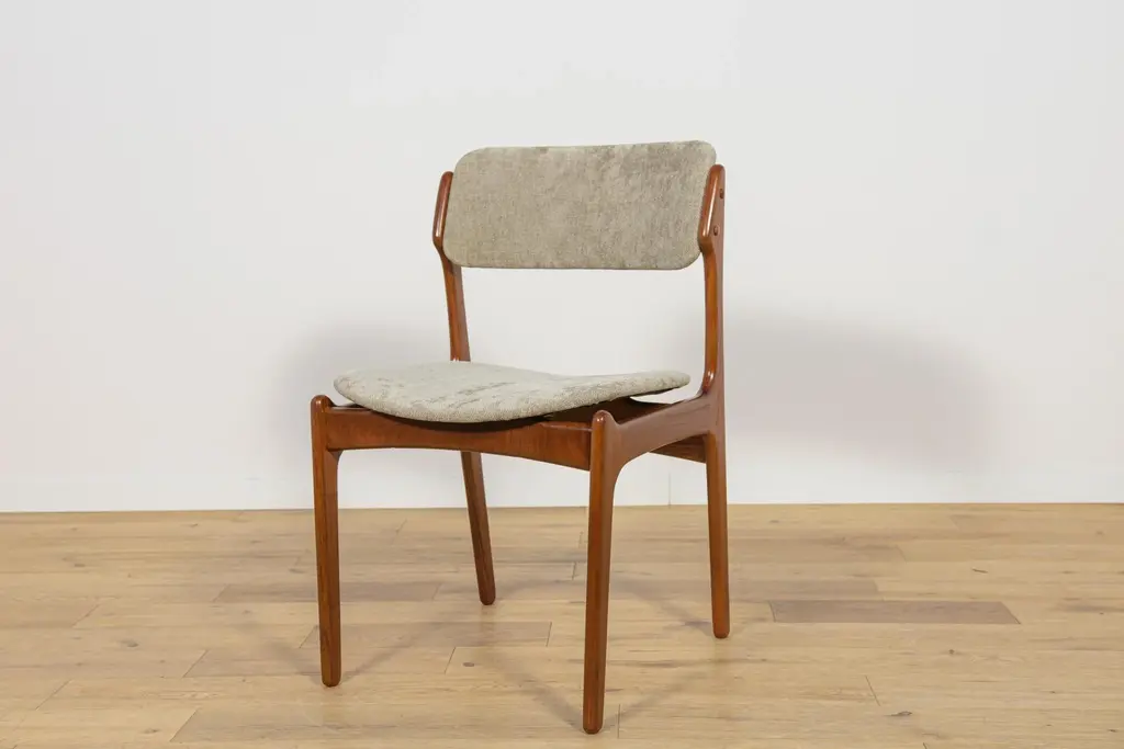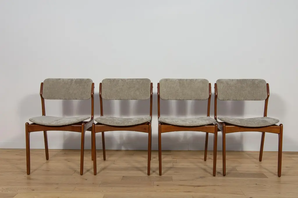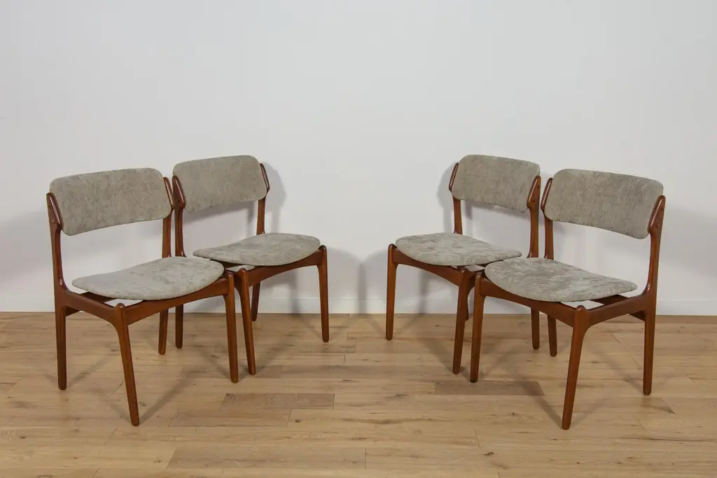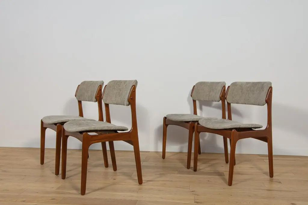 This set of four dining room chairs model 49 in teak was designed by Erik Buch and made by Odense Mobelfabrik in the 1960s. Chairs after a comprehensive carpentry and upholstery renovation. The upholstery interior has been replaced and covered with grey fabric. The teak frame has been cleaned from the old surface and finished with quality Danish oil. I have official proof of authenticity such as vintage catalogs, designer records, or other literature sources and take full responsibility for any authenticity issues arising from misattribution