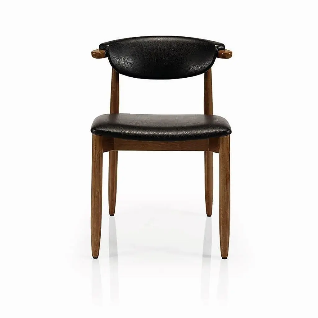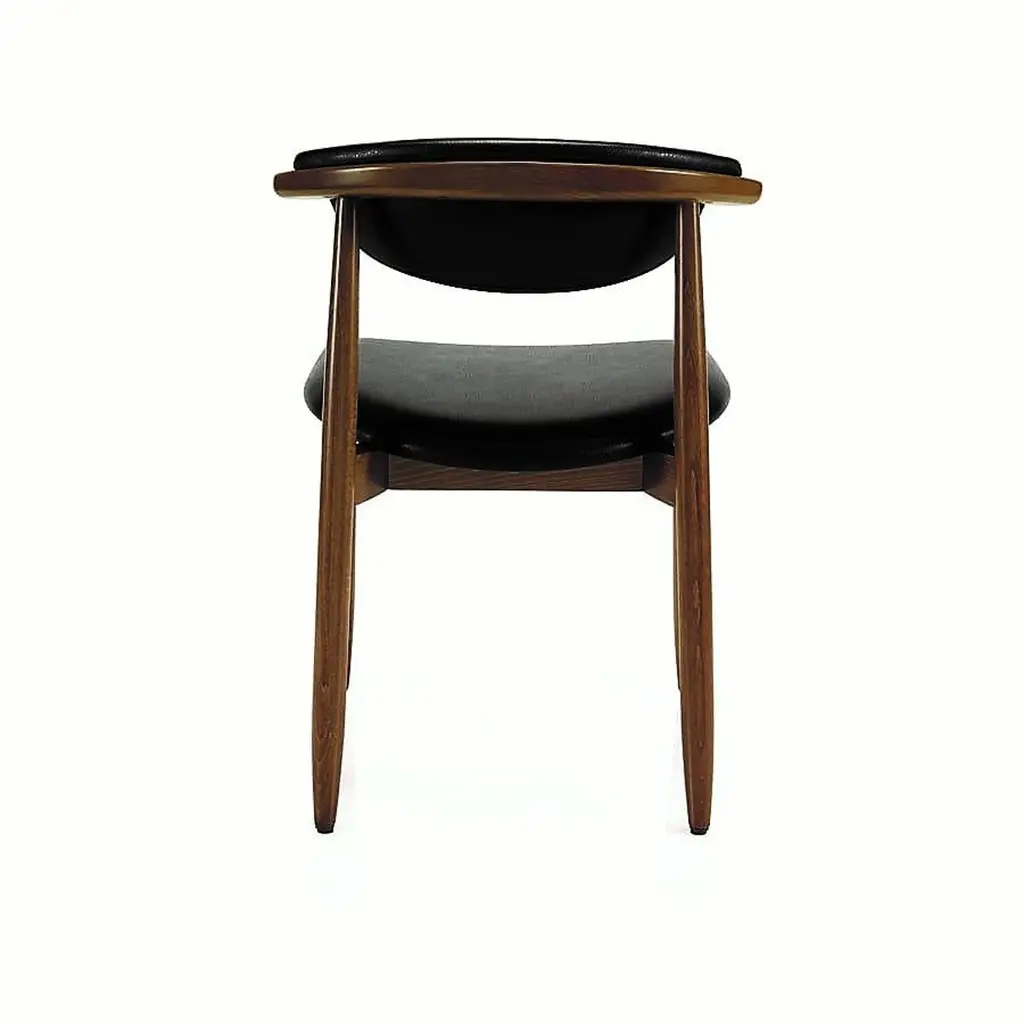 Mid-Century Modern curved back dining chairs upholstered in black faux leather. Crafted of solid heavy full grain hardwood with walnut finish.Perfect for either casual or formal dining room or kitchen. This chair is heavily constructed and suitable for contract use.100% European product.Contact us to enquire about COM/COL production, requirements and material shipping instructions.Please contact us if you have any questions about customization and pricing. We will be glad to check with the factory’s technical team if sizes, finishes, and colors can be customized. We do our best to expedite production and to ship and deliver product within the listed lead time, however current lead times might be longer due to global shipping backlog and delays. These delays are out of our control and cannot be a reason to cancel an order.