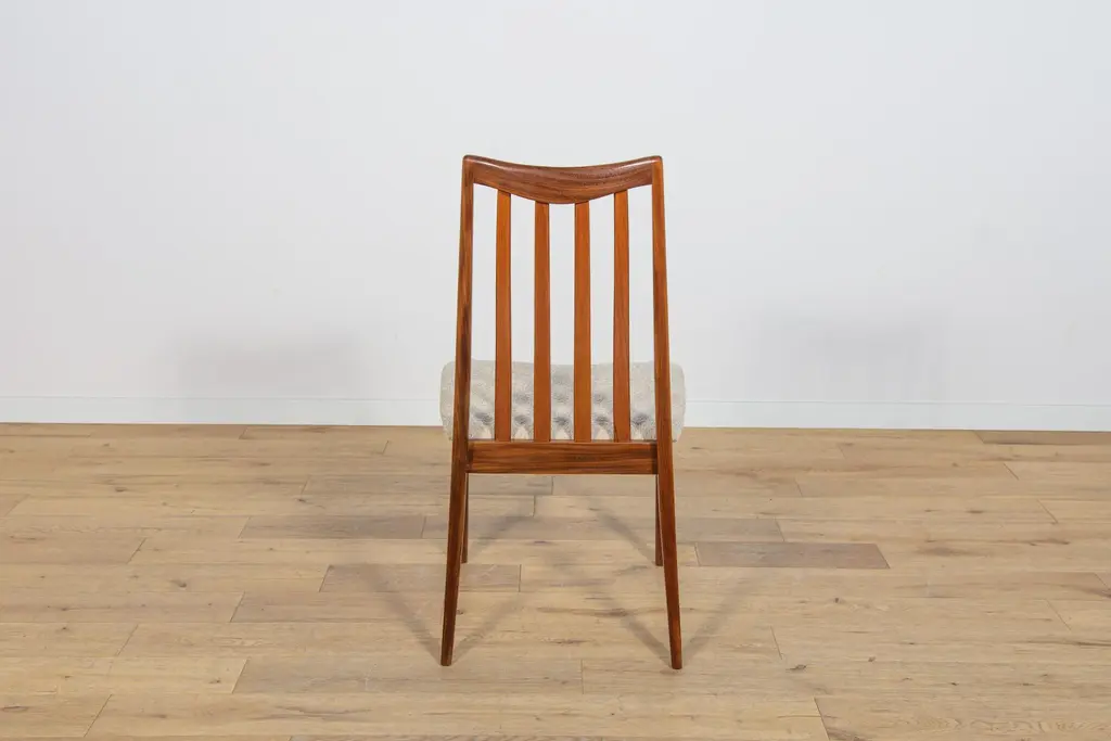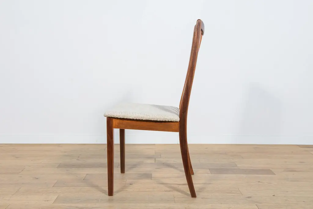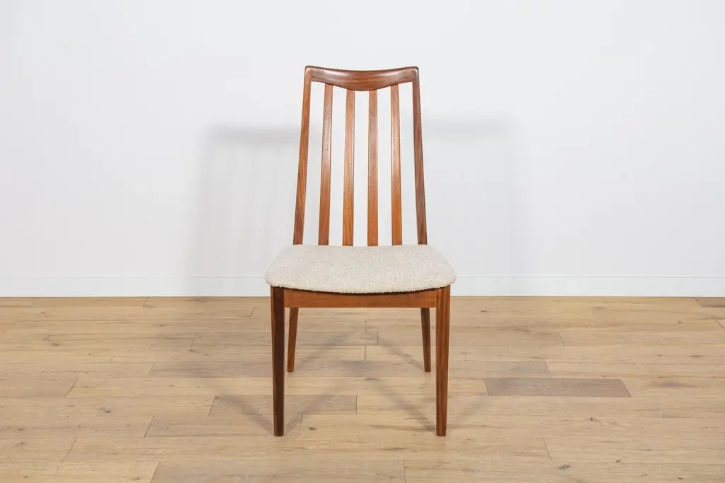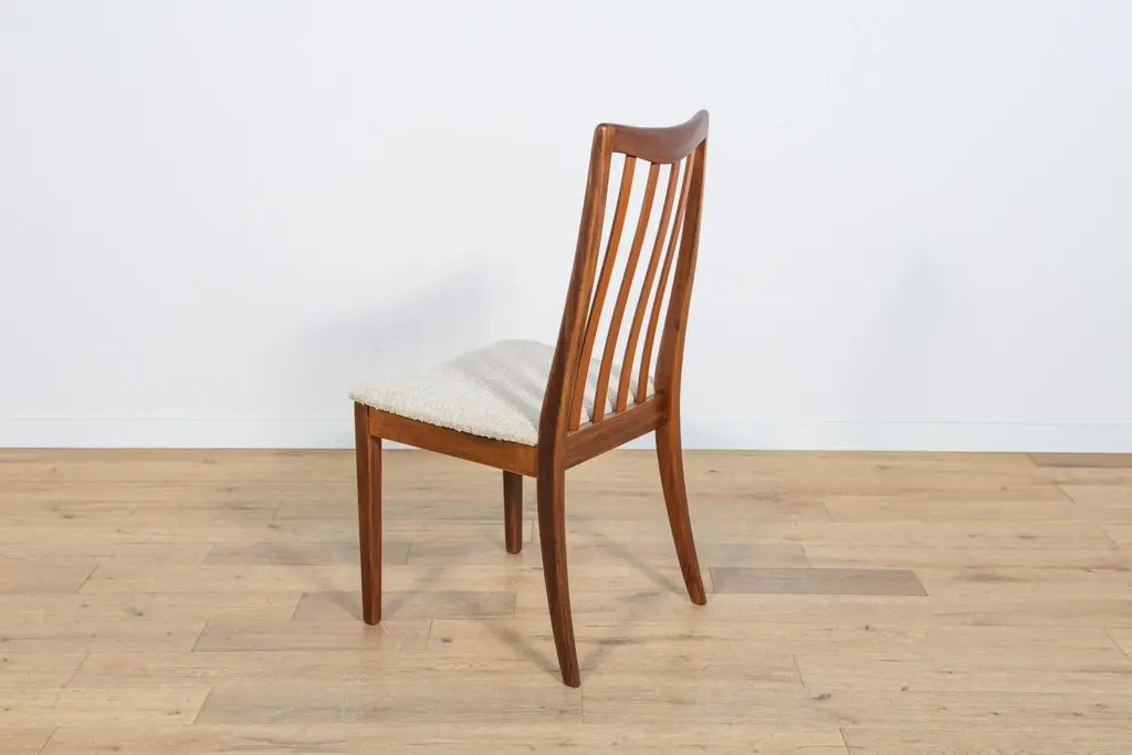 This set of four dining chairs was produced by G-Plan in the United Kingdom circa 1960. It was designed by Leslie Dandy. The frames are made of teak and the seats have been reupholstered with creame fabric typ boucle. The teak elements have been cleaned and finished with very quality Danish oil. I have official proof of authenticity such as vintage catalogs, designer records, or other literature sources and take full responsibility for any authenticity issues arising from misattribution
