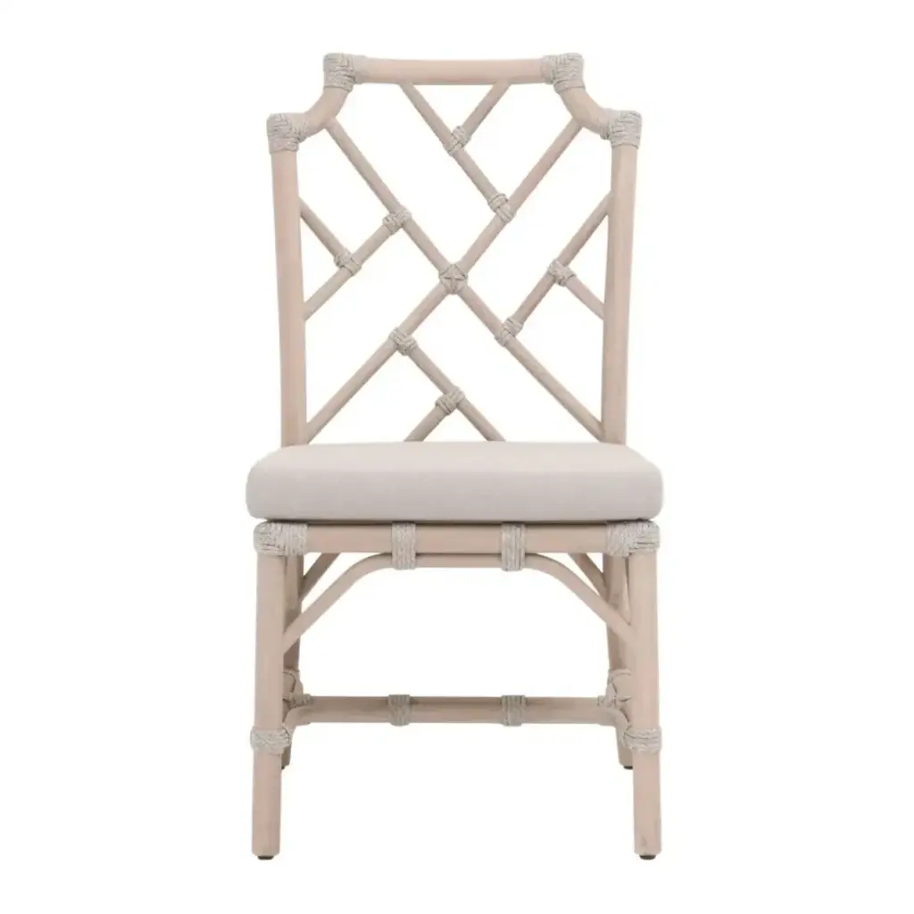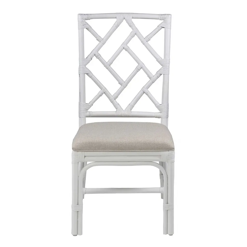 Handmade of renewable rattan, the Minerve upholstered dining chair centers a dynamic diamond pattern in its tall geometric back. Crafted by artisans in Indonesia, this lightweight seat features rounded straight legs with curved supports and T-shaped stretchers. Available in a choice of sophisticated neutral finishes with an easy-care cushion in taupe, this set of two side chairs refreshes modern and contemporary dining spaces.