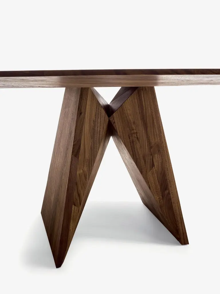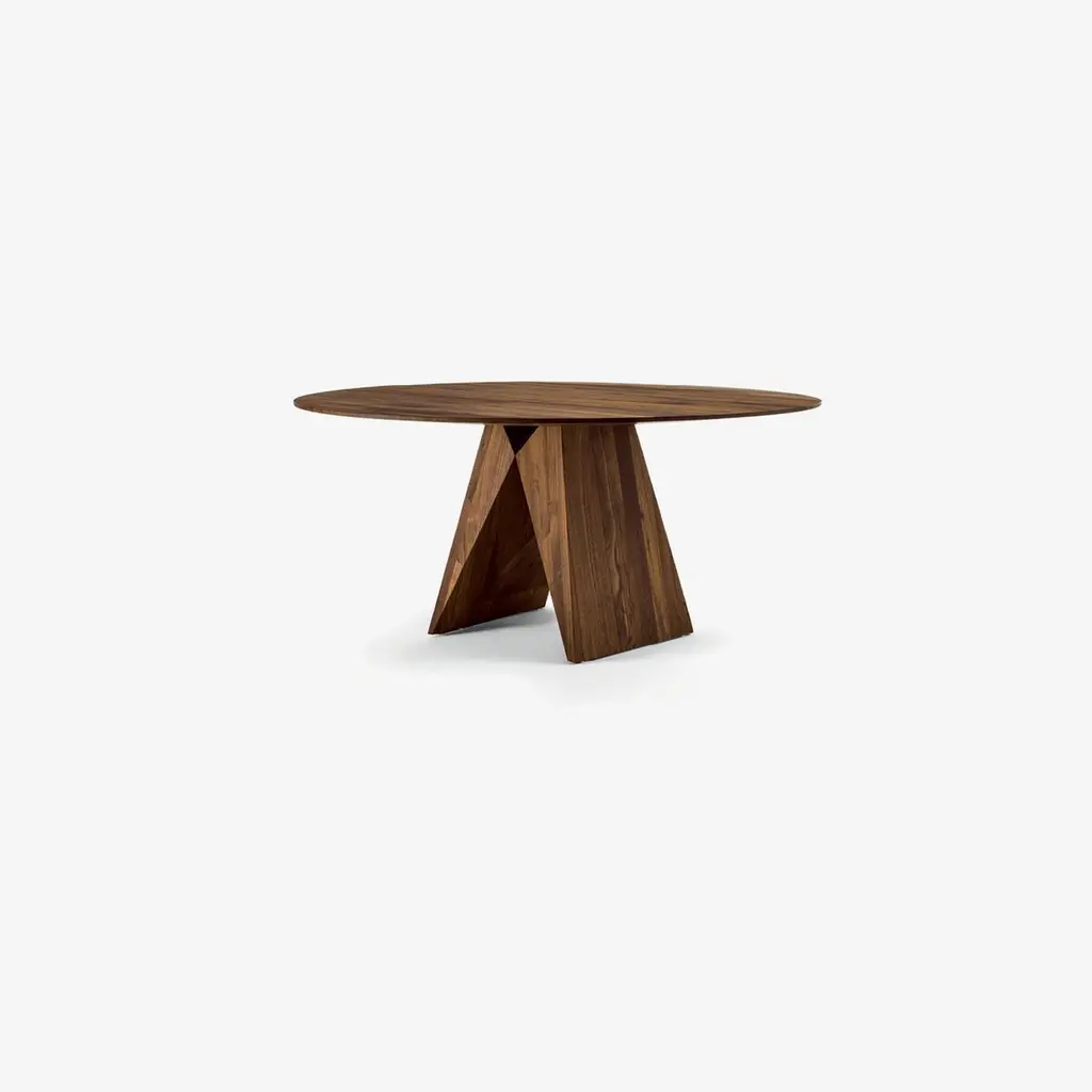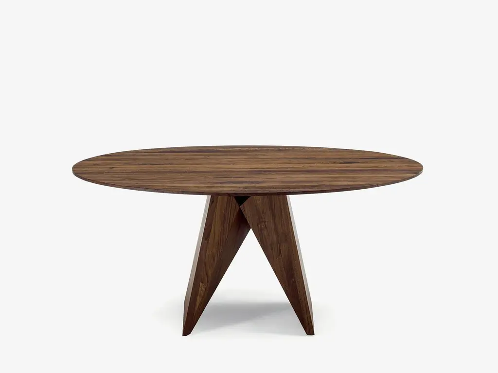Table made entirely in solid wood, characterized by a round top in glued lists and two big legs with a geometric shape.