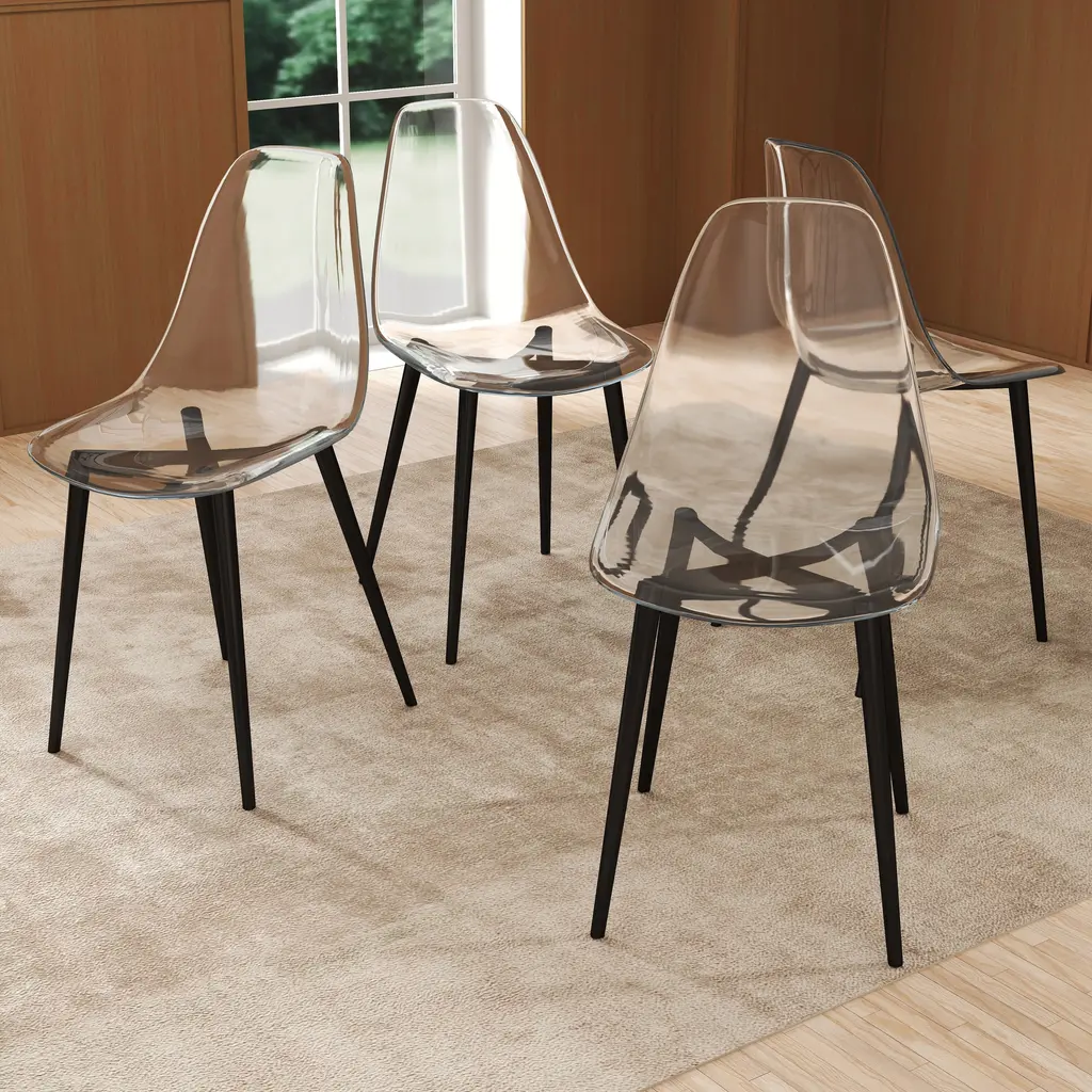 This 4-piece side chair set has a clear acrylic design that brings minimalist style and a resilient place to sit in your living room or dining area.Each chair is made from a blend of lucite and metal, and they're built on top of four thin legs with a shiny finish and floor protectors on the feet.These transparent chairs are water- and stain-resistant, so they stand up to tough spills and splashes.Plus, cleaning up these chairs is easy: All you need is a damp cloth.