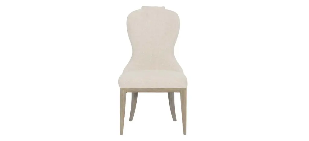 A true standout, the look of this bold dining chair will enchant everyone who sees it. Drawing inspiration from classic forms it features a tall, stately seat back that adds height and presence to any dining space. Fully upholstered and tailored to perfection, it also features tapered legs finished in a chic shade of Soft Silver Paint. This posh dining chair represents the perfect balance of style and substance.