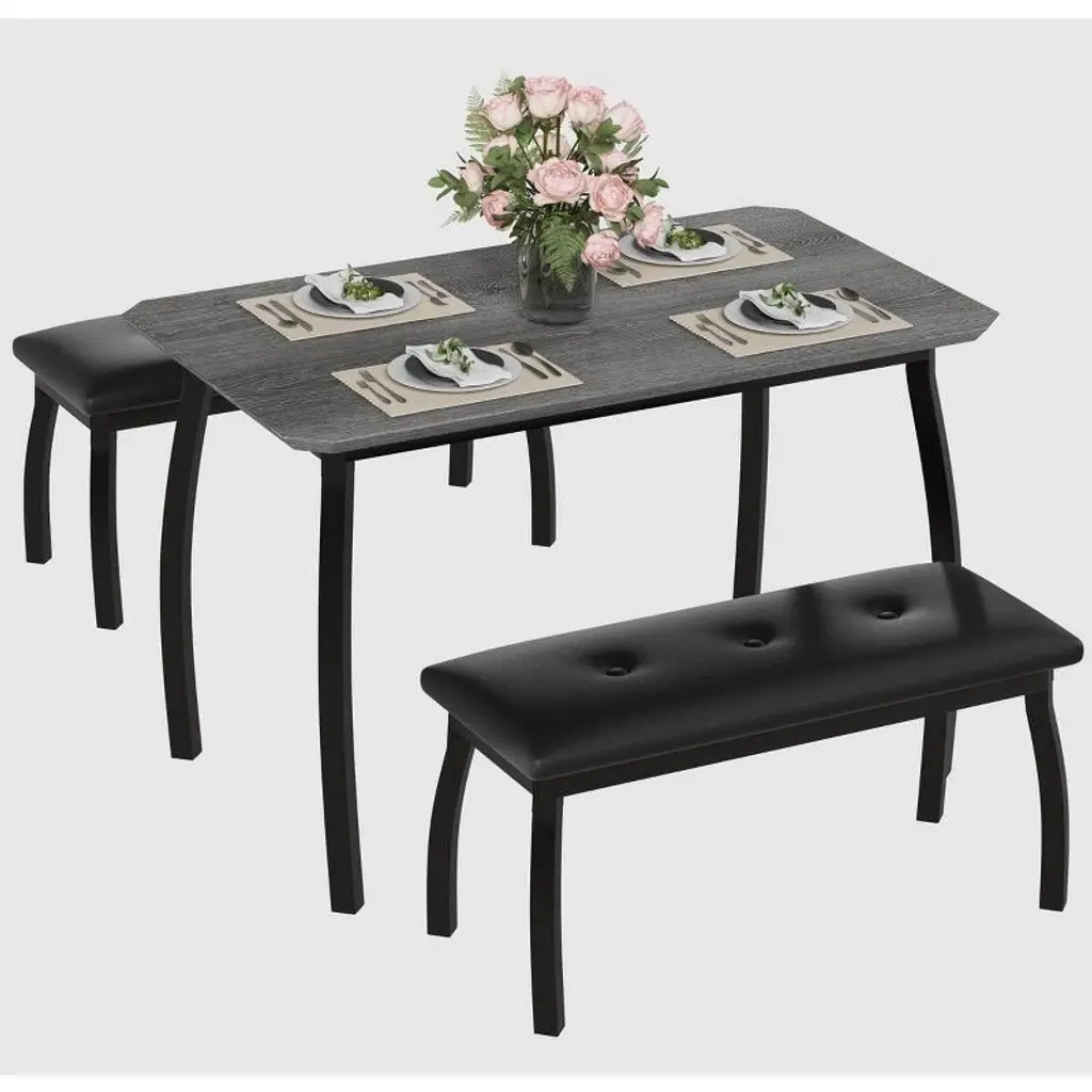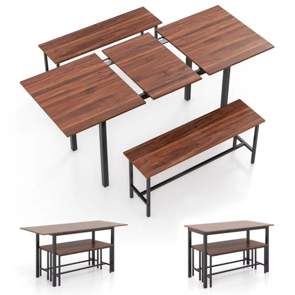 Extendable Table for Wide Usage: With smooth track mechanism, transforming the dining table from a cozy setting for 4 people to a spacious arrangement for 6 people is a breeze. Moreover, the medium board can be removed and stored under the table when not in use. Stable Metal Frame: Supported by powder-coated metal pipes, the 3 piece dining table set boasts excellent stability, with the table can hold up to 220 lbs and each bench can hold up to 660 lbs. Besides, the benches feature H-shaped structure, providing a robust foundation during meal time. Space-saving Design: The 2 benches included with the set can be conveniently tucked under the table when not in use, thus saving precious floor space and allows for seamless movement around the dining area. User-friendly Details: The dining room table set is equipped with non-slip pads, which ensure that your floors remain scratch-free, while adding stability during use. And the 4 corners of the table come with anti-collision protectors, which will reduce the possibilities of unwanted injuries. Modern Style and Easy Maintenance: With textured wood grain, the modern dinette set can effortlessly blend with various decor themes, creating an inviting and visually appealing addition to your living space. Besides, the wood grain veneer makes the tabletop easy to clean.
