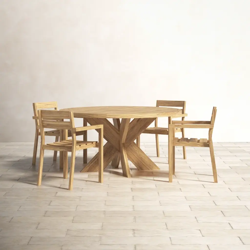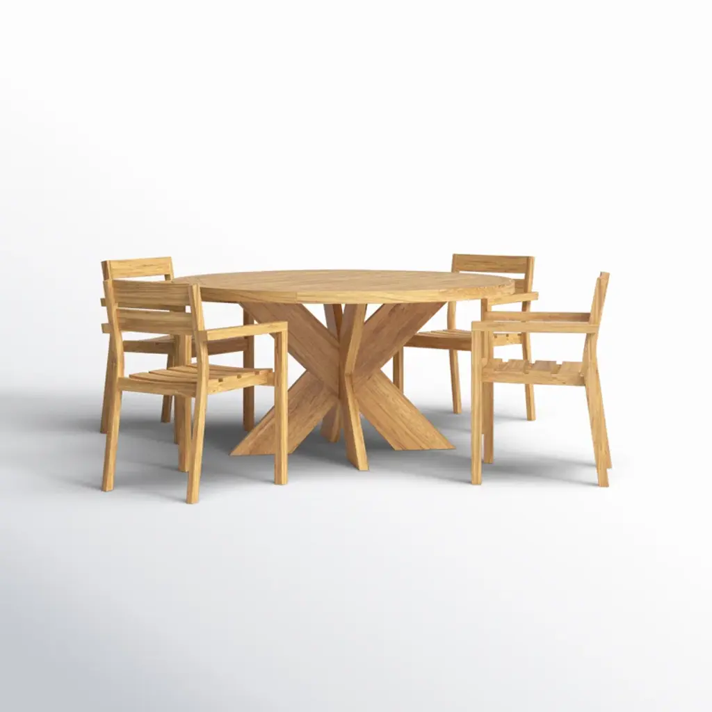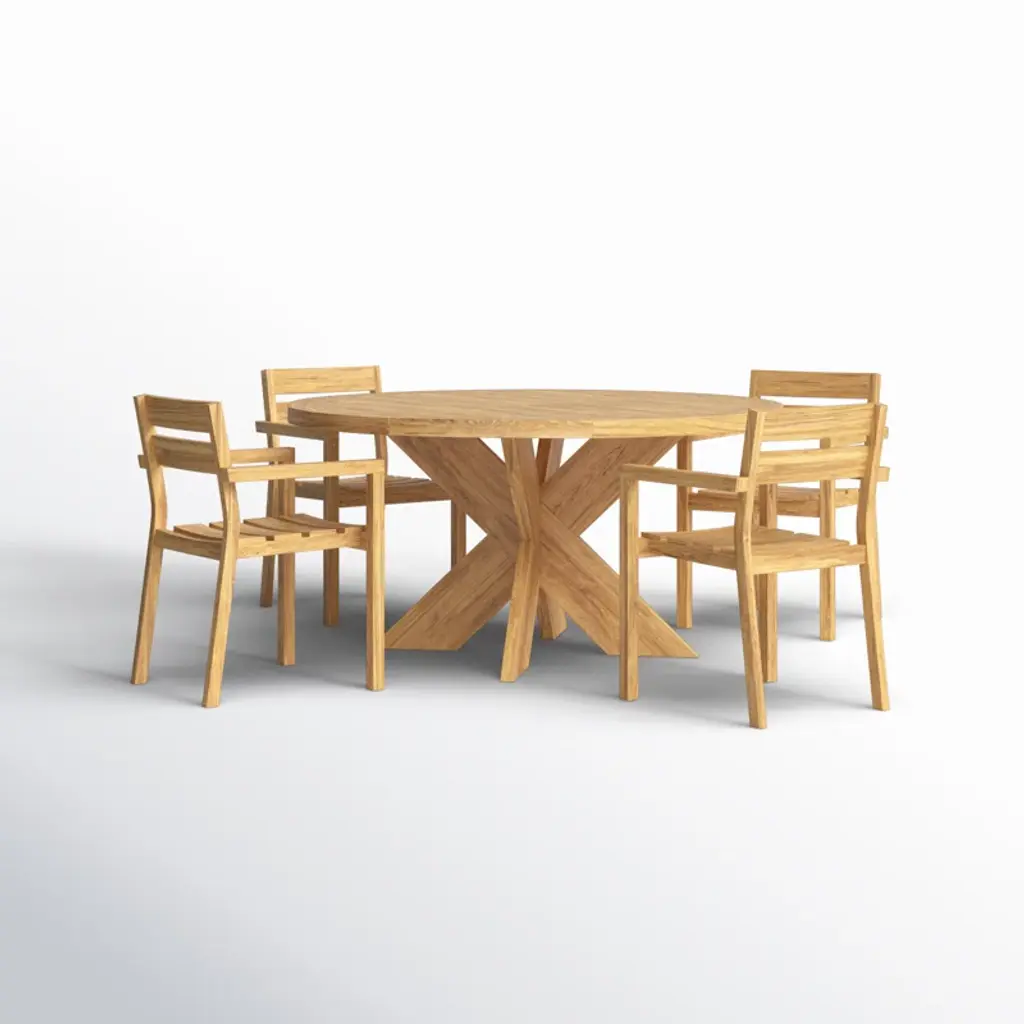 Gather around this 4-person indoor-outdoor dining set and enjoy a cozy meal with friends and family. This set is crafted from solid teak wood, featuring a round table and four stackable chairs, all with a weathered finish for a rustic touch. The natural wood grain and purposeful distressing make each piece truly unique. Designed for residential use, this dining set is weather, water, and UV resistant, ensuring it can handle the elements while maintaining its charm. Plus, leveling legs provide stability on uneven surfaces. Just add your favorite cushions for added comfort and style.