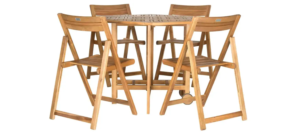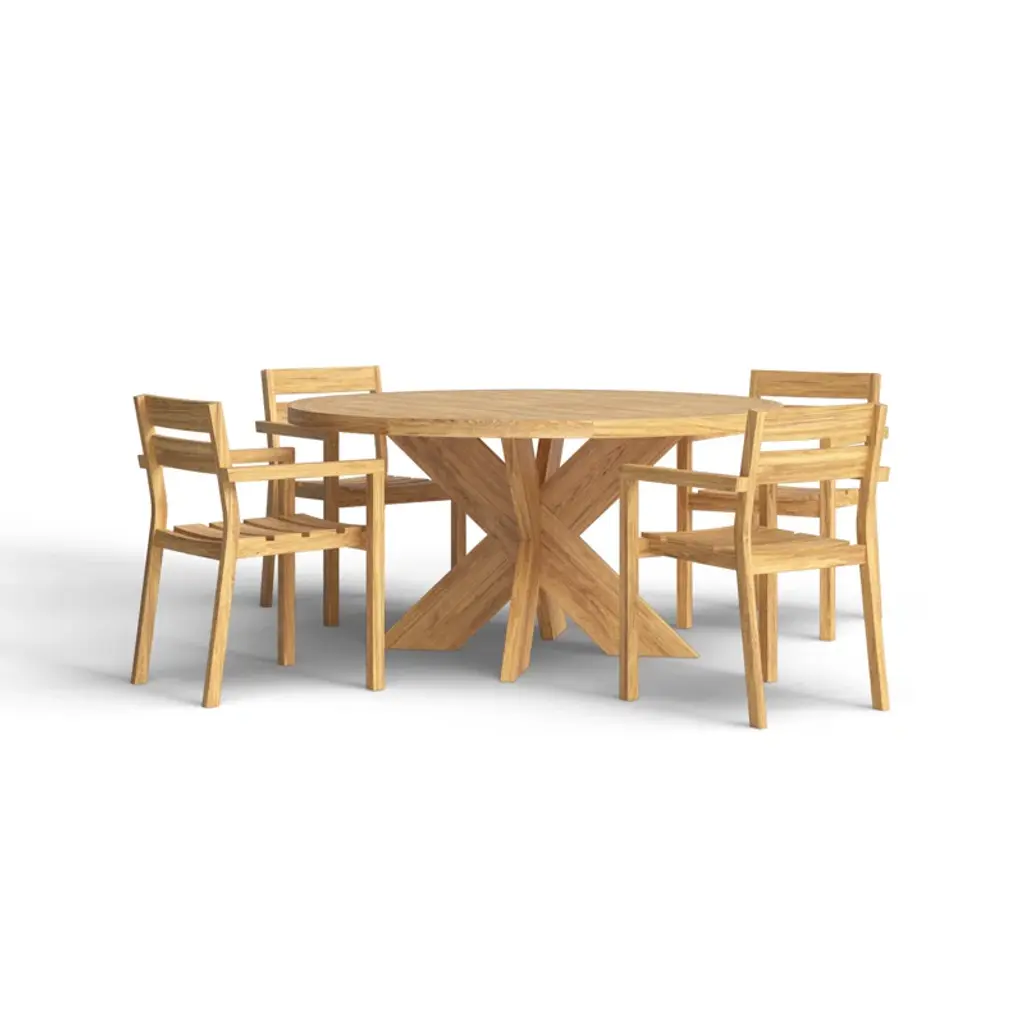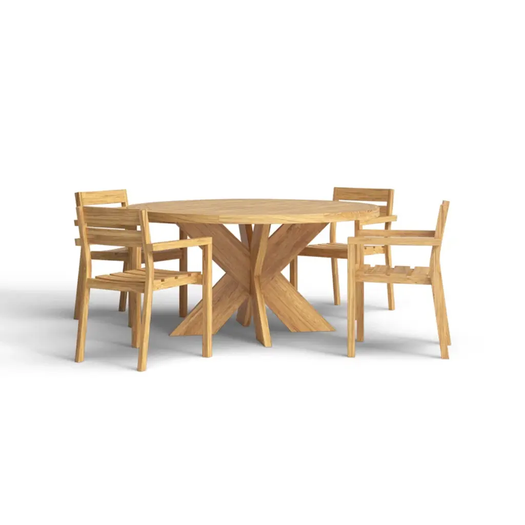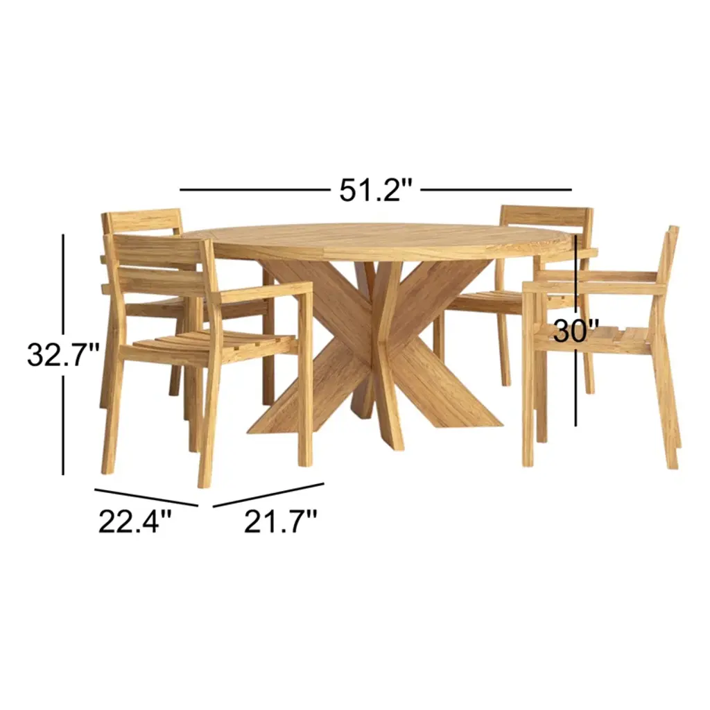 Gather around this 4-person indoor-outdoor dining set and enjoy a cozy meal with friends and family. This set is crafted from solid teak wood, featuring a round table and four stackable chairs, all with a weathered finish for a rustic touch. The natural wood grain and purposeful distressing make each piece truly unique. Designed for residential use, this dining set is weather, water, and UV resistant, ensuring it can handle the elements while maintaining its charm. Plus, leveling legs provide stability on uneven surfaces. Just add your favorite cushions for added comfort and style.