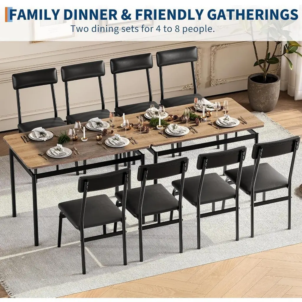 Elevate your dining experience with the Nasitip 5-Piece Industrial Dining Set! This modern set includes a 43.3" rectangular table (300 lb capacity) and 4 plush PU-upholstered chairs (150 lb capacity each), blending farmhouse charm with industrial durability. The metal-reinforced frame and waterproof MDF tabletop resist scratches and spills, while ergonomic backrests ensure comfort during meals. Perfect for small spaces, all chairs tuck neatly under the table when not in use. Easy to assemble and clean, this brown/black set (29.9"H) suits apartments, kitchens, or studios—ideal for everyday meals or entertaining guests!
