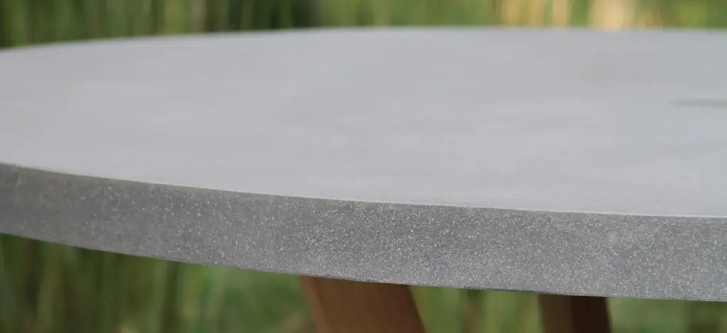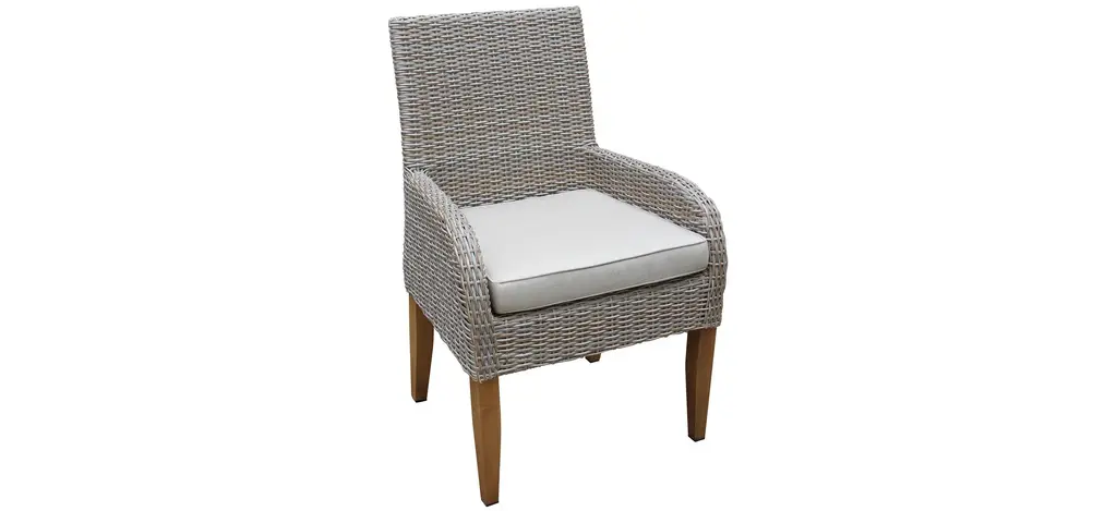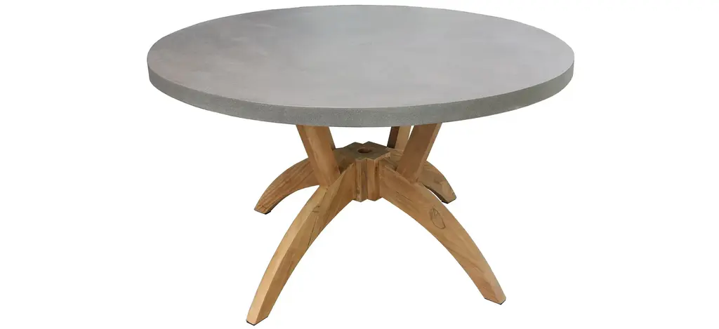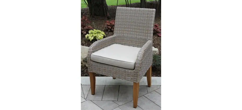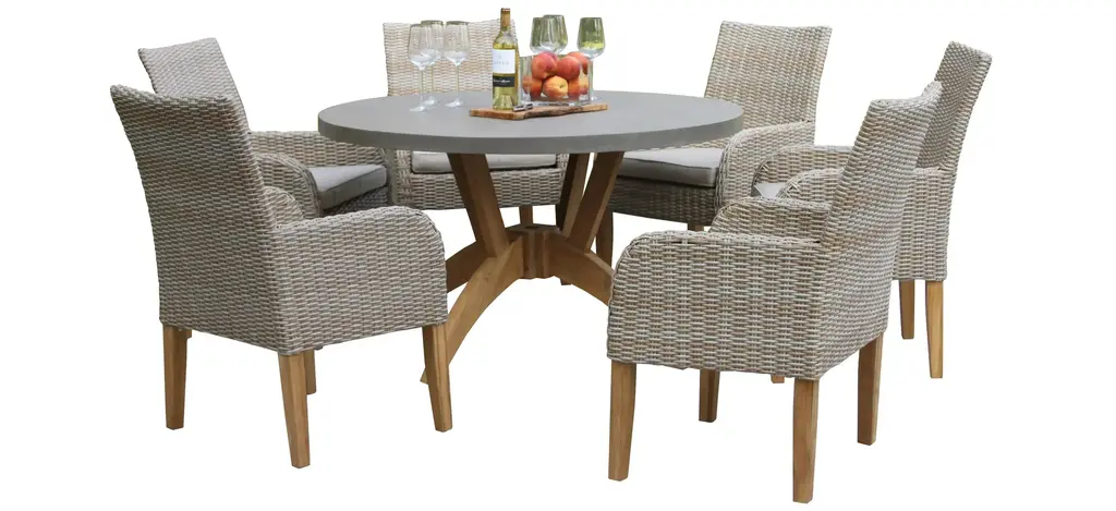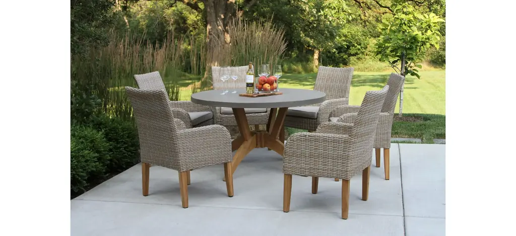 The Nautical 7-pc. teak and wicker outdoor dining set includes a poly concrete composite round tabletop with a beautiful solid teak nautical base and 6 ash gray-toned all-weather wicker and teak dining chairs with Sunbrella cushions.