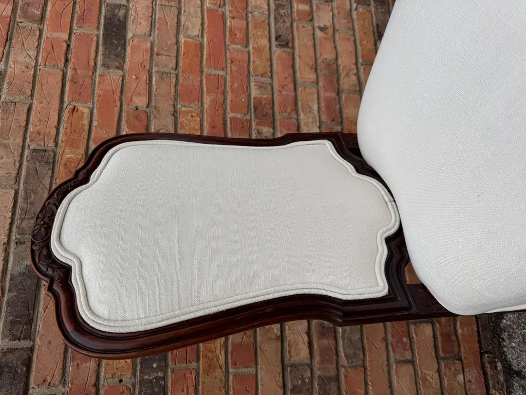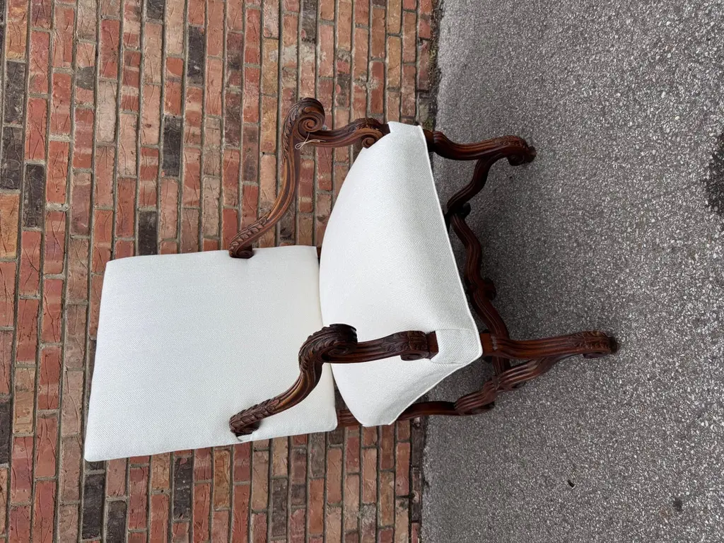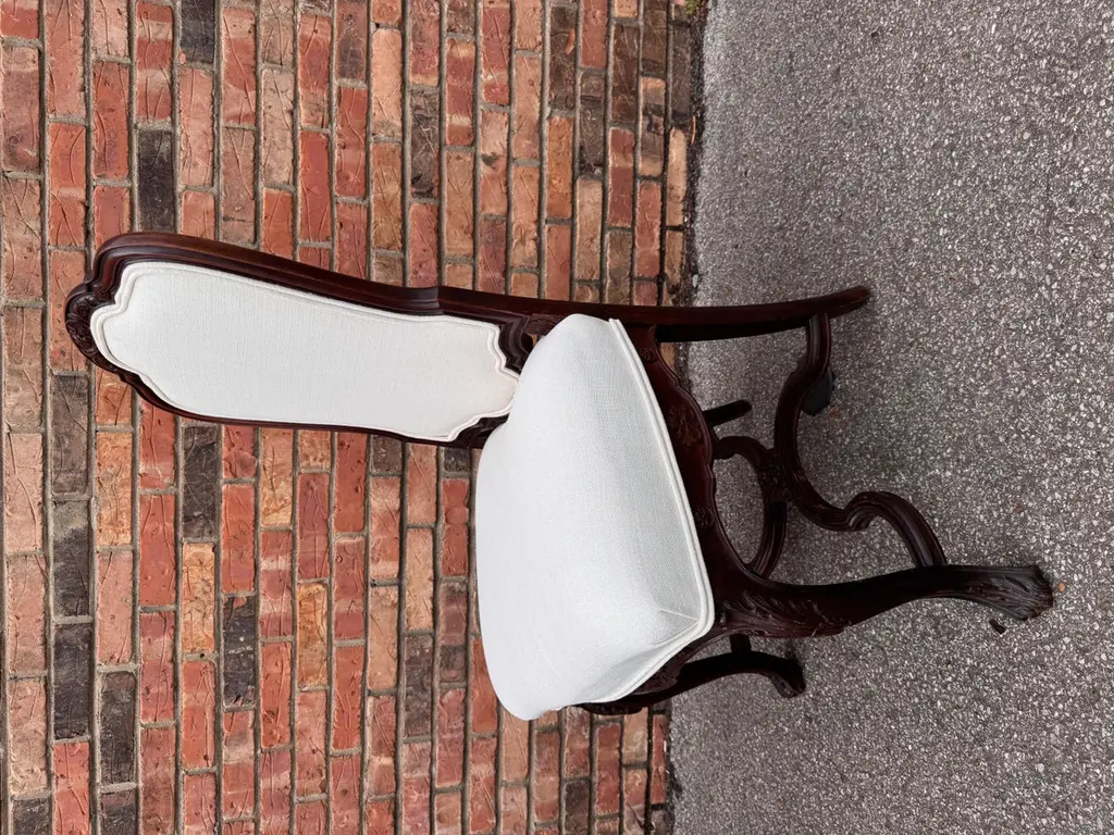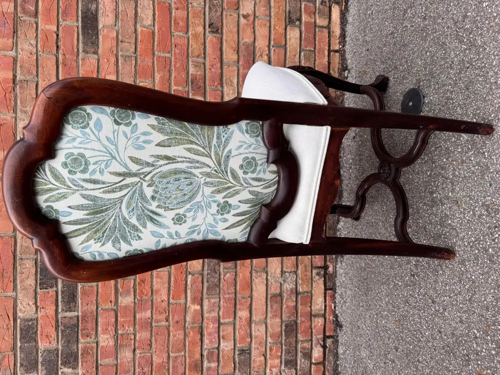 This is a lovely carved French chair reupholstered in lovely white fabric with contrasting back floral fabric. Perfect for adding some life and vibrance to many different dining settings! The floral design on the backs are especially attractive with cool botanical design in blues and greens. If you are looking to make this a dining set, we have six available!Dimensions22ʺW × 21ʺD × 42ʺH