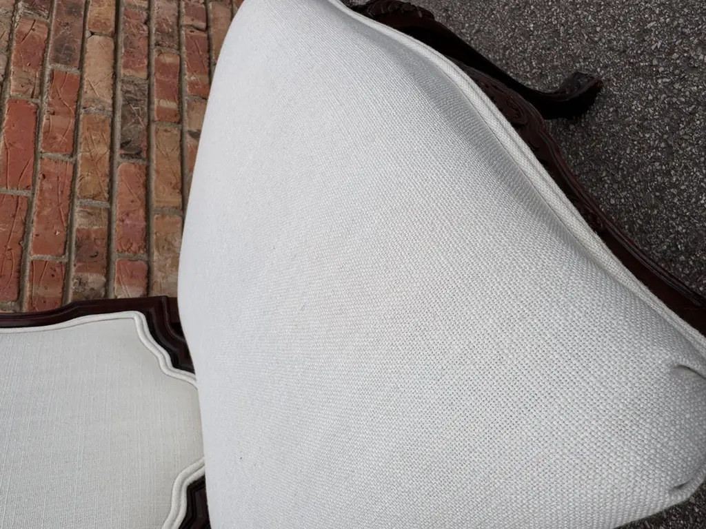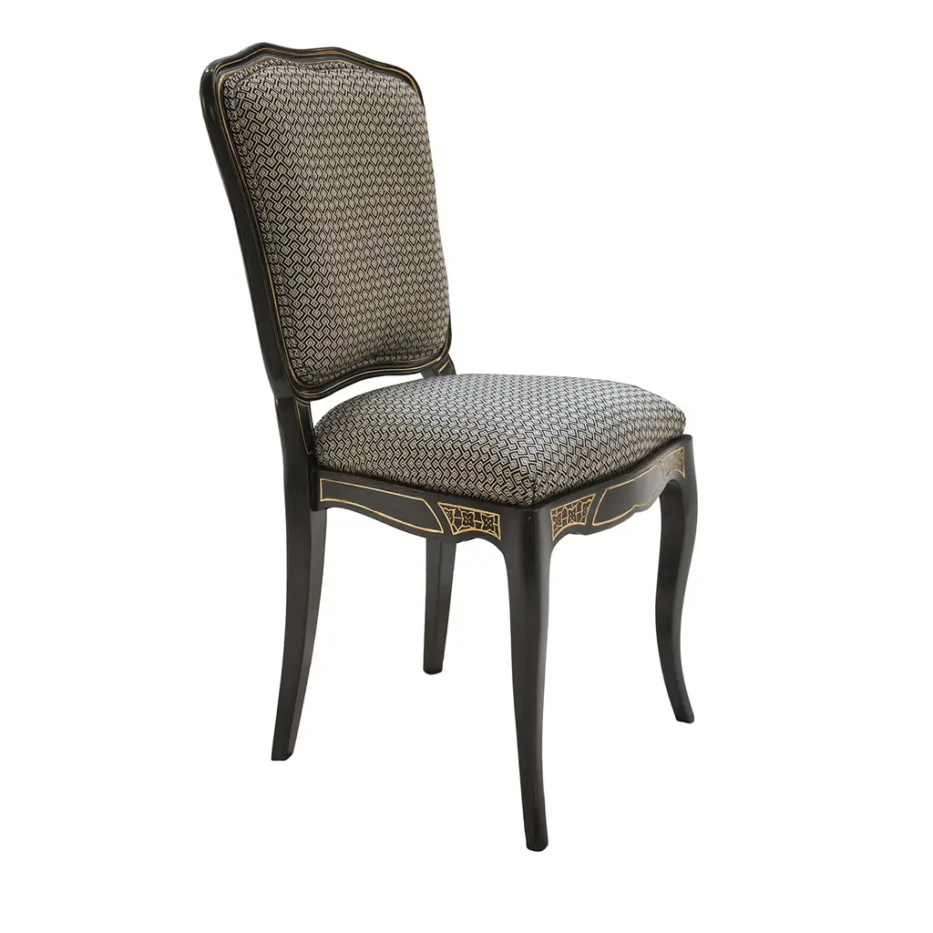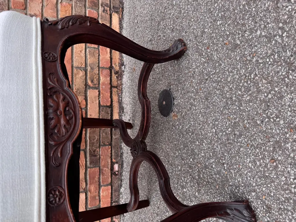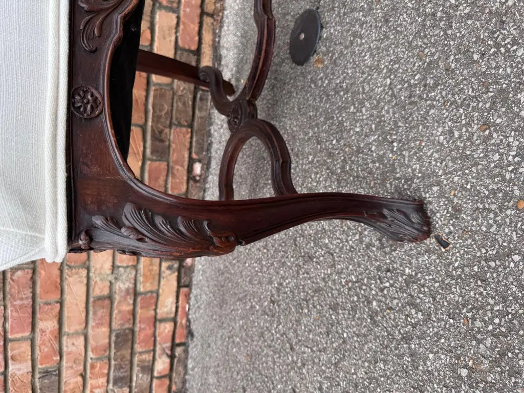 This is a lovely carved French chair reupholstered in lovely white fabric with contrasting back floral fabric. Perfect for adding some life and vibrance to many different dining settings! The floral design on the backs are especially attractive with cool botanical design in blues and greens. If you are looking to make this a dining set, we have six available!Dimensions22ʺW × 21ʺD × 42ʺH