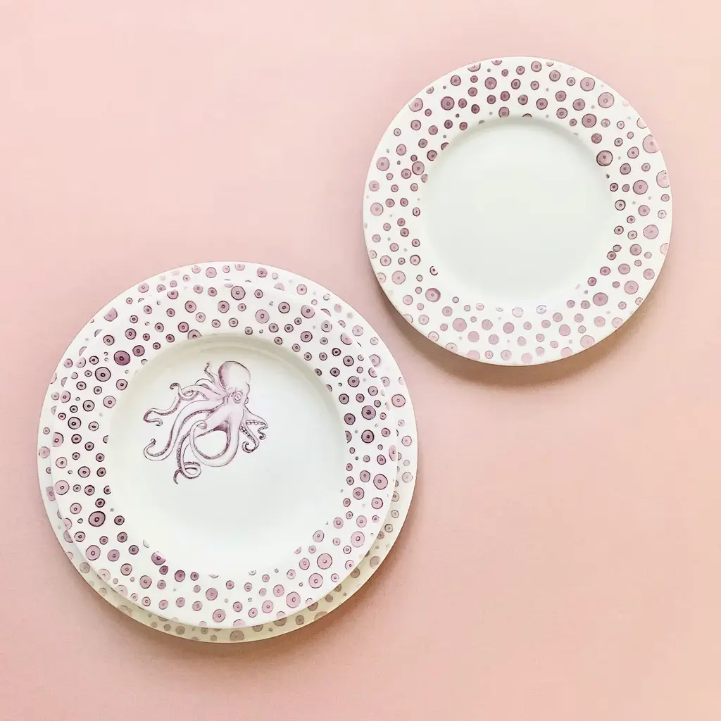The wonders of Sardinian underwater wildlife inspired Elena Satta the sophisticated design of this ceramic dining set. Part of a dinner set inspired by octopuses and also including a soup and a dinner plate, it boasts a singular motif of octopus suckers minutely handpainted with a precious iron purple pigment all along the borders. Dishwasher safe, each piece is unique.