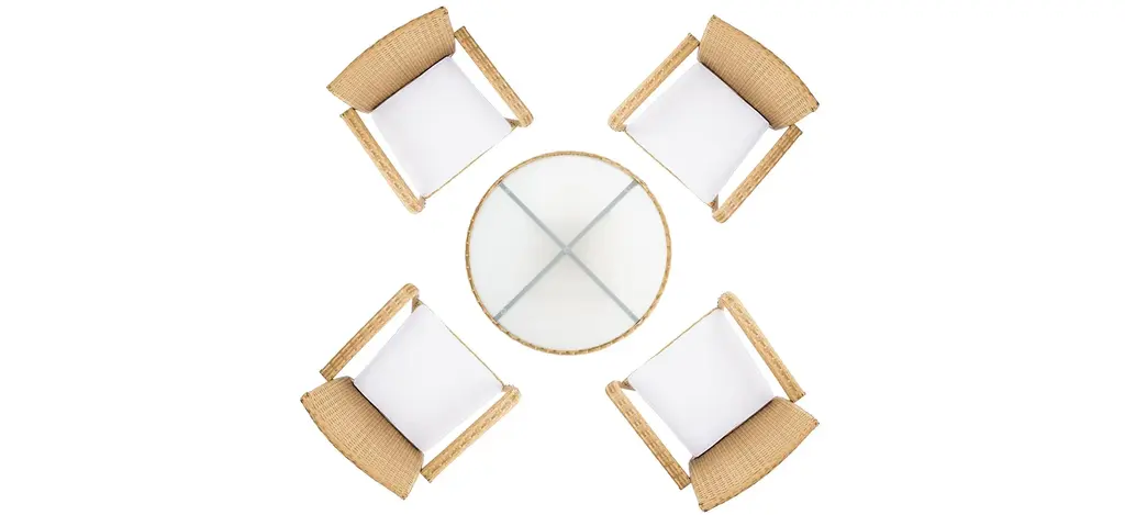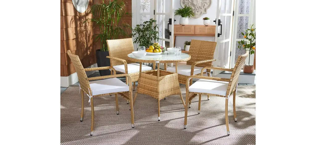 A modern take on French al fresco dining, al fresco dining, the Orian 5-pc. Outdoor Dining Set emanates class and charisma on any porch or patio. Wicker details update Orian's classically styled table and chairs, and soft cushions make for comfortable, restaurant quality dining.