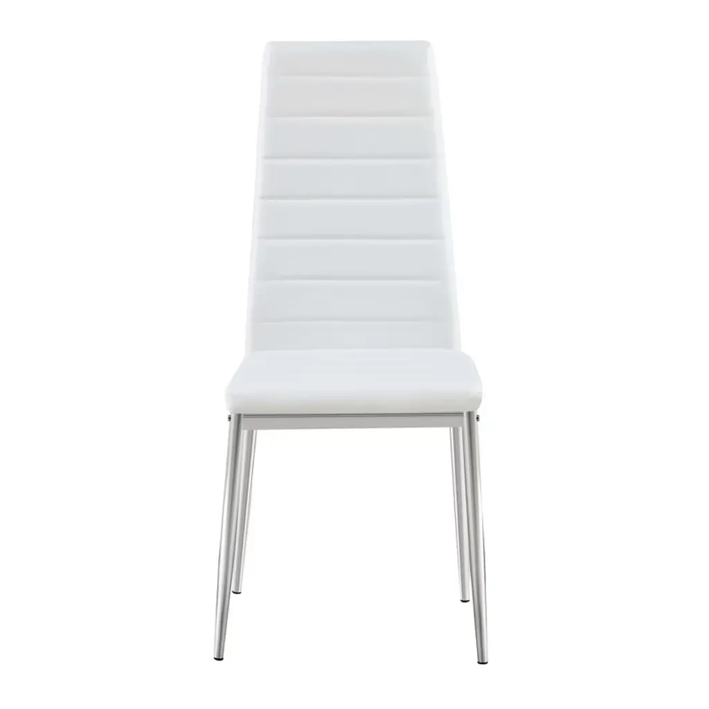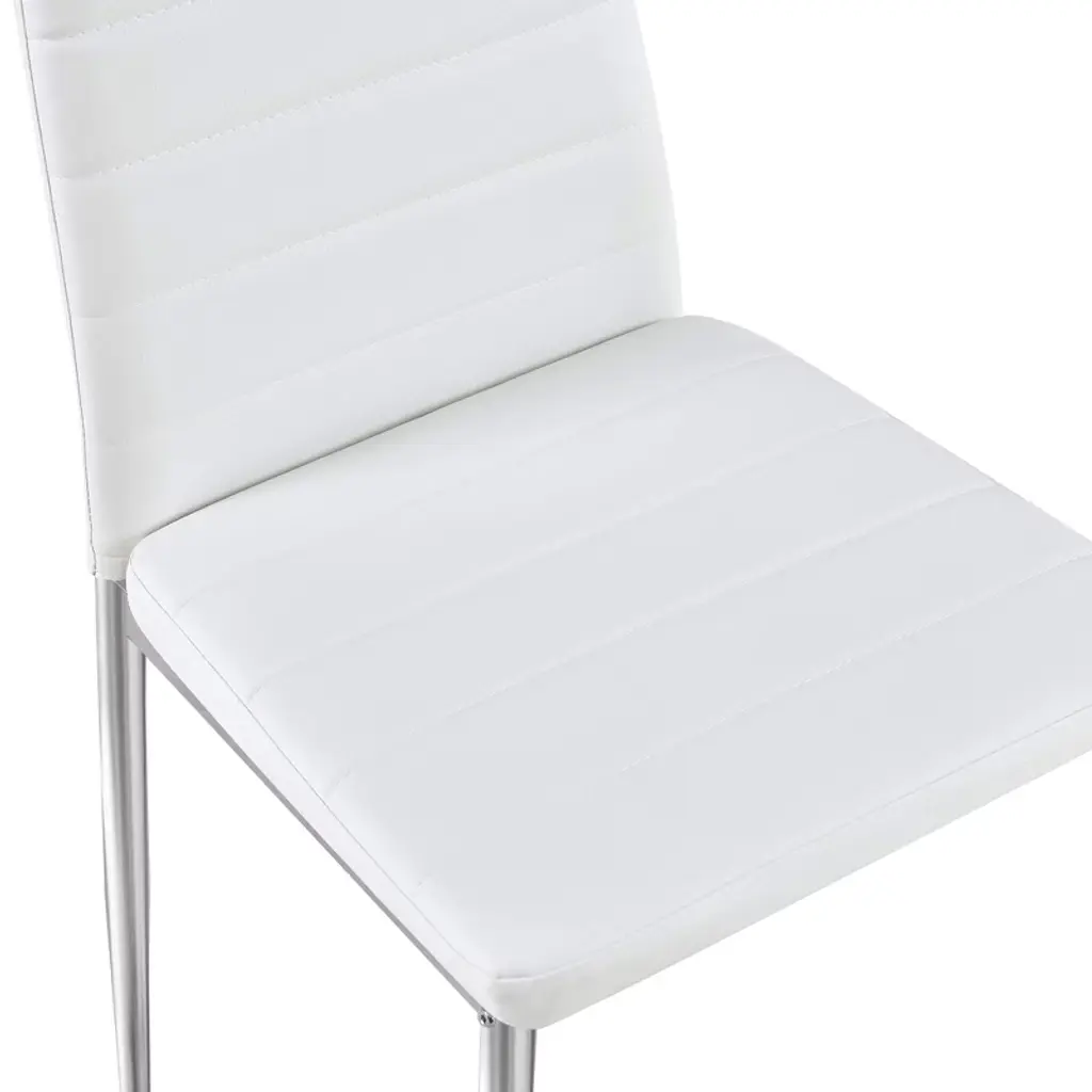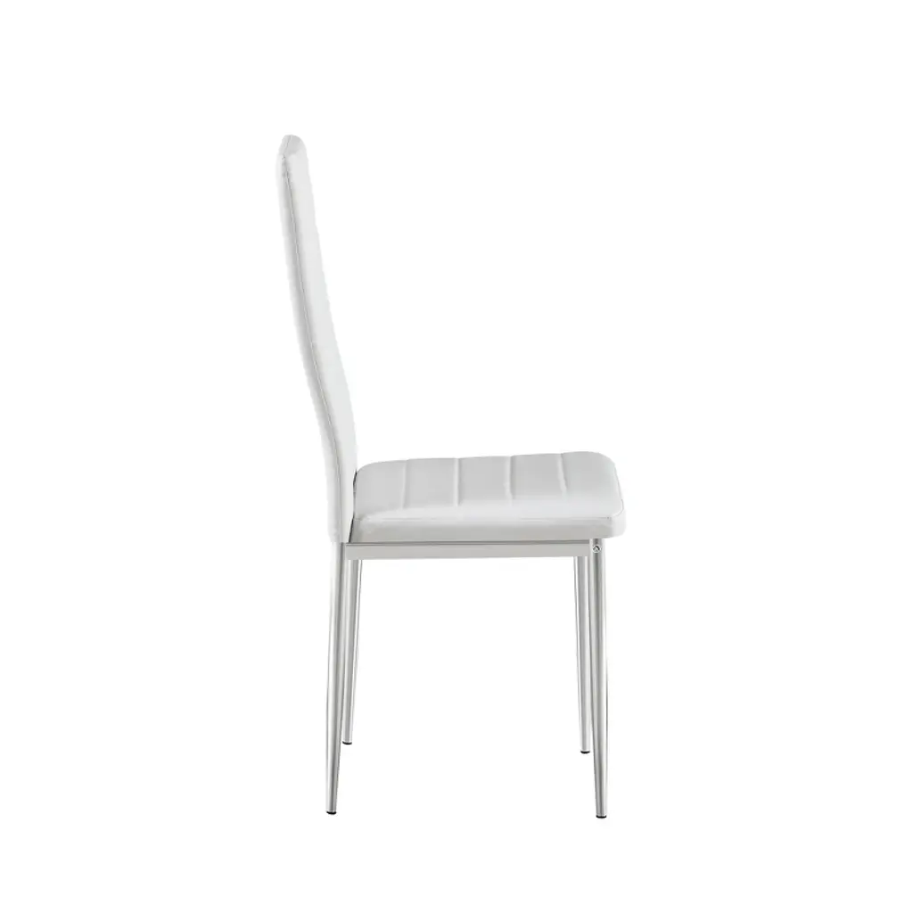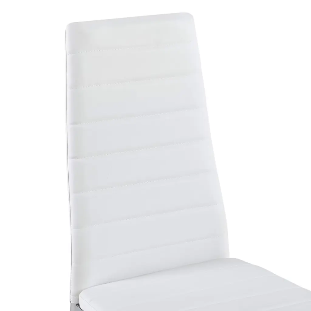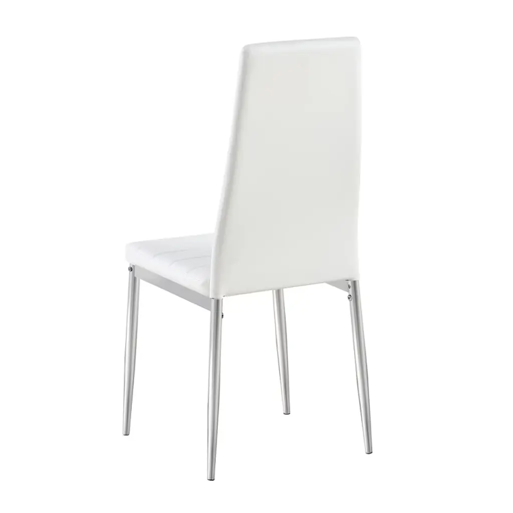 Transform your dining area into a contemporary haven with this stylish set of four modern dining chairs. Upholstered in soft, easy-to-clean PU leather, these chairs offer a luxurious seating experience while ensuring effortless maintenance. The sleek white color of the leather beautifully contrasts with the silver chrome-plated chair legs, creating a visually striking look that instantly elevates any dining space. The chrome legs not only add a touch of sophistication but also provide robust stability and durability, supporting long-term use. Designed to seamlessly blend comfort and style, this chair set is perfect for both everyday meals and special gatherings, making it an essential addition to modern homes. Upgrade your dining setup with this elegant and functional chair set today.