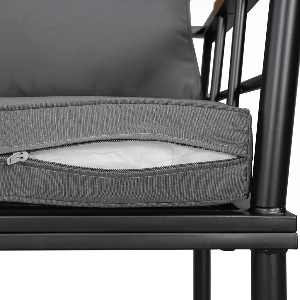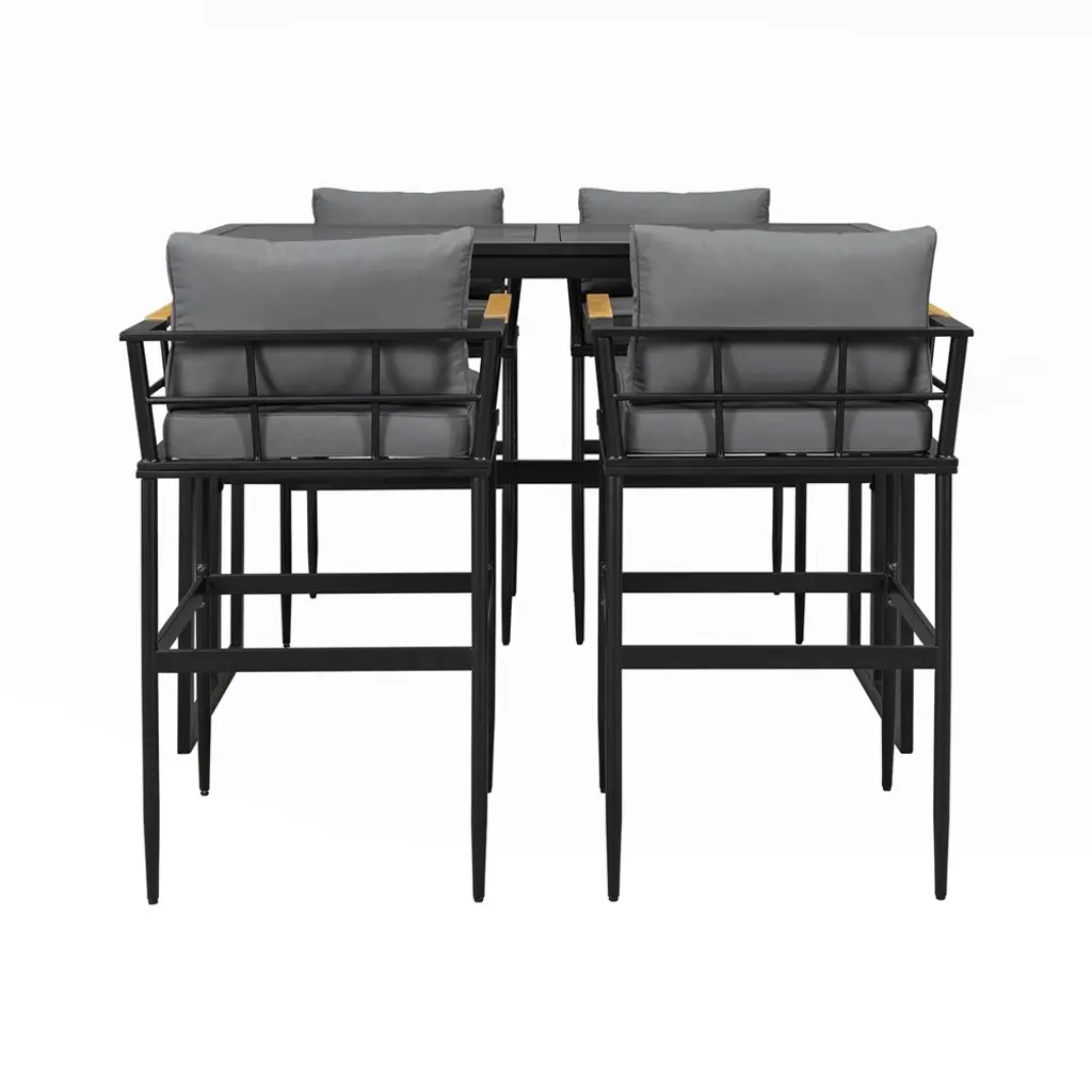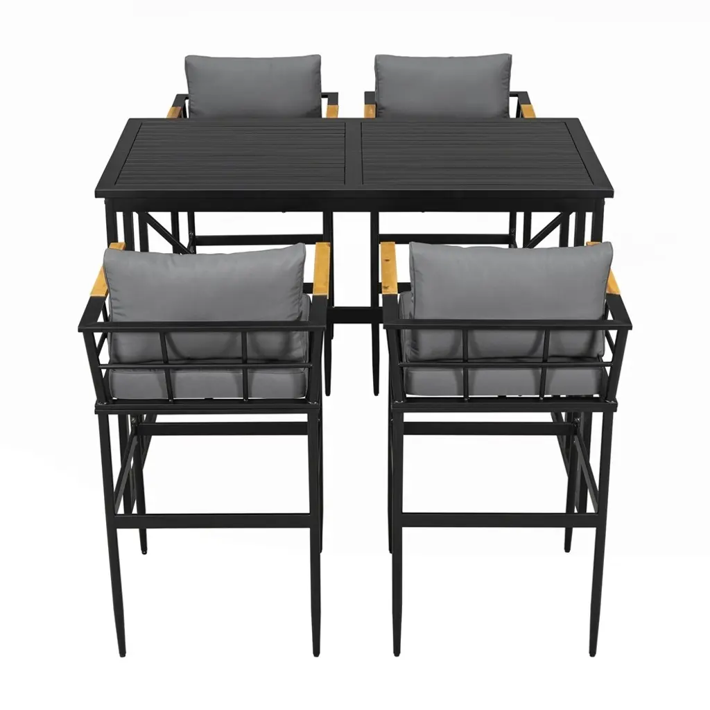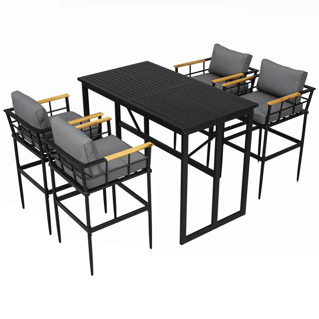 Product Features [Easy Assembly] The set comes with easy-to-follow instructions and necessary hardware for quick assembly, so you can start enjoying your outdoor dining experience in no time. [Ergonomic Support Design, All-Day Comfort]: Each chair is equipped with thickened high-density foam cushions and contoured backrests. Whether hosting barbecues, enjoying afternoon tea, or working outdoors, the cloud-like comfort ensures every moment becomes a relaxing retreat. [Classic Material Combination]: The outdoor dining set features a sturdy iron frame paired with natural acacia wood armrests, blending modern aesthetics with natural charm. Its design effortlessly infuses an elegant touch into gardens, patios, or terraces, making it a striking focal point for any outdoor space. [Versatile Combo for Diverse Settings]: Perfectly adaptable to patios, gardens, villa courtyards, and beyond, this dining set seamlessly integrates into various outdoor environments. Its harmonious design enhances any setting, creating a cohesive and inviting atmosphere for gatherings or quiet moments alike.
