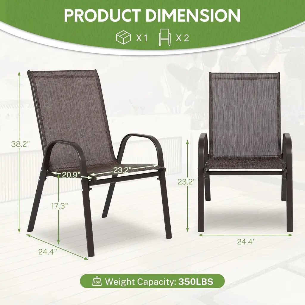 Exceptional Sturdiness and Stability in Construction Our meticulously crafted patio chair features a robust powder-coated steel frame, ensuring remarkable sturdiness and solidity. This high-quality construction not only enhances its durability but also significantly extends its lifespan, making it a reliable addition to your outdoor space for years to come. The seat is upholstered with top-grade fabric that is not only resilient but also designed to withstand the test of time, maintaining its integrity even with frequent use. Unparalleled Comfort for a Relaxing Seat Experience Indulge in the ultimate comfort with our outdoor chair, crafted from premium, breathable fabric. This innovative material ensures that you stay cool and comfortable, even on the hottest summer days, preventing any feelings of stuffiness or discomfort. The ergonomically designed curved armrests on both sides provide excellent support, effectively relieving pressure from your shoulders and arms, allowing you to unwind and relax completely. Whether you're enjoying a good book or simply soaking up the sun, this chair offers a luxurious seating experience like no other. Space-Saving Compact Design for Effortless Storage Designed with practicality in mind, our set of two armchairs features a compact size that maximizes space efficiency. This intelligent design allows you to easily store the chairs when not in use, making them ideal for smaller outdoor areas or for those who value space-saving solutions. Lightweight and Portable for Easy Mobility In addition to their space-saving design, the chairs are lightweight, making them incredibly easy to move around. Whether you want to rearrange your outdoor setup or transport them to a different location, you can do so with ease. With their combination of functionality and portability, these chairs offer the perfect balance of style and convenience.