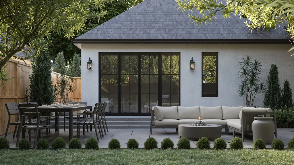 The architecture of our dining table starts with a 100% all natural OuterStone® top. With this innovation in durability, there’s no end to the backyard meals you’ll host. Seats 6-8 people.