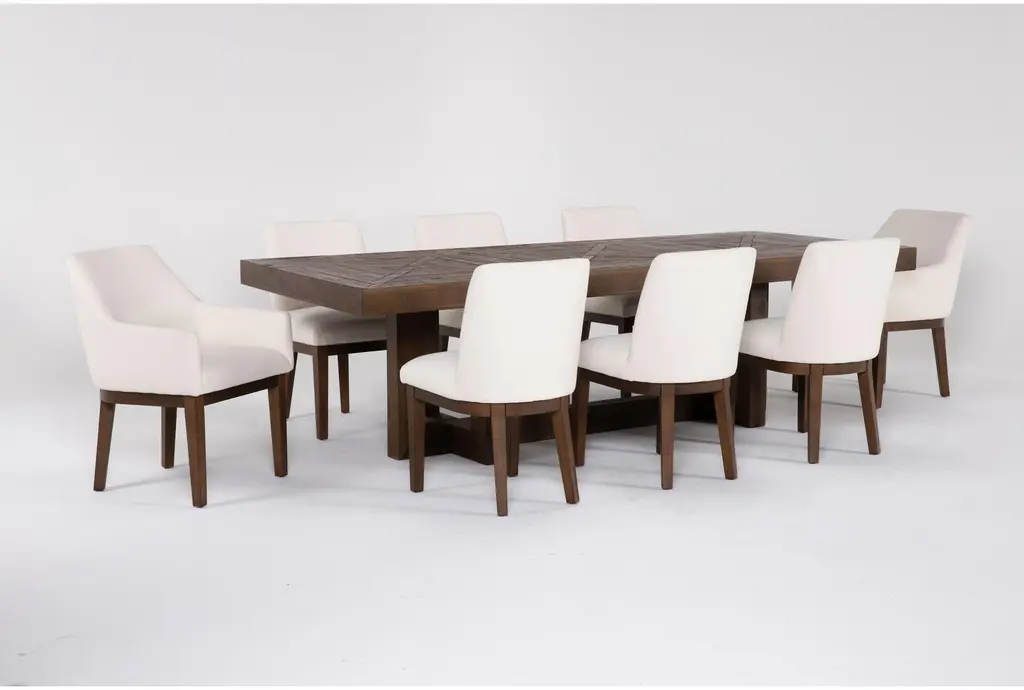 The Palazzo Brown Natural Rectangular Solid Pine Wood 106" Dining Table with Side and Armchair Set for 8 adds a touch of rustic charm to your dining area. This 7-piece set combines the warmth of solid pine wood with the durability of high-performance fabric upholstery on the chairs. Perfect for family gatherings and dinner parties, this large dining table set offers ample space and style.