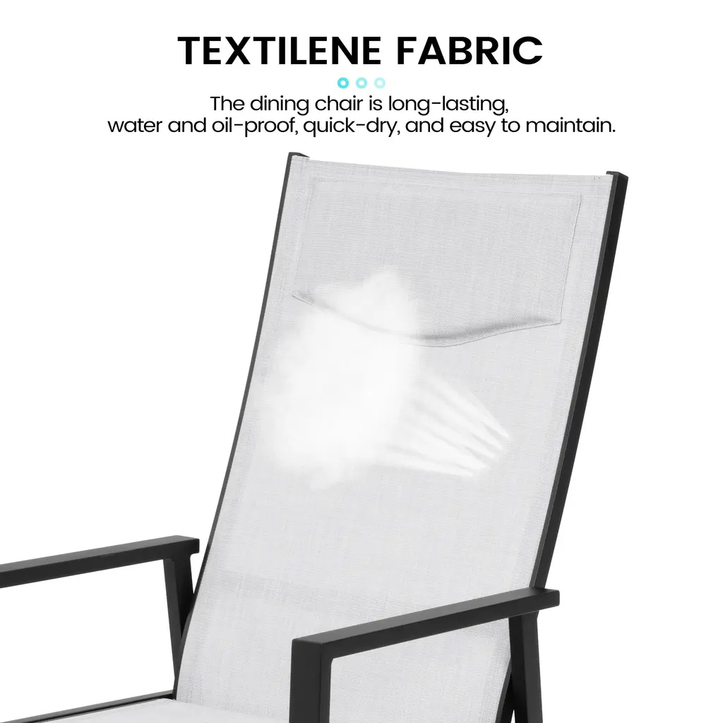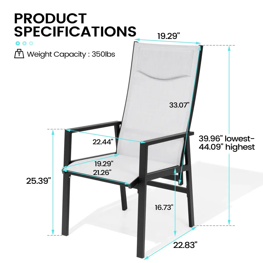 This portable patio dining chair set can meet your various needs. You can place it in the garden, backyard, poolside, beach or any other place you like. Thanks to the textilene seat design, you don't need any cushions. The backrest can be easily adjusted using the knob under the seat. This high back dining chair set with modern design will be a good addition to your leisure time.Feature:Specification:
