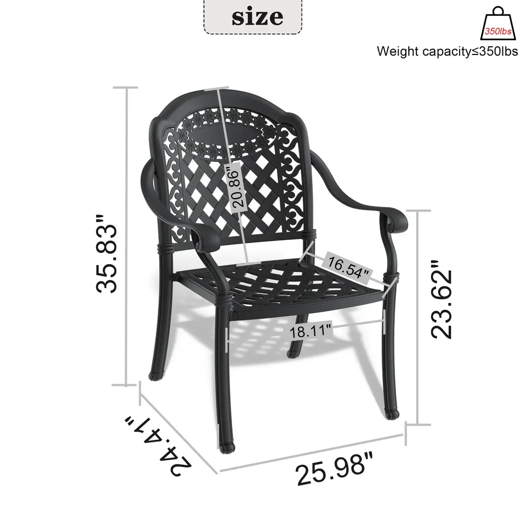 Product FeaturesDetails:Product Type: 4Pcs Cast Aluminum Patio Dining Chair Color: Black Outer Frame Material: Aluminum Weight Capacity: 350lbs Cushions Included: Yes Number of Cushions Included: 4 Cushion Dimensions 1.97'' H X 17.32'' D X 18.11'' W Product Dimensions& Weight 35.83'' H X 25.6'' W X 24.41'' D , 16.89lbs Package Dimensions& Weight 21.85'' H X 21.06'' W X 24.21'' D , 73.99lbs Assembly Required: Yes Additional Tools Required All tools included