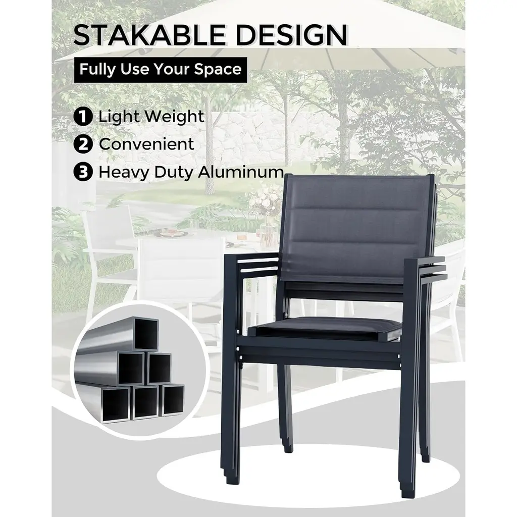 CHIC STYLE: Our outdoor patio chairs have a sleek and modern design that adds a touch of elegance to any outdoor setting and enhances the overall look of your patio or garden. SPACE-SAVING DESIGN: Stackable chairs are easy to store and conveniently free up space on your patio or deck when not in use, perfect for tight outdoor areas. DURABLE CONSTRUCTION: Our stackable patio chairs are made of high-quality rust-resistant aluminum, which can withstand all weather conditions and is suitable for year-round outdoor use. VERSATILE USE: Perfect for a variety of occasions, whether it's a backyard barbecue, a family gathering, or a quiet evening outdoors, our stackable patio chairs can easily accommodate all your seating needs. EASY INSTALLATION: Detailed instructions are included inside the box of this product and detailed numbering of each part for convenience and simplicity, enabling you to complete the installation with ease.