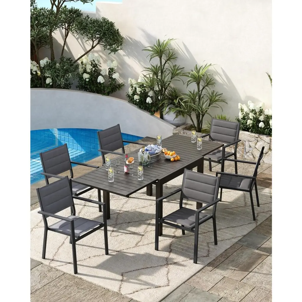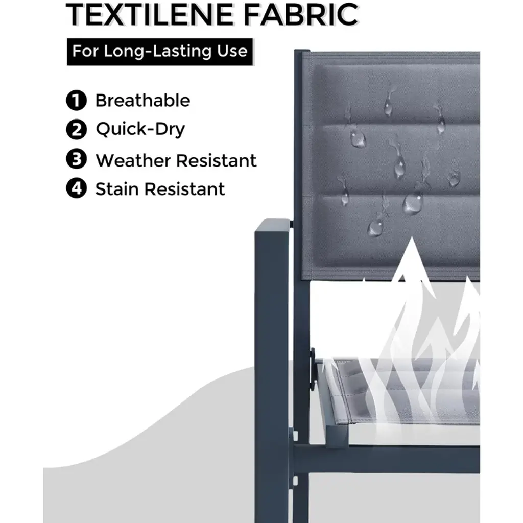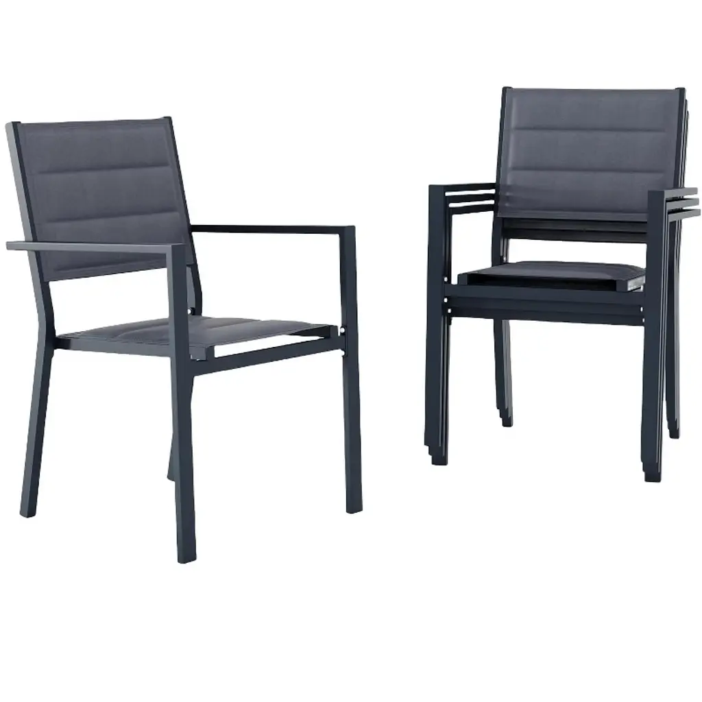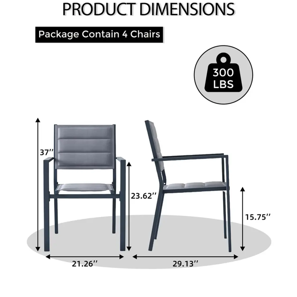 Enhance your outdoor living space with this Patio Stackable Chairs Set of 4, designed for comfort, durability, and style. Crafted with a high-quality aluminum alloy frame, these chairs offer excellent rust and weather resistance, making them perfect for patios, decks, backyards, or terraces. Despite their sturdy build, they remain lightweight and easy to move, supporting up to 300 pounds each for stable and reliable seating.Enjoy a more comfortable sitting experience with the widened seat and smooth armrest curves that conform to ergonomic principles. Whether you're relaxing in your garden, balcony, or outdoor dining area, these chairs provide the comfort you need for leisurely moments.Space-saving and convenient, these stackable chairs can be neatly stored when not in use, keeping your outdoor area tidy. Their breathable Textilene fabric seats offer superior ventilation and weather resistance. This wear-resistant, waterproof, and fade-resistant material ensures the chairs look great and feel comfortable season after season.Assembly is quick and easy with all necessary tools included. Measuring 22 inches deep, 20 inches wide, and 34 inches high, these modern dining chairs are perfect for outdoor dining, casual gatherings, or relaxing solo moments.Key Features:Lightweight aluminum alloy frame with excellent rust and weather resistanceComfortable widened seat and ergonomic armrest designStackable for easy storage and space-savingBreathable, durable Textilene fabric seats that are waterproof and fade-resistantSupports up to 300 pounds per chairSimple assembly with included toolsDimensions: 22" D x 20" W x 34" HUpgrade your outdoor seating with these stylish, durable, and comfortable stackable chairs, perfect for any outdoor setting.