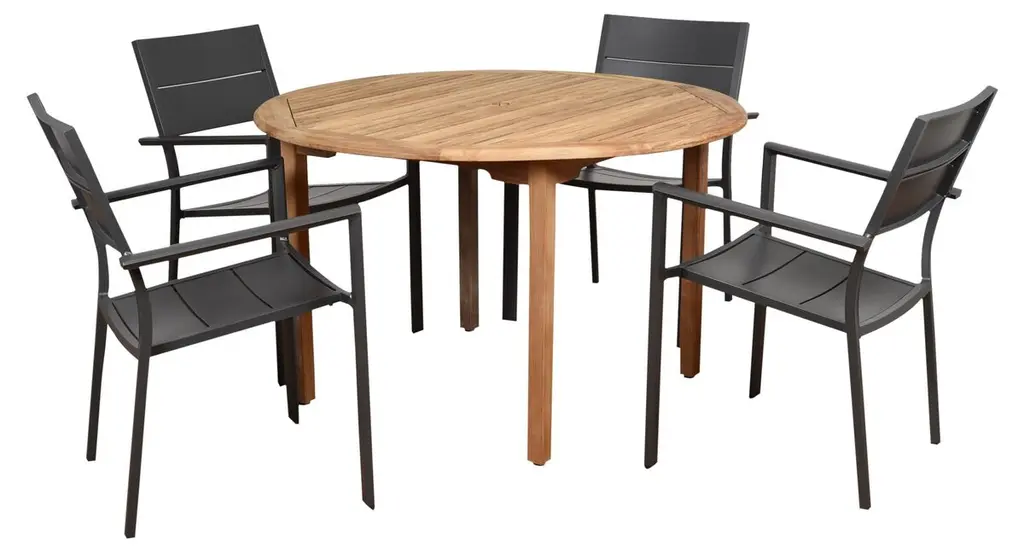 This outdoor dining sets provides a relaxing place to read, work, enjoy a meal, or host a party with family and friends. Combining a refined, classic look with quality materials, this 5 piece patio dining set complements almost any home or landscaping theme. Bring some extra comfort and style to your sunroom, poolside, garden, porch, or backyard