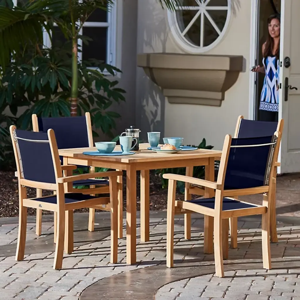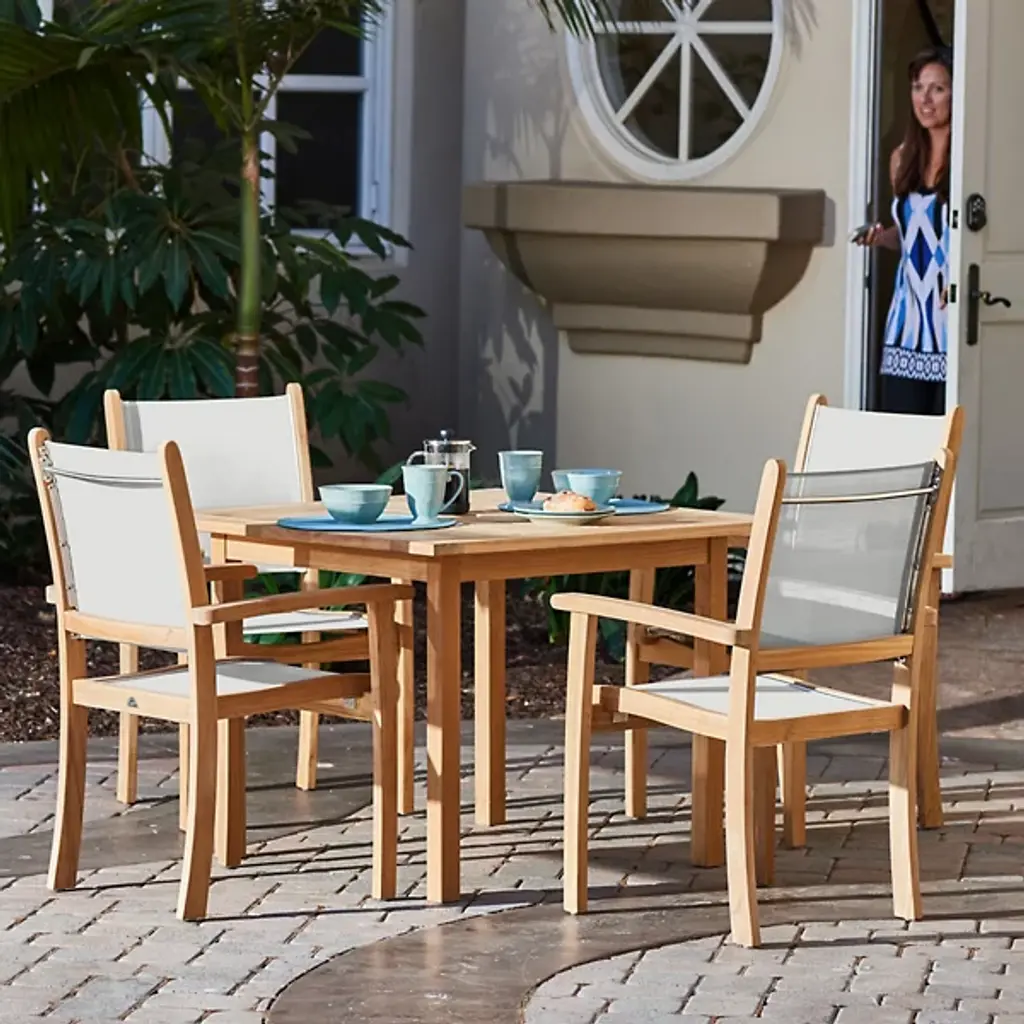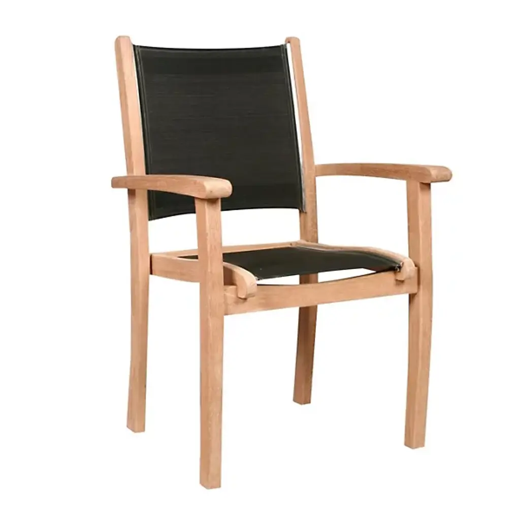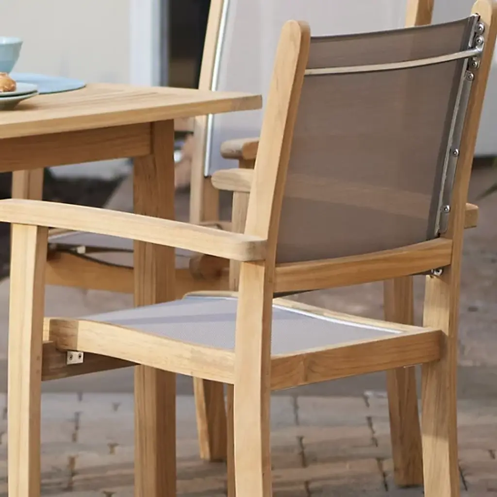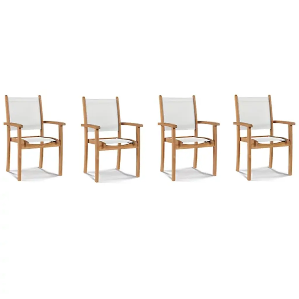 The Pearl Outdoor Stackable Dining Armchair - Set of 4 from HiTeak Furniture is a 100% genuine teak wood construction promoting a comfortable posture and a sophisticated look. The eyes instantly realize the real craftsmanship behind this piece as interlocking teak segments join with the smoothest of sanded surfaces. Named after a hip district of Portland, this stacking chair ages gracefully in a dense teak wood prized for its solid feel and weather-resistant properties. A mesh seat and backing wrap the piece up in an airy surface that's simply a pleasure on sunny days.