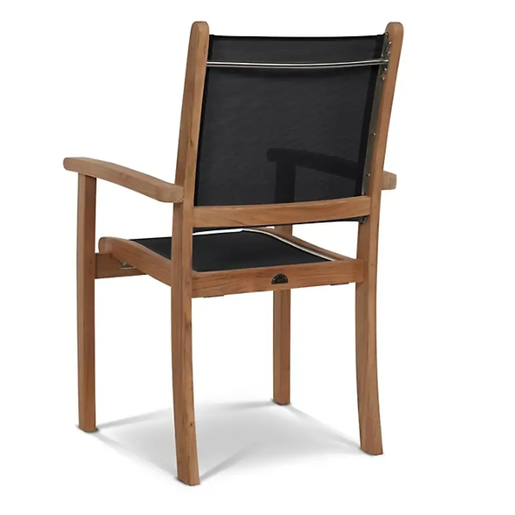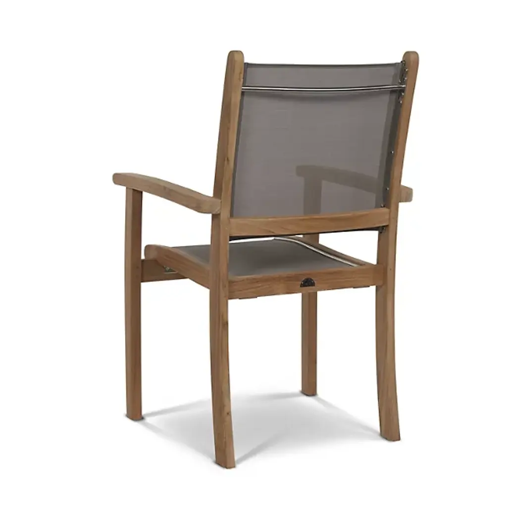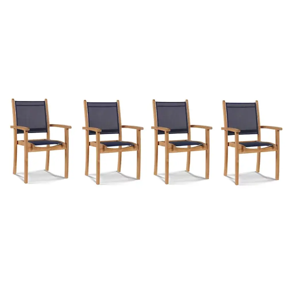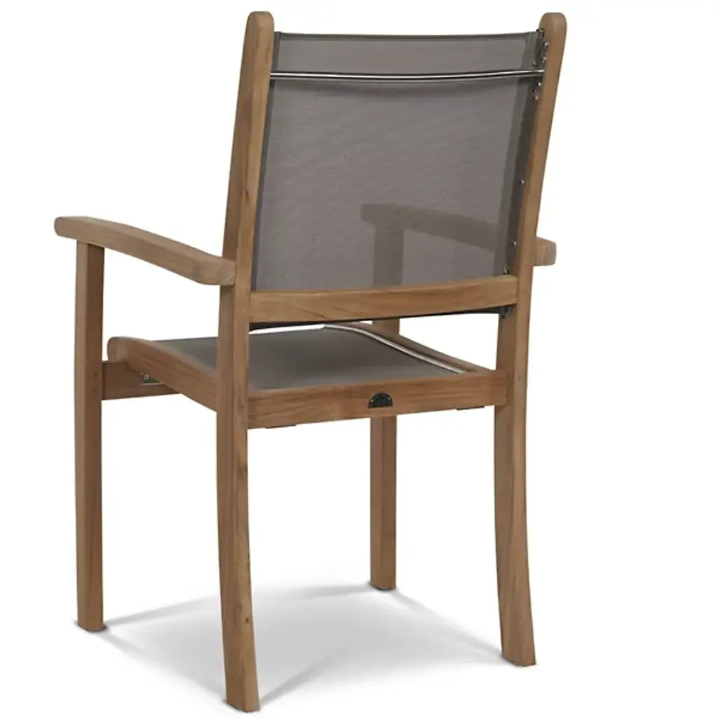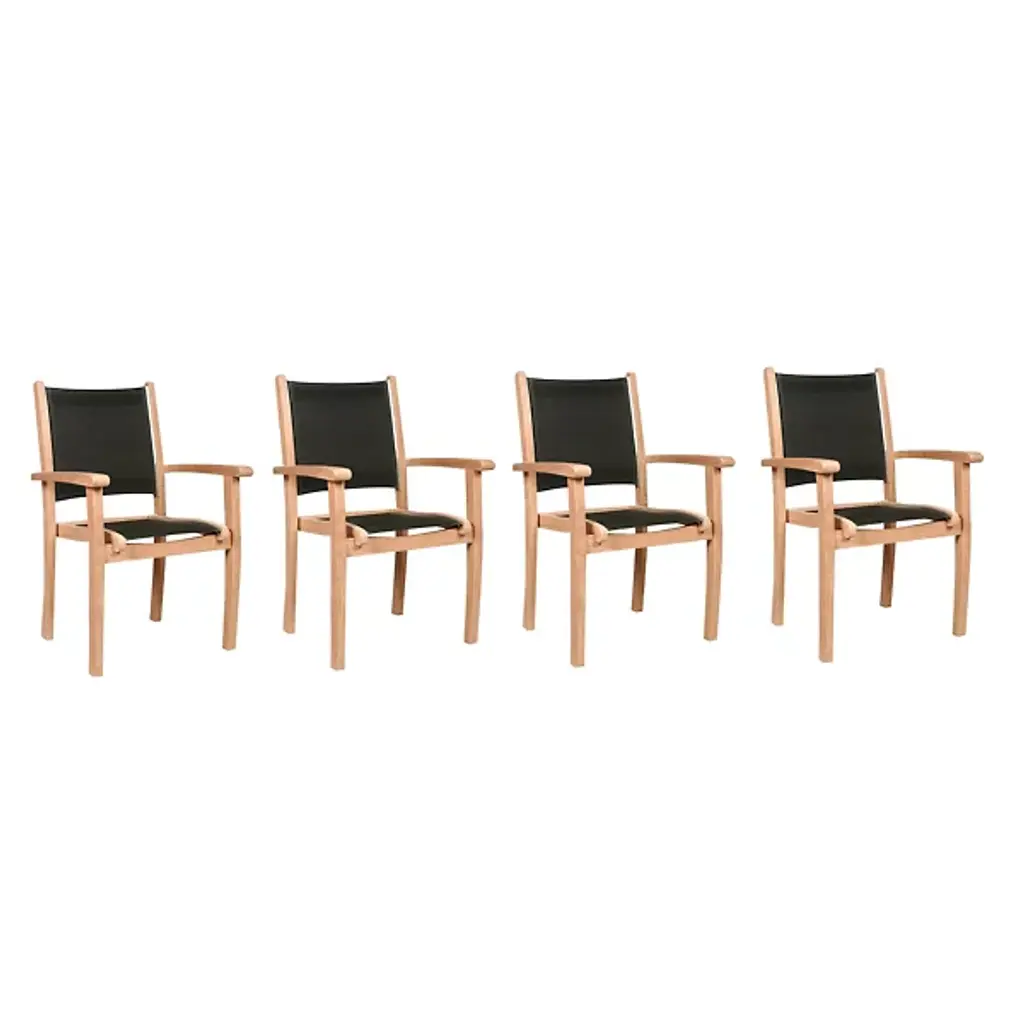 The Pearl Outdoor Stackable Dining Armchair - Set of 4 from HiTeak Furniture is a 100% genuine teak wood construction promoting a comfortable posture and a sophisticated look. The eyes instantly realize the real craftsmanship behind this piece as interlocking teak segments join with the smoothest of sanded surfaces. Named after a hip district of Portland, this stacking chair ages gracefully in a dense teak wood prized for its solid feel and weather-resistant properties. A mesh seat and backing wrap the piece up in an airy surface that's simply a pleasure on sunny days.