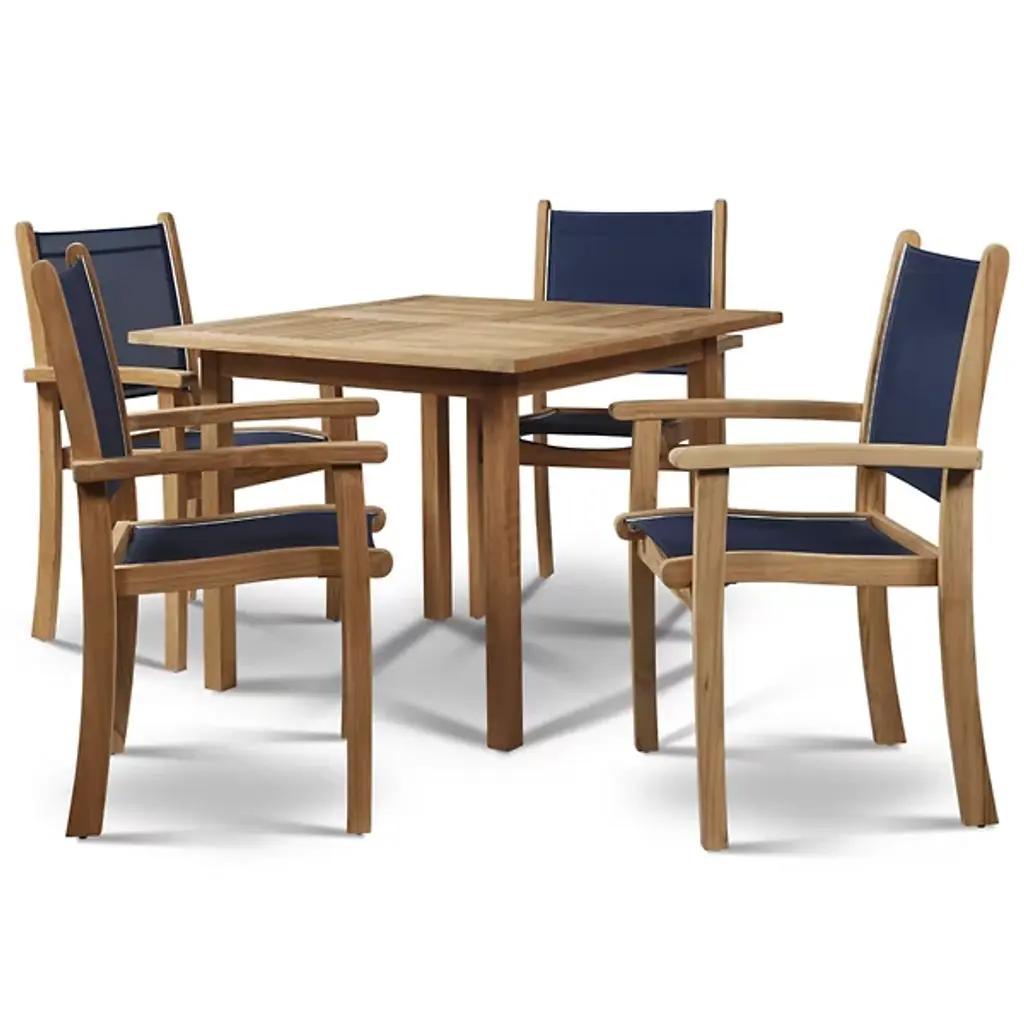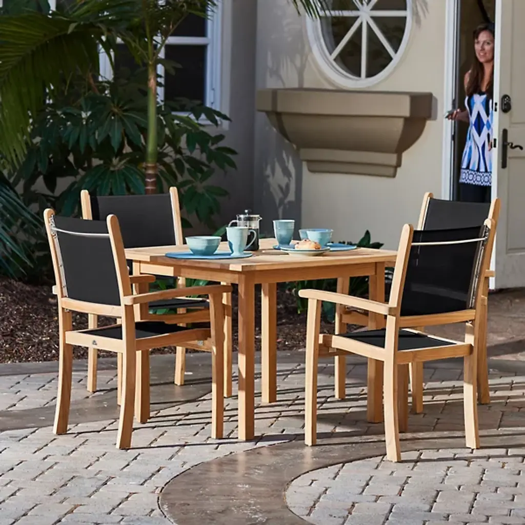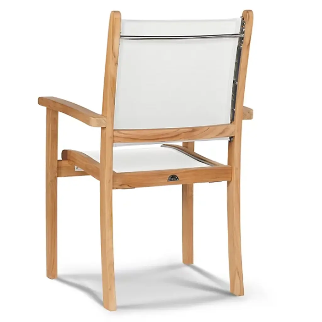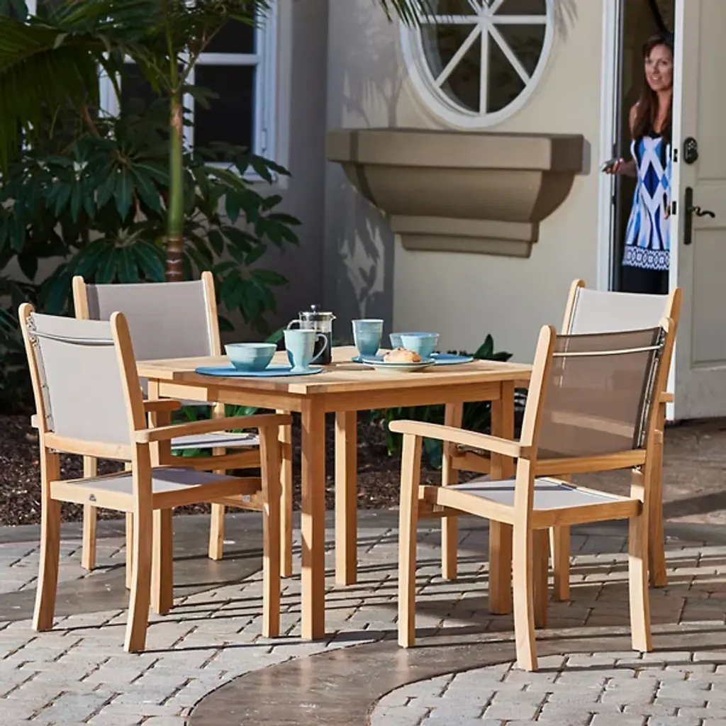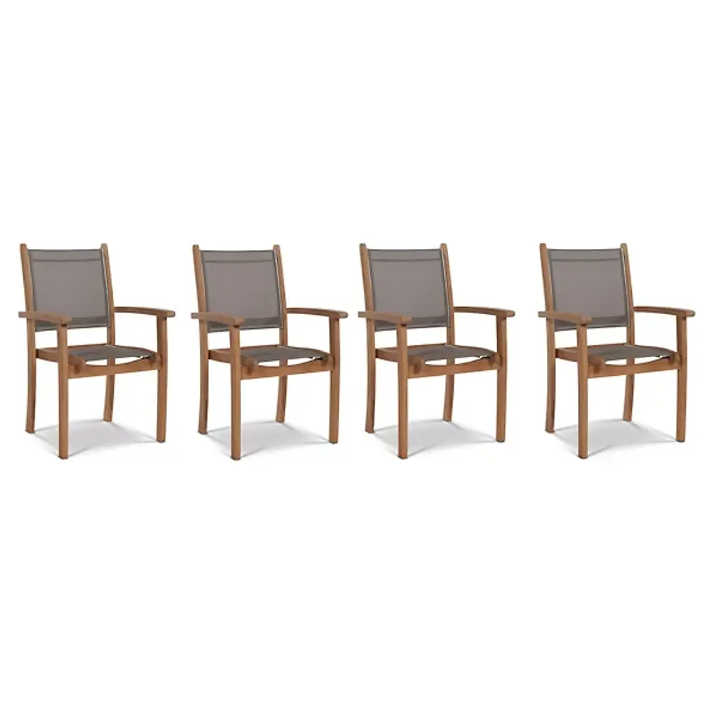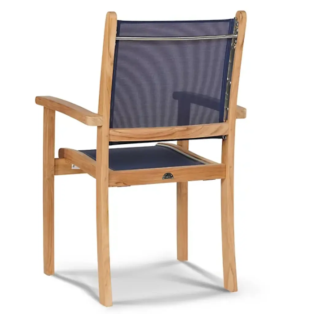 The Pearl Outdoor Stackable Dining Armchair - Set of 4 from HiTeak Furniture is a 100% genuine teak wood construction promoting a comfortable posture and a sophisticated look. The eyes instantly realize the real craftsmanship behind this piece as interlocking teak segments join with the smoothest of sanded surfaces. Named after a hip district of Portland, this stacking chair ages gracefully in a dense teak wood prized for its solid feel and weather-resistant properties. A mesh seat and backing wrap the piece up in an airy surface that's simply a pleasure on sunny days.