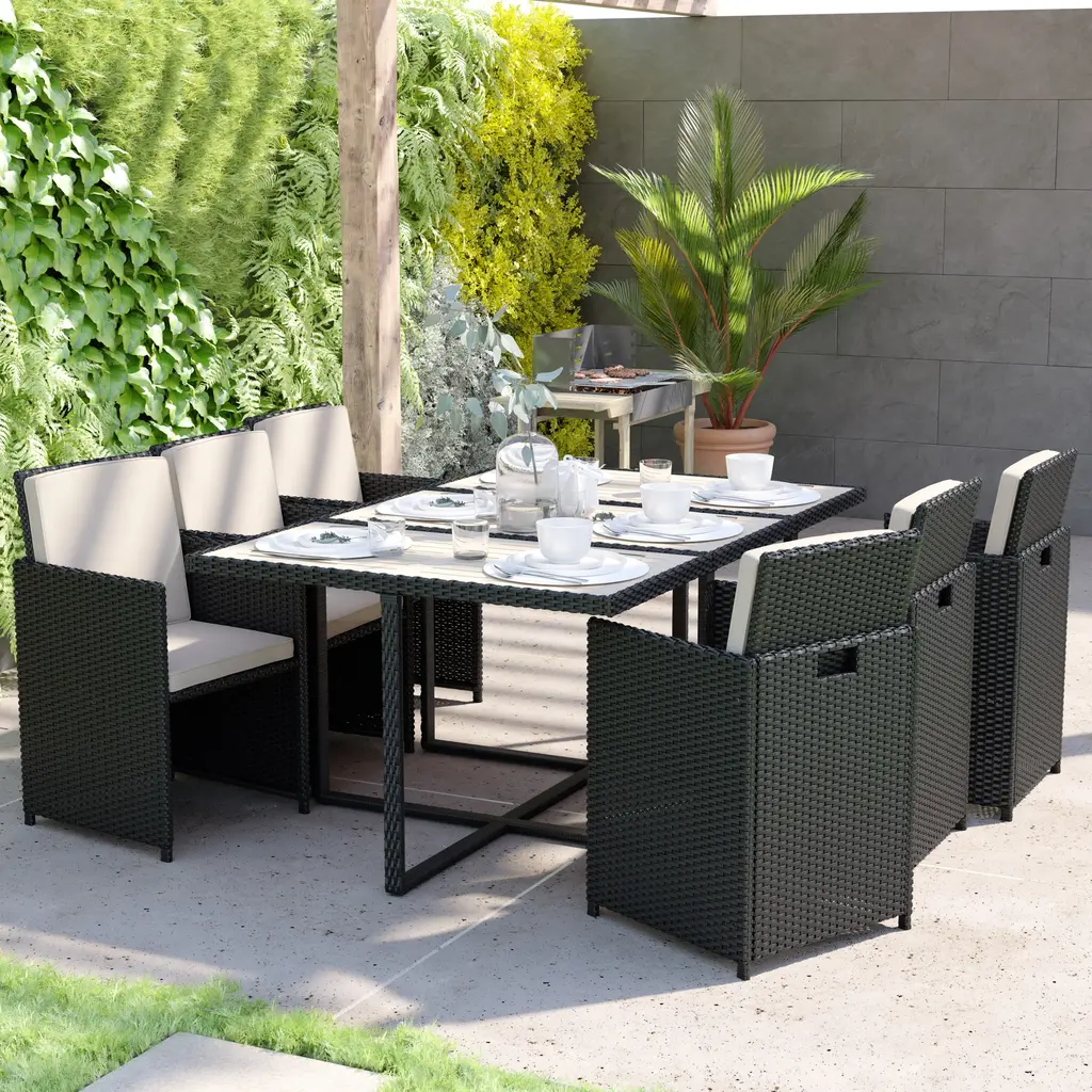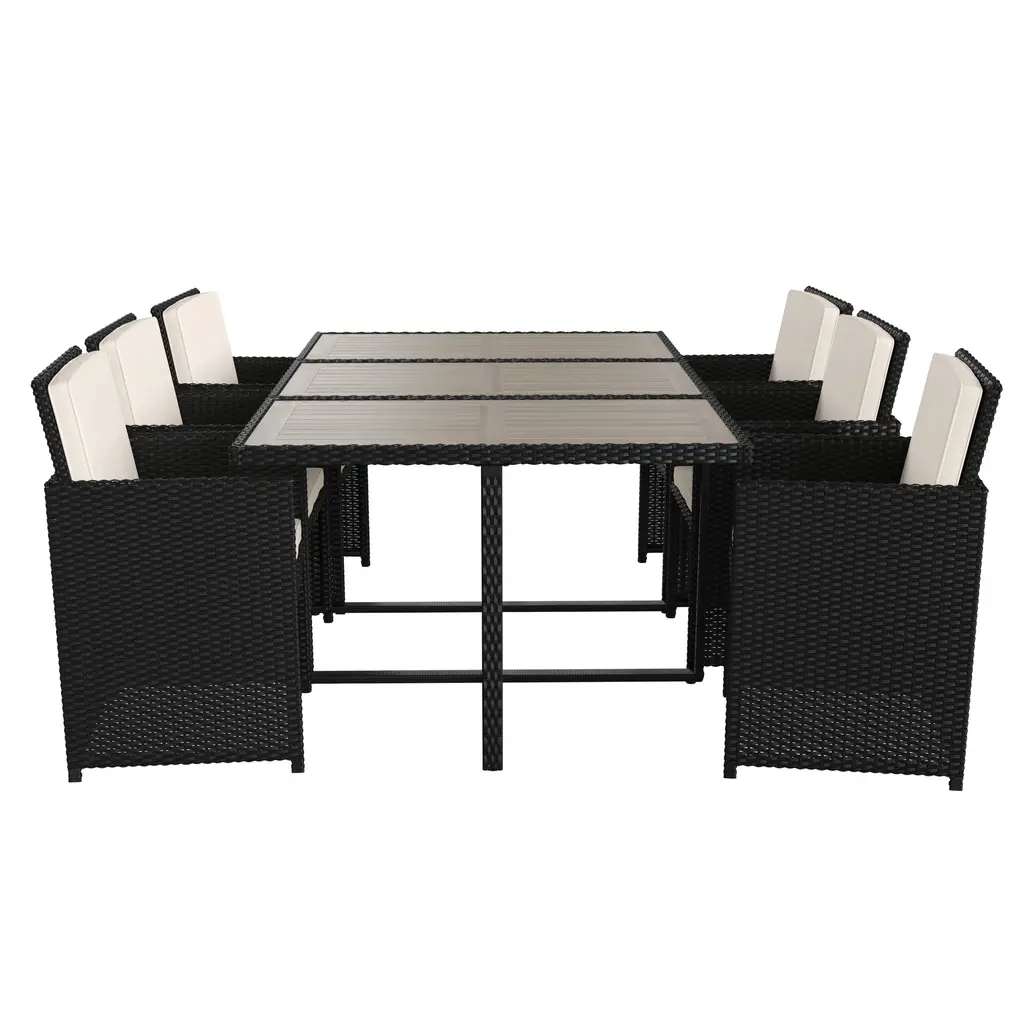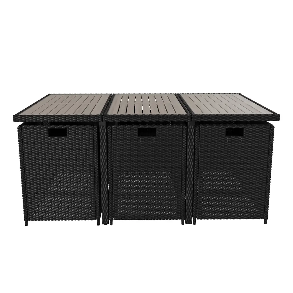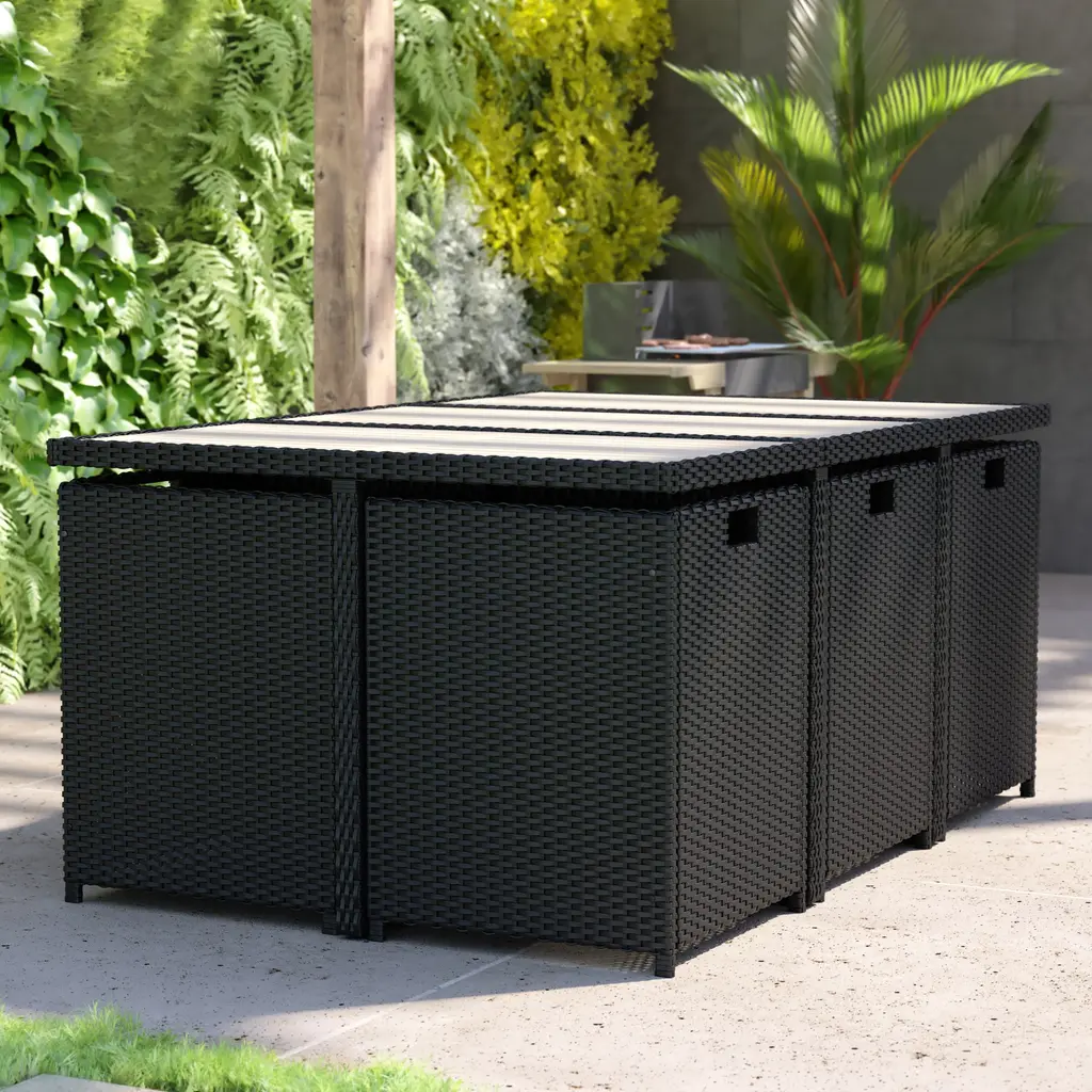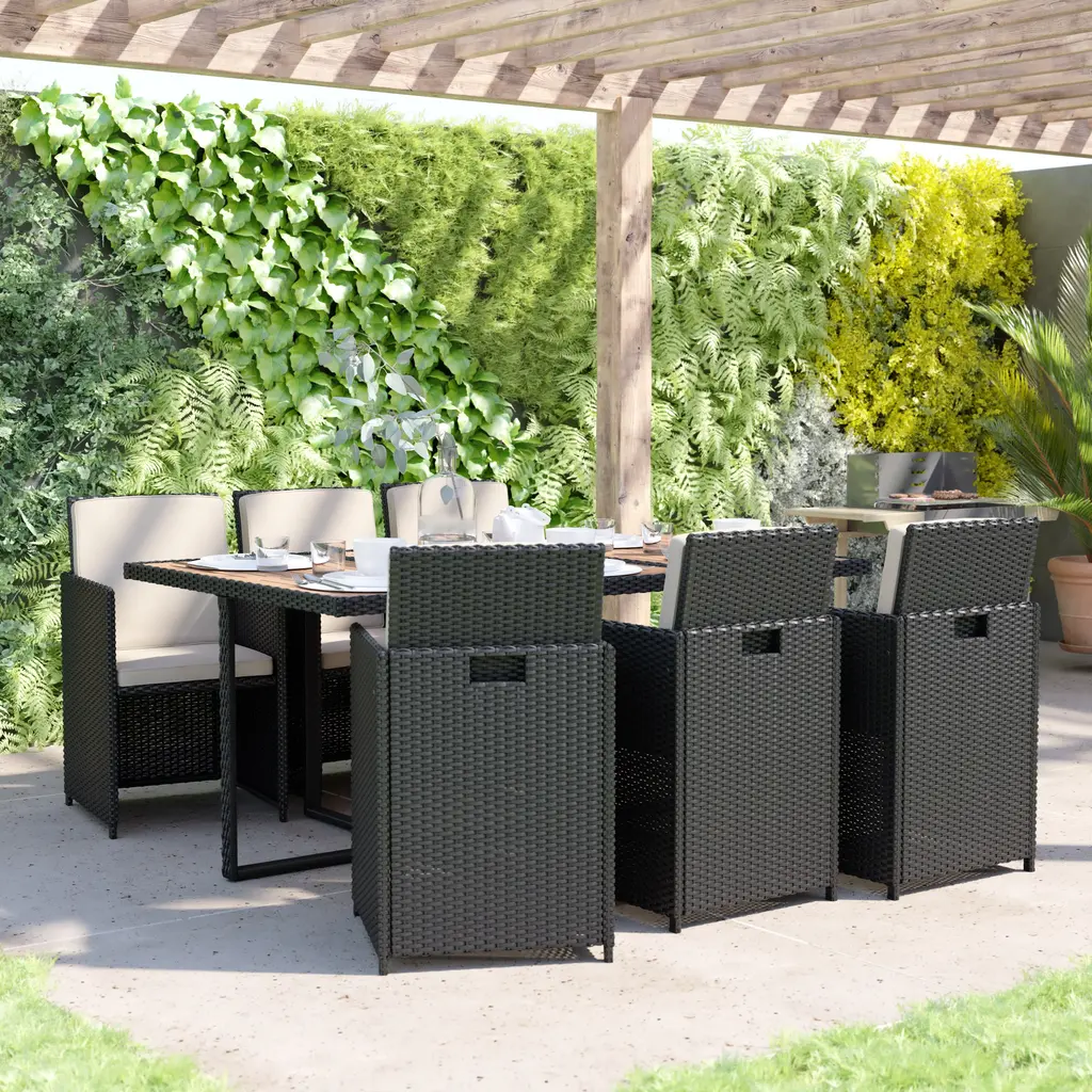 Modern materials paired with a classic design gives you the best of both worlds in this updated 7 piece wood and wicker dining set. Designed for your comfort, this indoor/outdoor set has integrated arms and includes super comfortable thick padded back and seat cushions to ensure your guests are completely relaxed no matter how long the party lasts. The space-saving, modular design, allows the backrests to fold down onto the seats so the chairs tuck fully under the table which is perfect for smaller areas. Metal frames, wrapped in polyethylene wicker, are fade and weather-resistant for long-lasting use. A slatted table top boasts real acacia wood that enhances any entertaining space. Just as strong as they are stylish, each wicker chair holds up to 400 lbs. static weight while the rectangular table holds up to 200 lbs. static weight. Expertly packaged, this outdoor patio dining set for 6 arrives in 3 boxes and contains everything you need for easy assembly including tools, hardware, and illustrated step-by-step instructions. All pieces of this patio set wipe clean with a damp cloth so you can spend more time in your happy place.