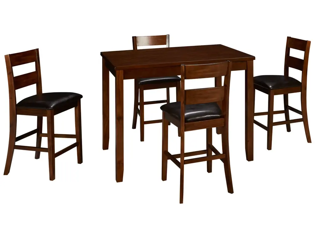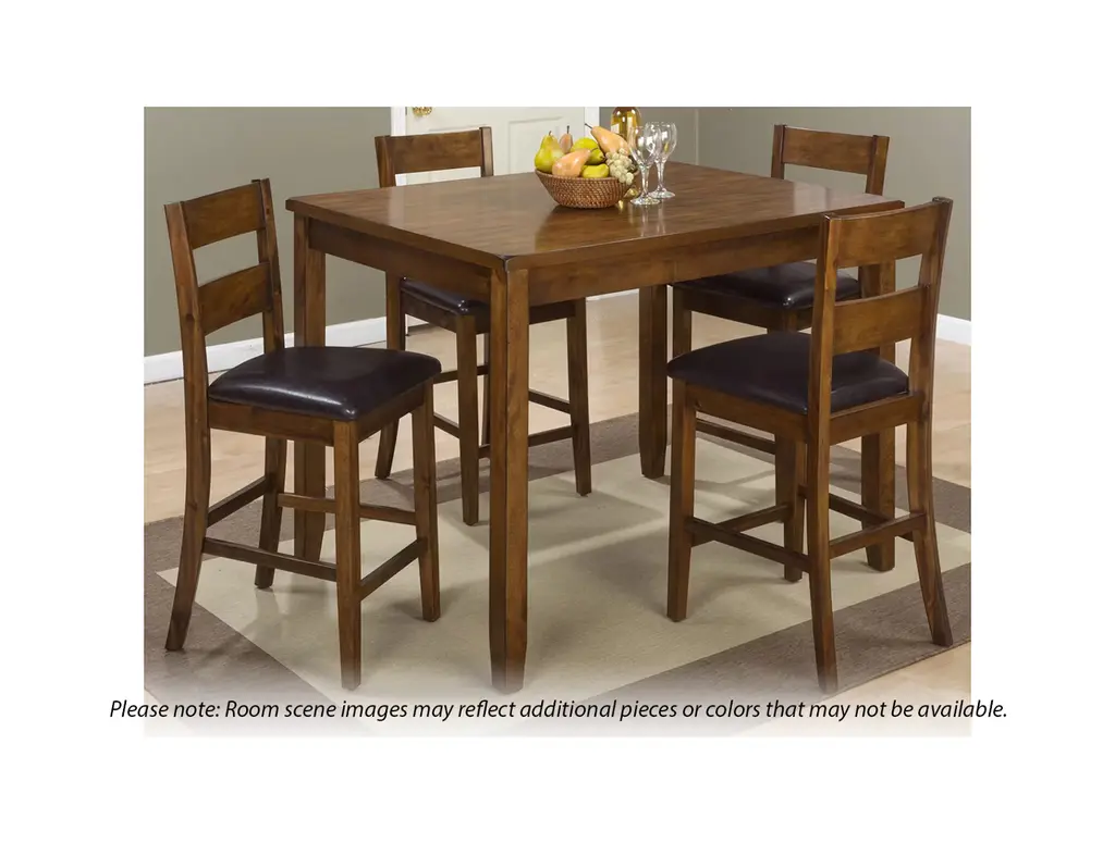 Set in functional and durable construction, this Plantation Table with Four Counter Stools makes a great addition to your home furnishings. Exhibiting a rich finish on its sturdy framework, this transitional-style home furniture is sure to blend in with a variety of interior styles. The set consists of a table with a spacious top, and four counter stools featuring upholstered seat cushions to help you easily set up your dining room.