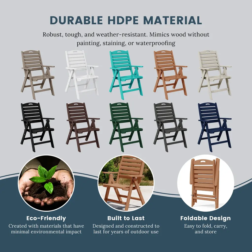 Sit down for a nice meal and relax afterward with this enchanting Patio Folding Highback Dining Chair. Crafted with durable, all-weather HDPE material, it is resilient to outdoor conditions with UV and fade resistance, making it the ideal material for protection against the elements. Lay back after an amazing meal with the reclinable backrest, which has four different positions, adding overall comfort. Once mealtime is over, simply pick up the chair and fold it for easy storage, making cleanup a breeze.While we strive to accurately represent product colors, please be aware that actual colors may vary slightly due to individual screen settings and lighting conditions. FeaturesDetails: