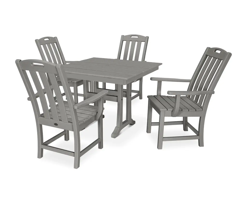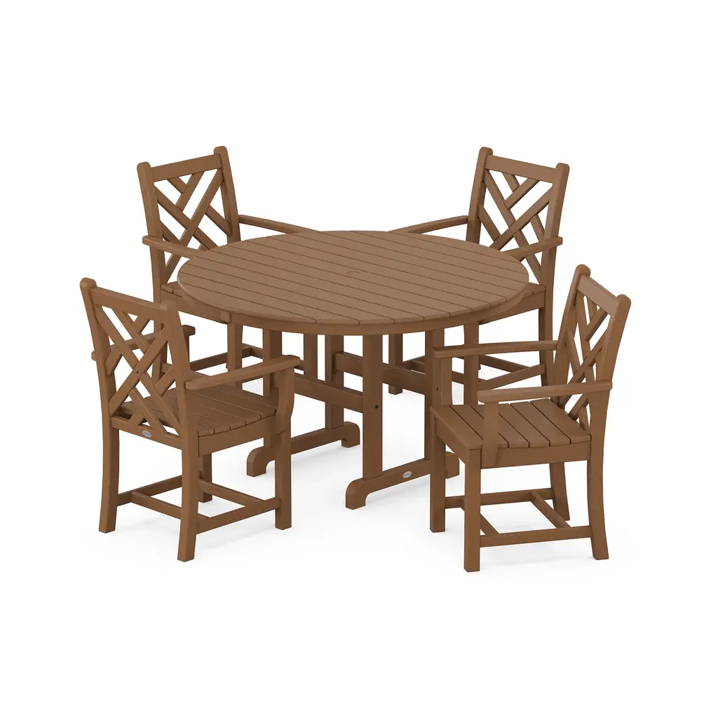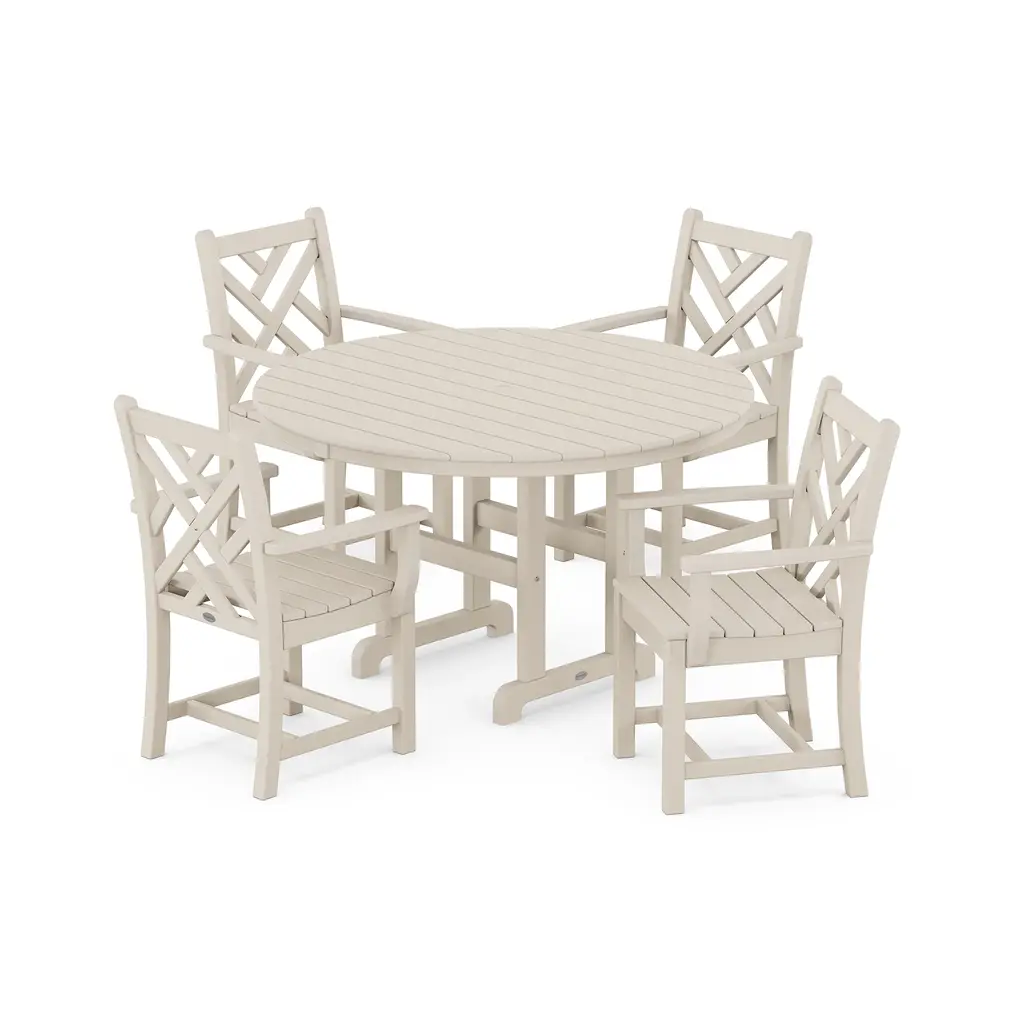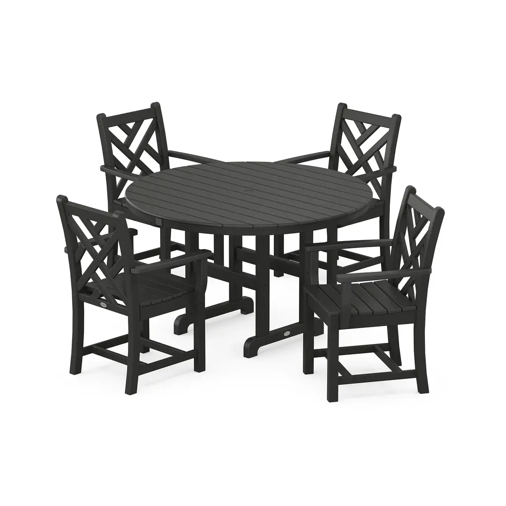 Inspired by the popular 18th century design style, the POLYWOOD®; Chippendale 5-Piece Dining Set is the perfect combination of intricate details, fine lines and elaborate simplicity. This enchanting set is constructed of solid POLYWOOD®; recycled lumber, which gives it the look of painted wood without the maintenance real wood requires. The set is also easy to clean and maintain as it resists most weather conditions as well as stains from food, drinks, insects and other environmental stresses.