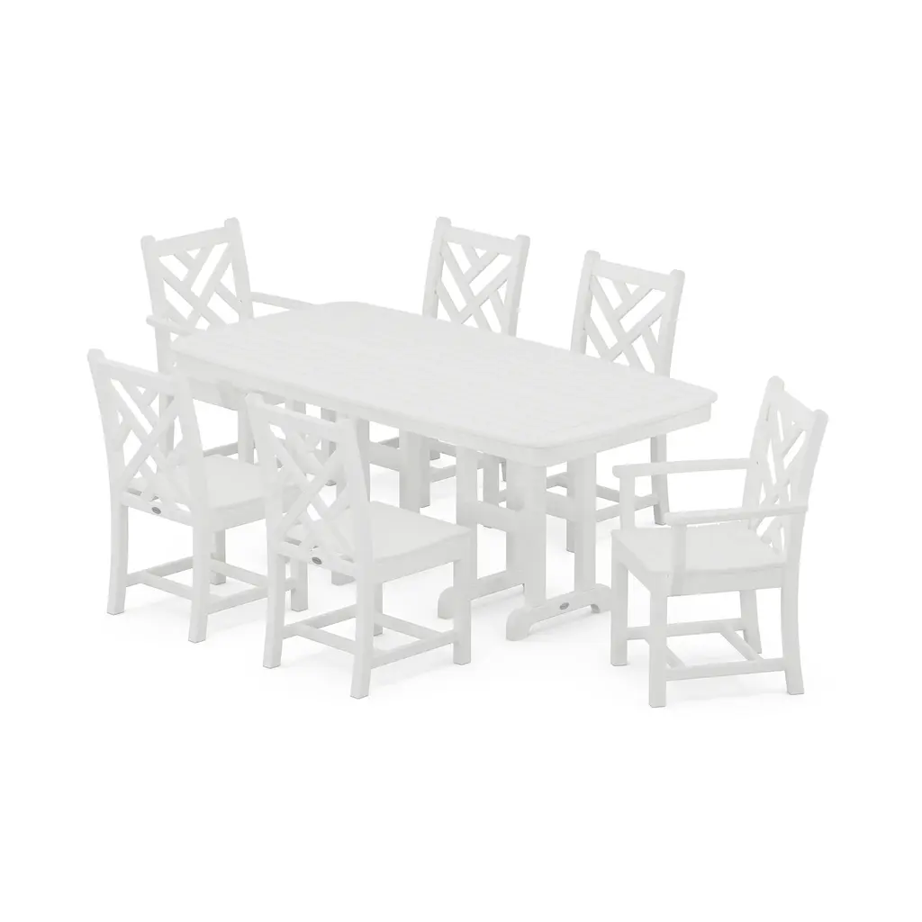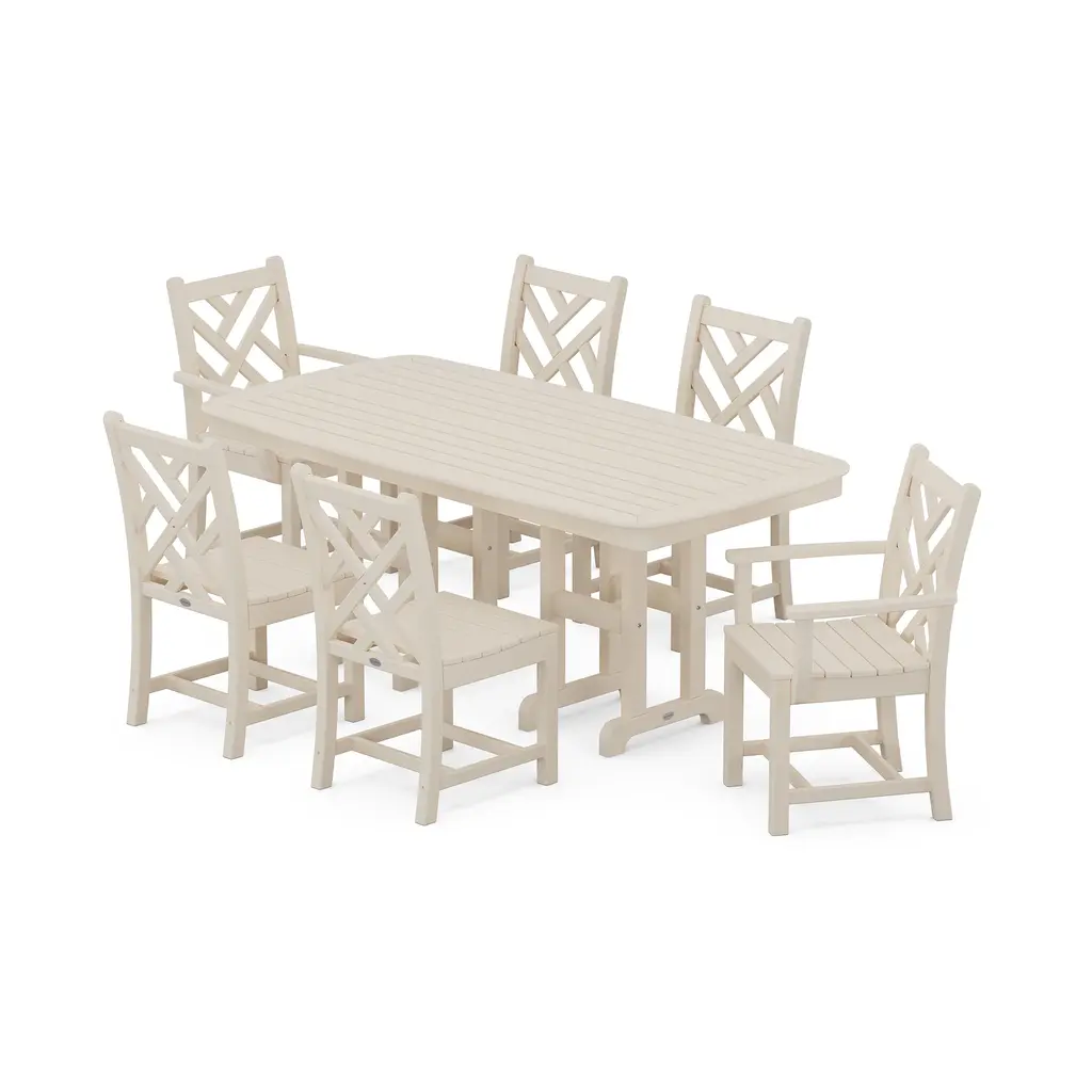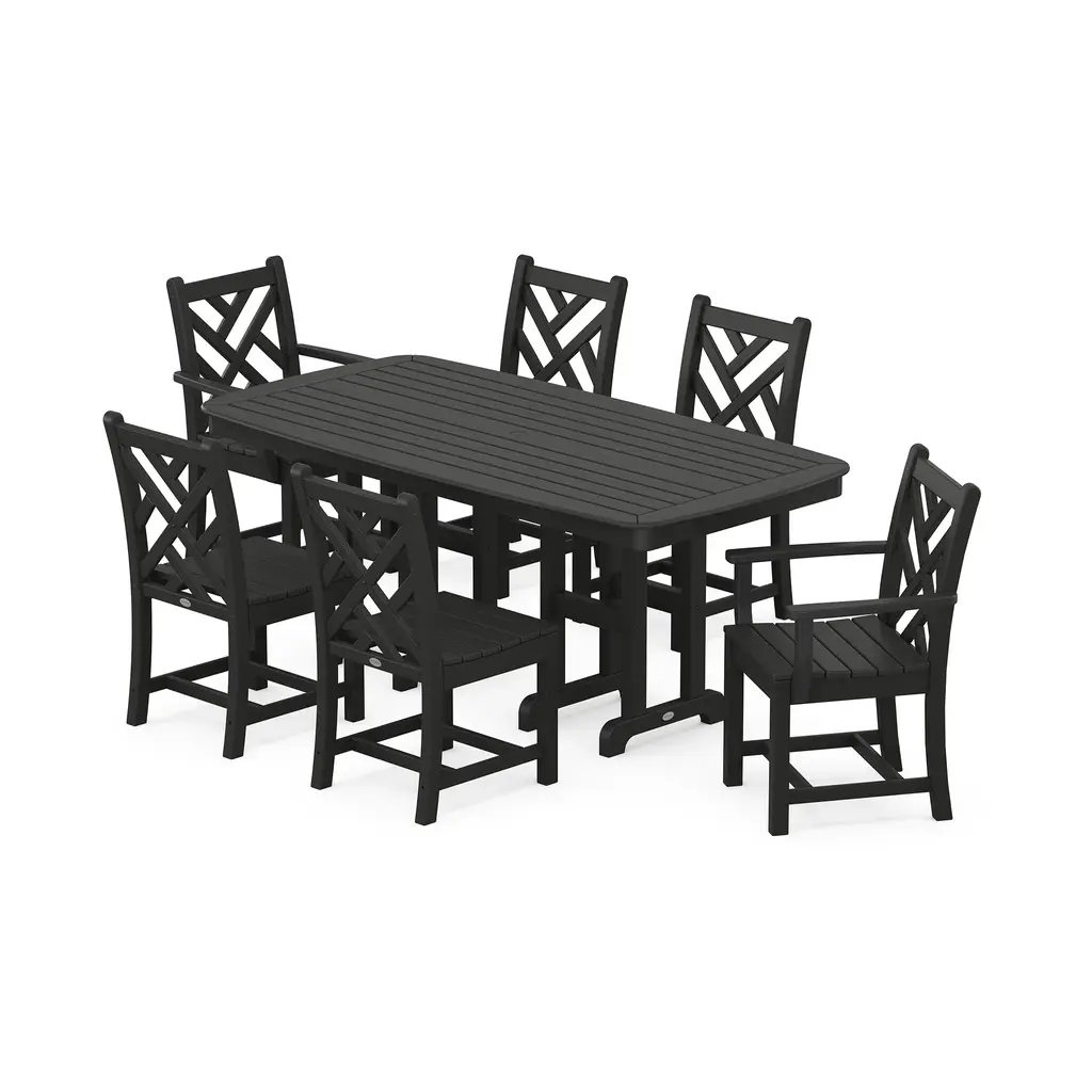Simple elegance is what characterizes the POLYWOOD® Chippendale 7-Piece Dining Set. Its inspiration comes from the popular 18th century furniture design style. Its durable construction comes from solid POLYWOOD® recycled lumber that’s made to last and look good for years. This exquisite set includes four Chippendale Dining Side Chairs, two Chippendale Dining Arm Chairs, and a spacious Nautical 37” x 72” Dining Table that’s not only easy to clean but resists food and beverage stains, too.To learn more about American made POLYWOOD® Outdoor Furniture or buying from Vermont Woods Studios please contact us at 802-579-1302.