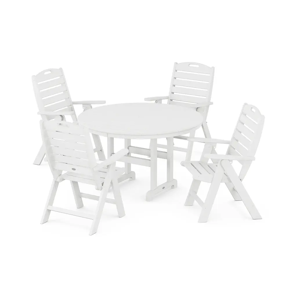 Your outdoor deck will soon become the whole family’s favorite port of call when you furnish it with the POLYWOOD® Nautical 5-Piece Dining Set. Relaxed enough for casual dining yet perfectly suited for elegant affairs, this collection includes four Nautical Highback Chairs that provide comfortable seating and a three-position adjustable back. They also fold flat for easy storage and transportation. In addition, the set comes with a Round 48” Dining Table. This furniture is easy to clean and requires very little maintenance to retain its good looks. And because it’s constructed of solid POLYWOOD®; recycled lumber, you can count on its durability to withstand most all-weather conditions.