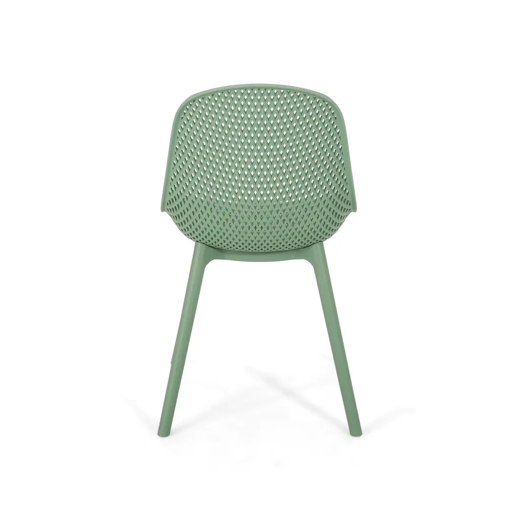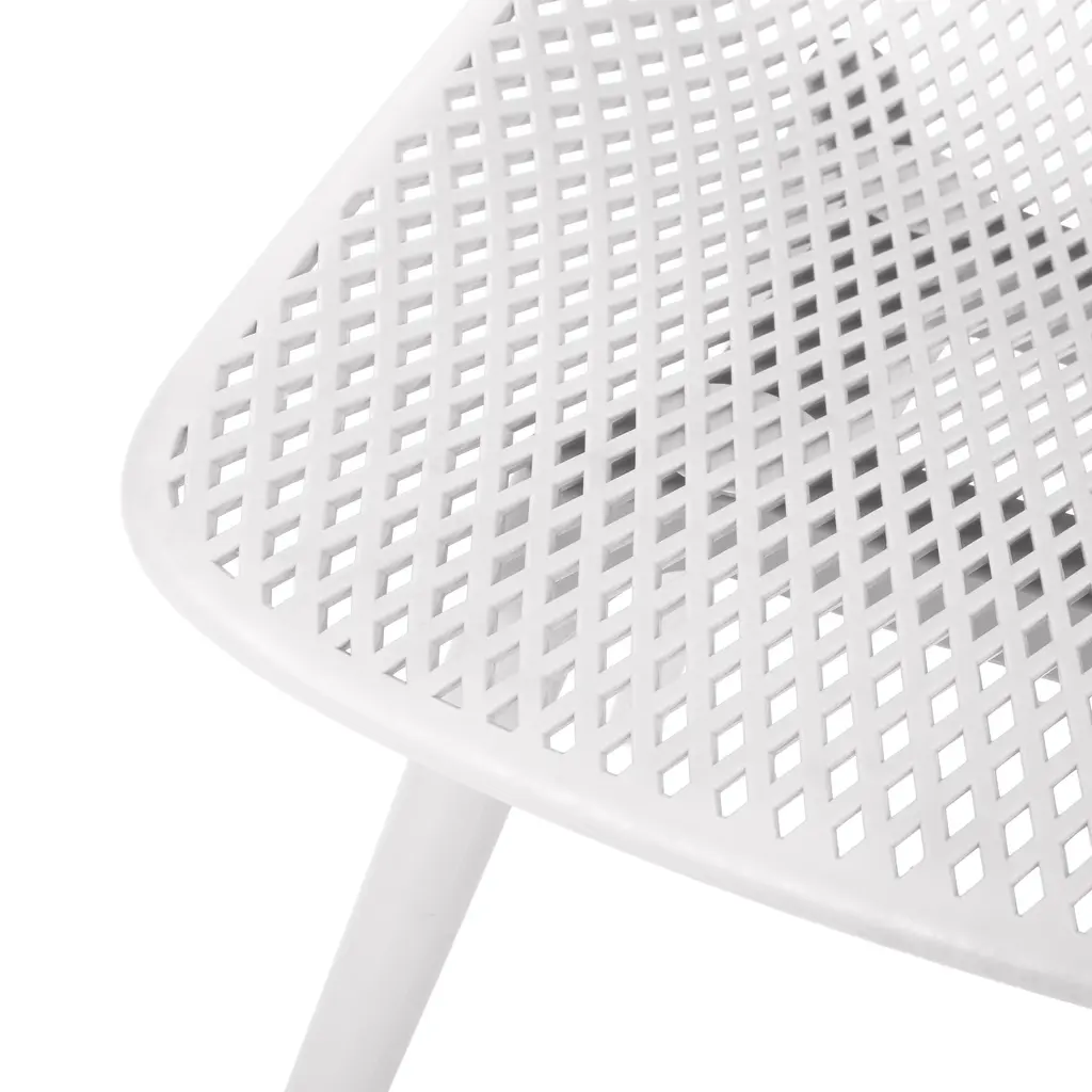 Sleek and modern, this set of four chairs will add style and function to your outdoor dining space. Each chair features a minimalist design with a molded seat, crafted from durable, weather-resistant polypropylene resin. The seat features a perforated diamond pattern that allows debris and water to drain away, creating a breathable, airy design that is perfect for sitting outside.Features:Dimensions: