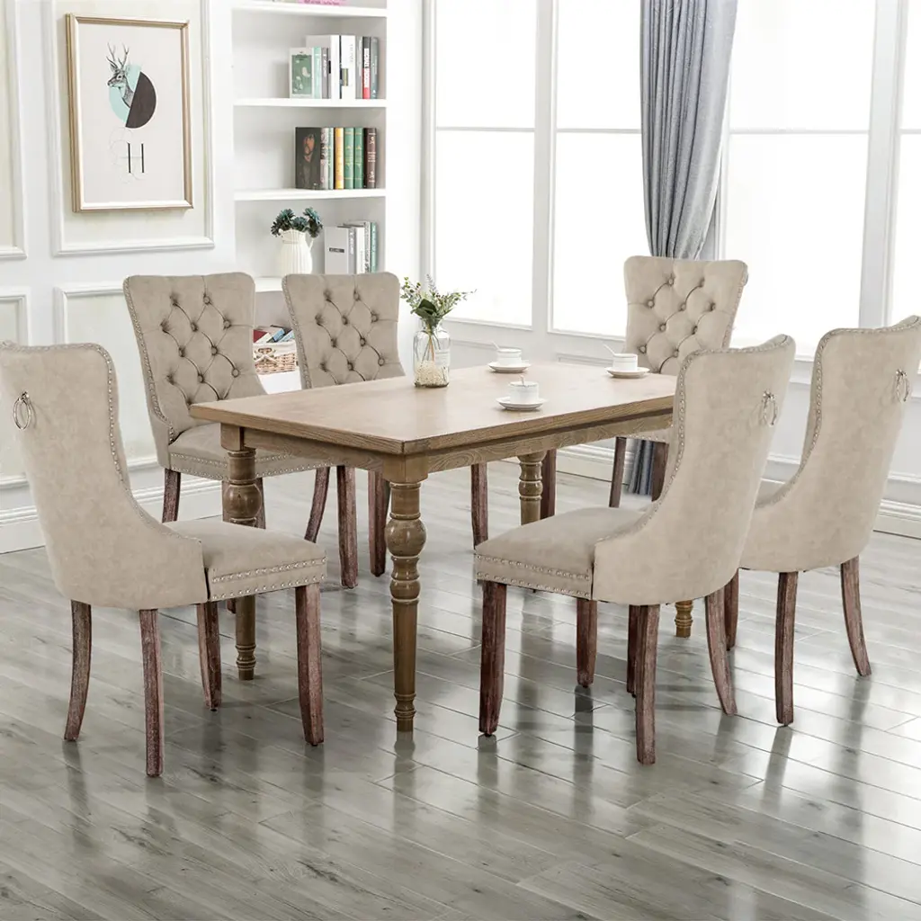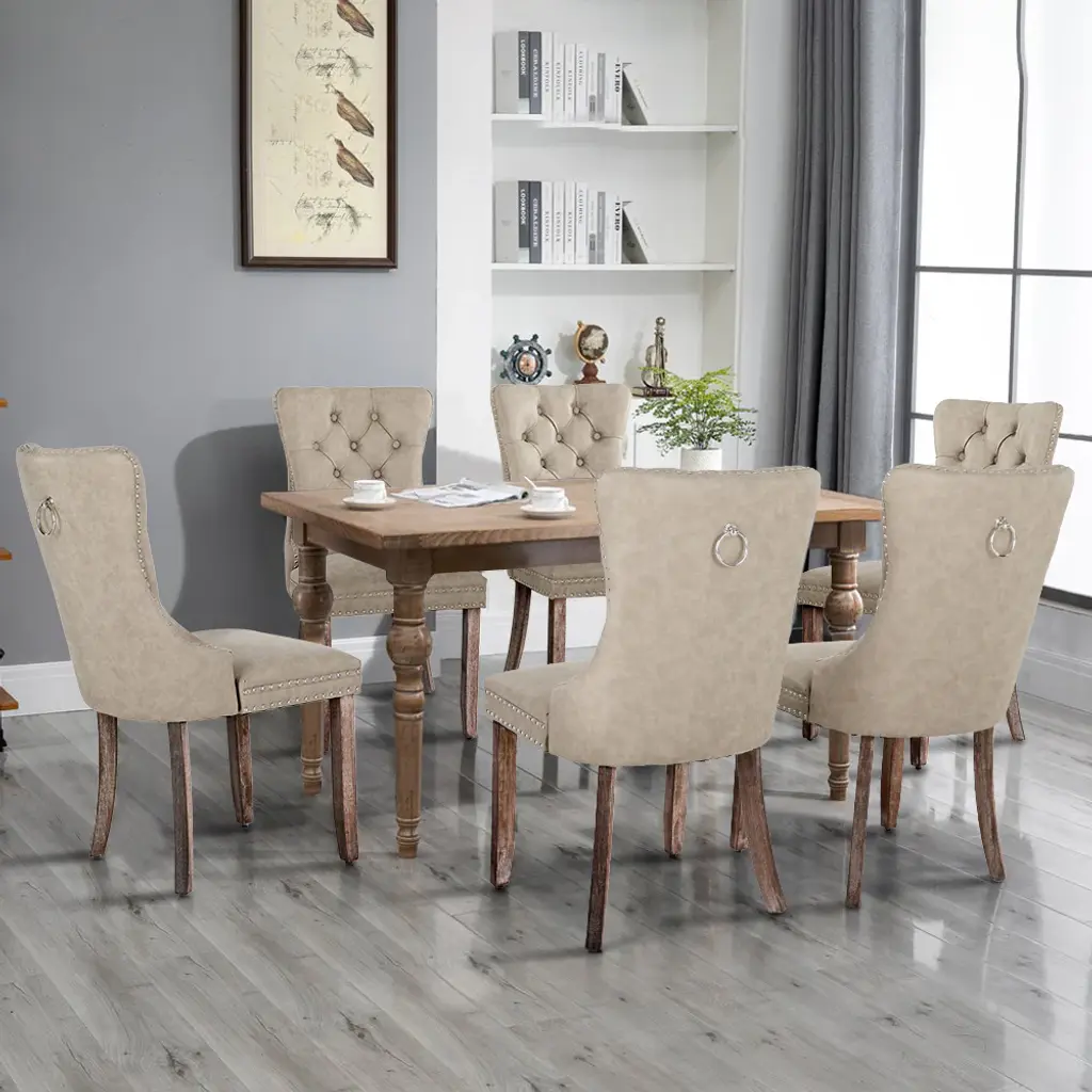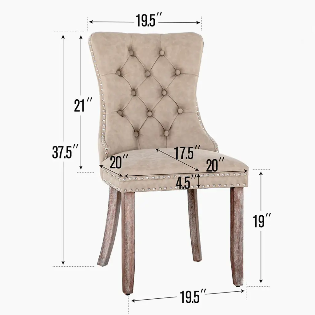 Elevate your dining space with our classic design PU Leather Dining Chairs, embodying simplicity and elegance. The soft cushioned seats are covered in waterproof, durable faux leather with charming nailhead detailing, complemented by sturdy solid wood legs. The pull ring on the back adds convenience, making these chairs a perfect choice for a comfortable and stylish dining experience in your home.