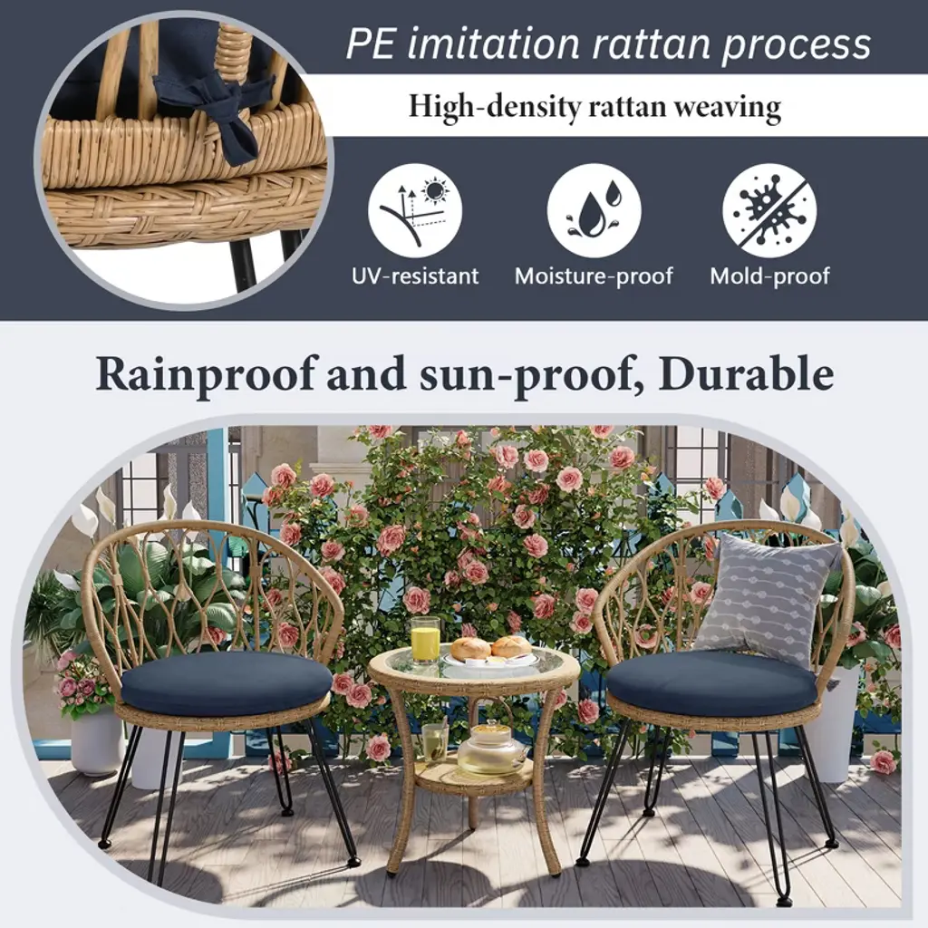 Racxily Patio Dining Sets With 2 Rattan Single Chairs And Glass Round Table, Outdoor Leisure Set For Patios, Balconies, Courtyards