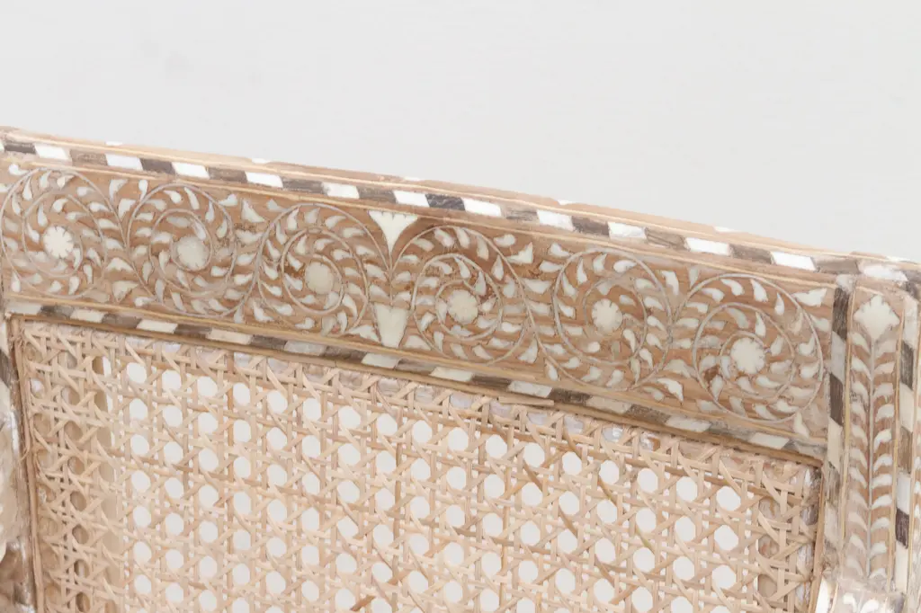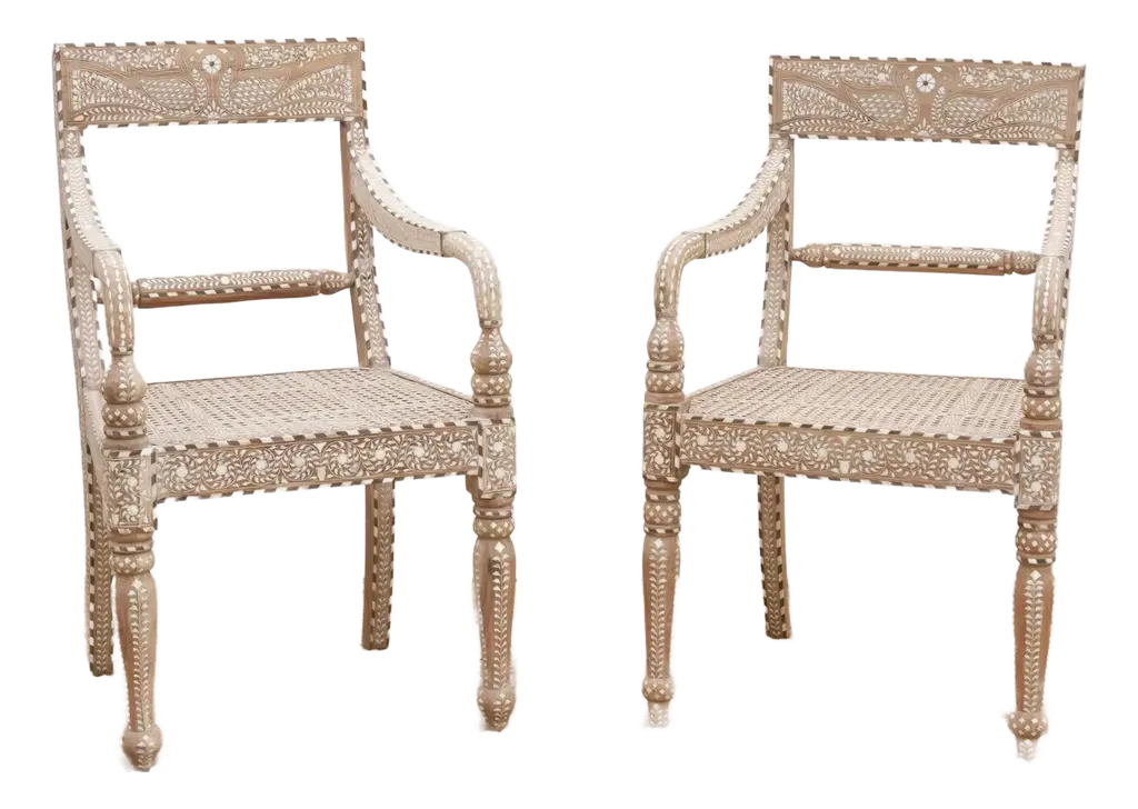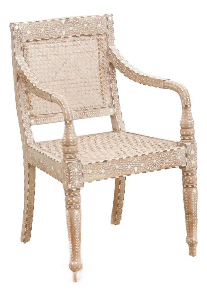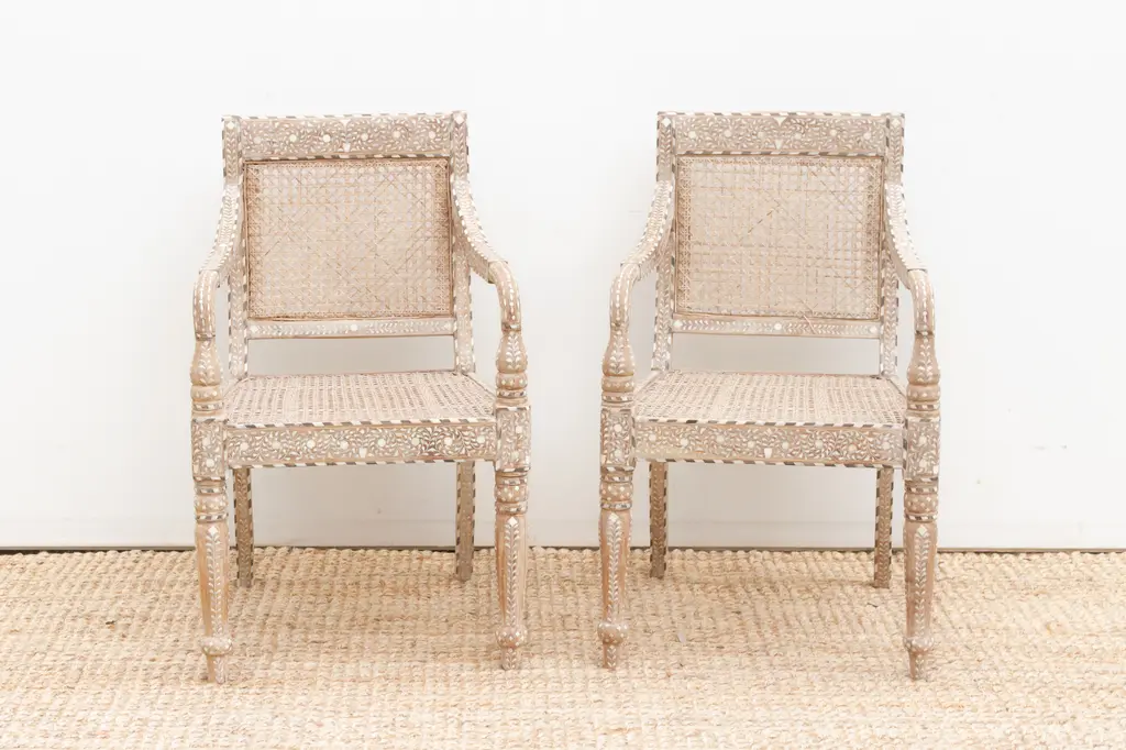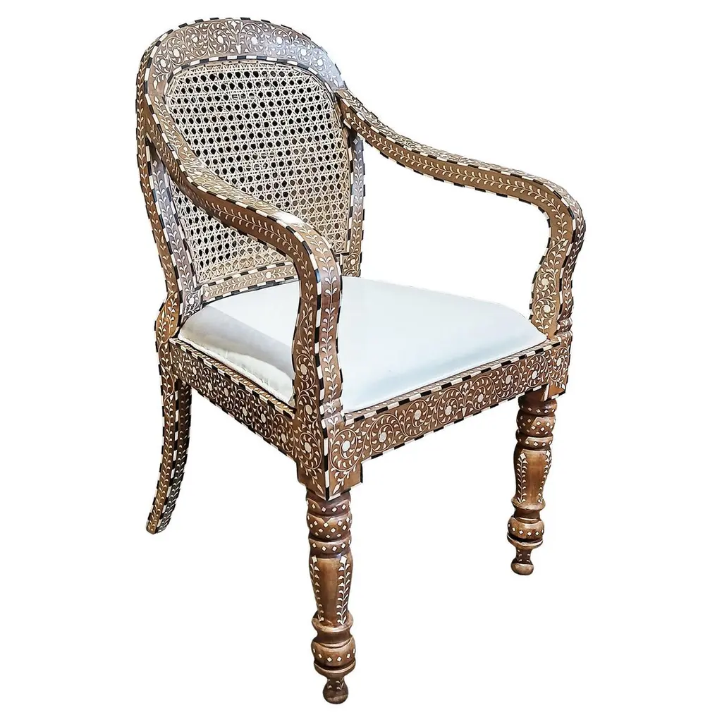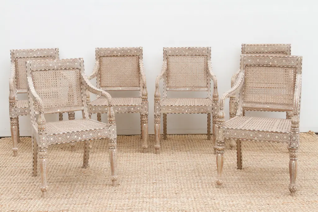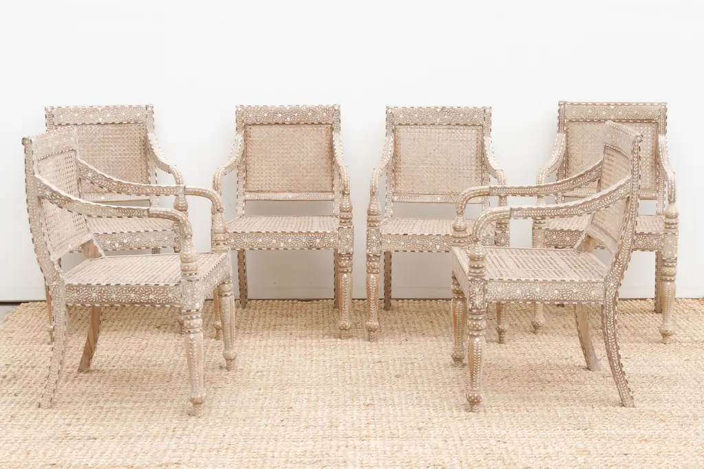 Elevate your dining or living space with this set of six handcrafted inlaid armchairs. Featuring breathable cane seats and backs, each chair is adorned with intricate inlay work on the backrests, arms, and turned legs. Inspired by British Colonial design, these chairs showcase fine craftsmanship where every tiny inlay is hand-cut and set. Comfortable curved armrests and rich wood tones create a timeless statement of heritage, artistry, and elegant style.