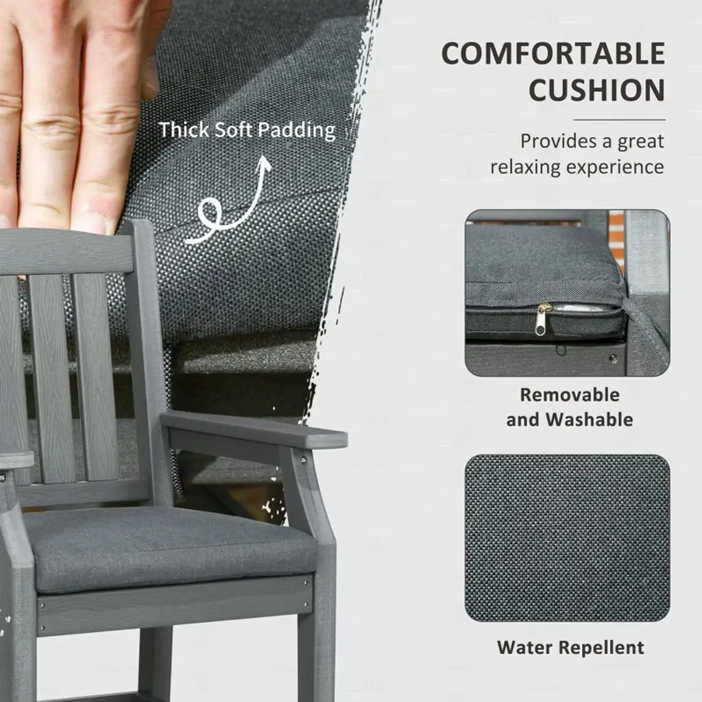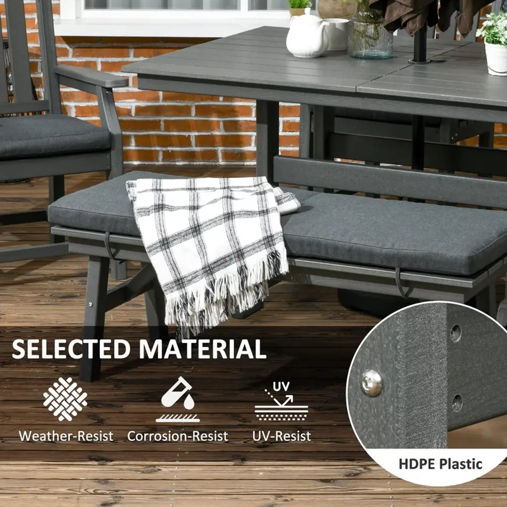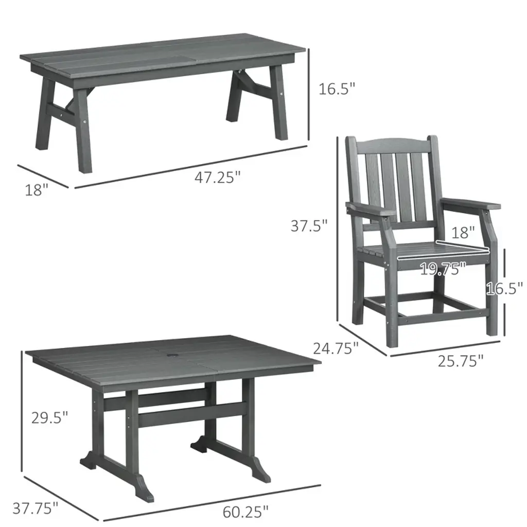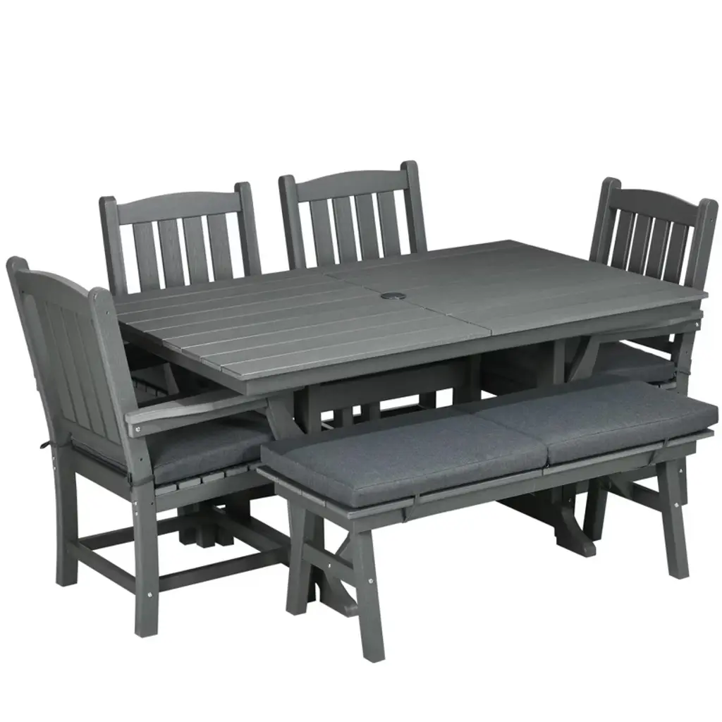 Experience the ultimate outdoor dining ambiance with the Resenkos Outdoor Dining Table and Chairs Set! Perfect for backyard barbeques, cozy campfires, and serene reading sessions, this all-in-one set offers comfort and style. Crafted from durable HDPE and polyester, the set includes a 60.25" rectangular dining table with a central umbrella hole, four cushioned chairs with armrests, and a bench, all in a timeless farmhouse design. The quick-drying slats ensure your furniture stays pristine, while the removable cushion covers make cleaning a breeze. With a weight capacity of up to 352 lbs. per chair, 704 lbs. for the bench, and 165 lbs. for the table, this set is built to last. Complete your outdoor oasis with the Resenkos Outdoor Dining Table and Chairs Set, featuring easy assembly and a comprehensive manual. Item Label: 84G-063V00CG.