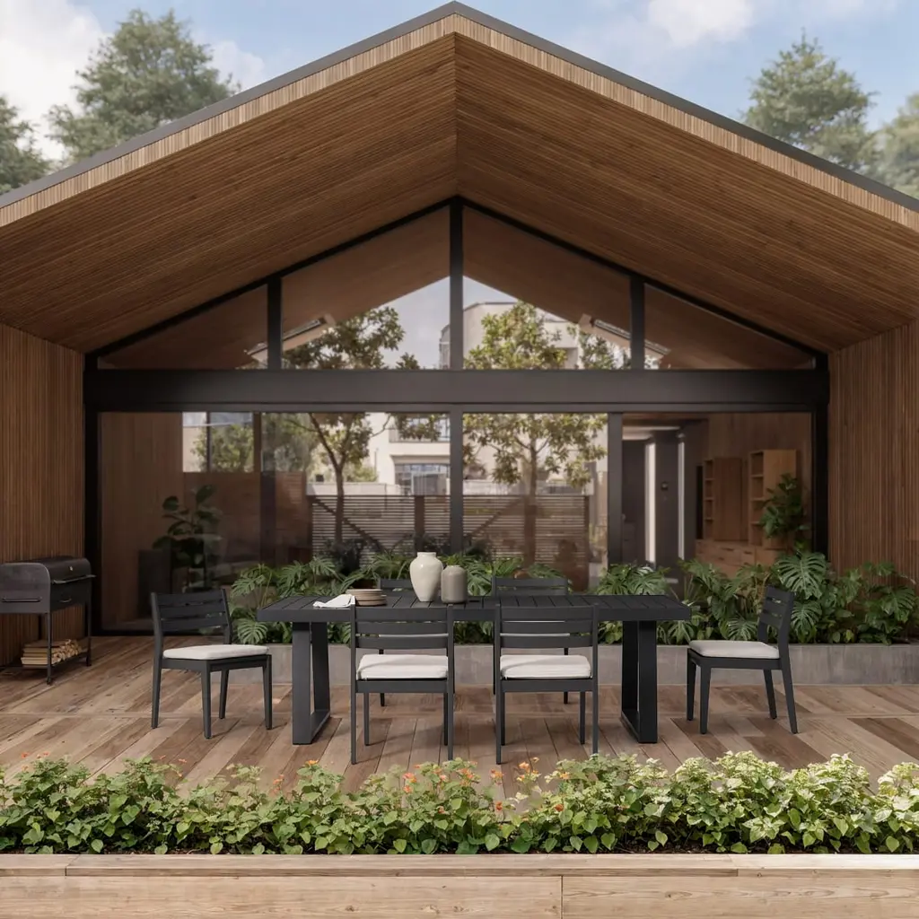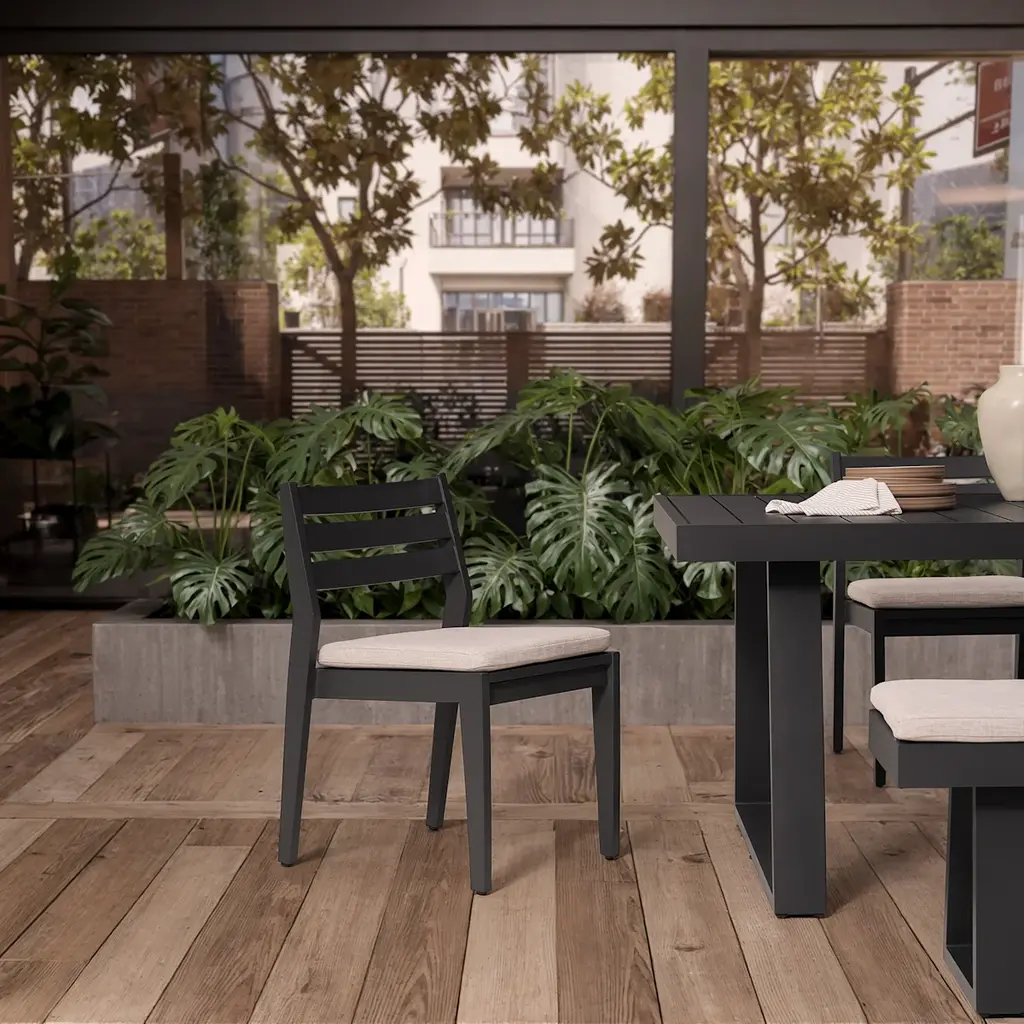 Sun-ready and stunning. That's our durable teak wood and aluminum Rio collection with angular profile to make entertaining a stylish affair.