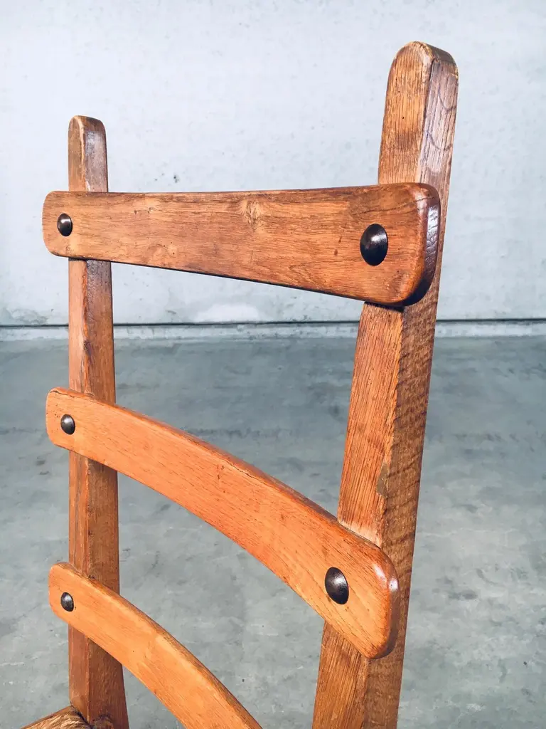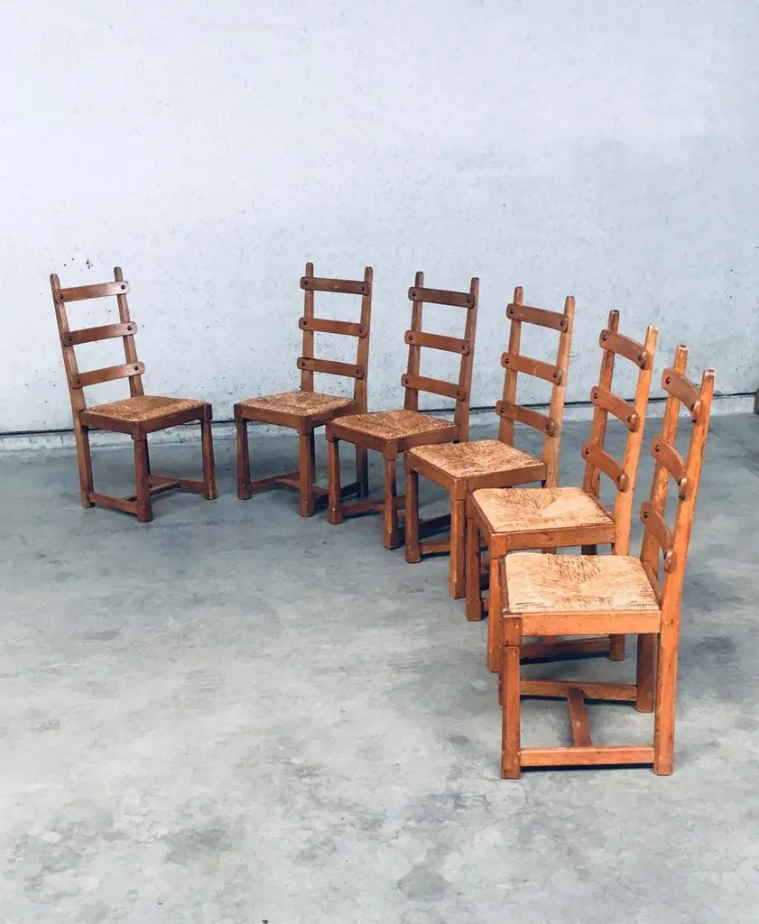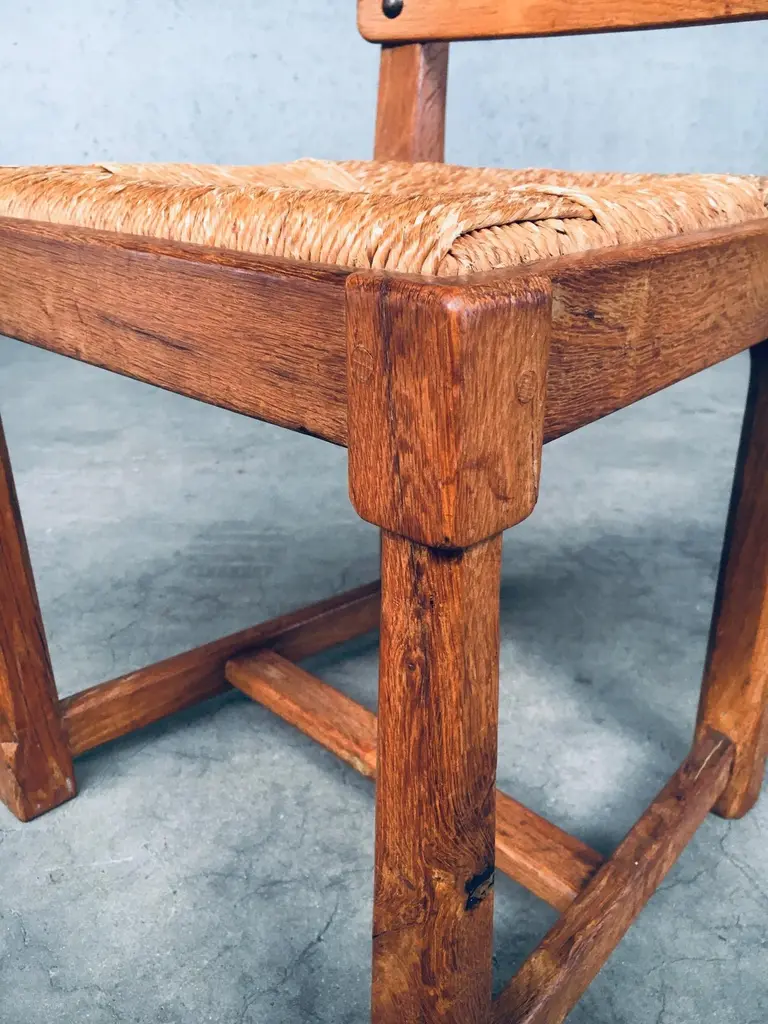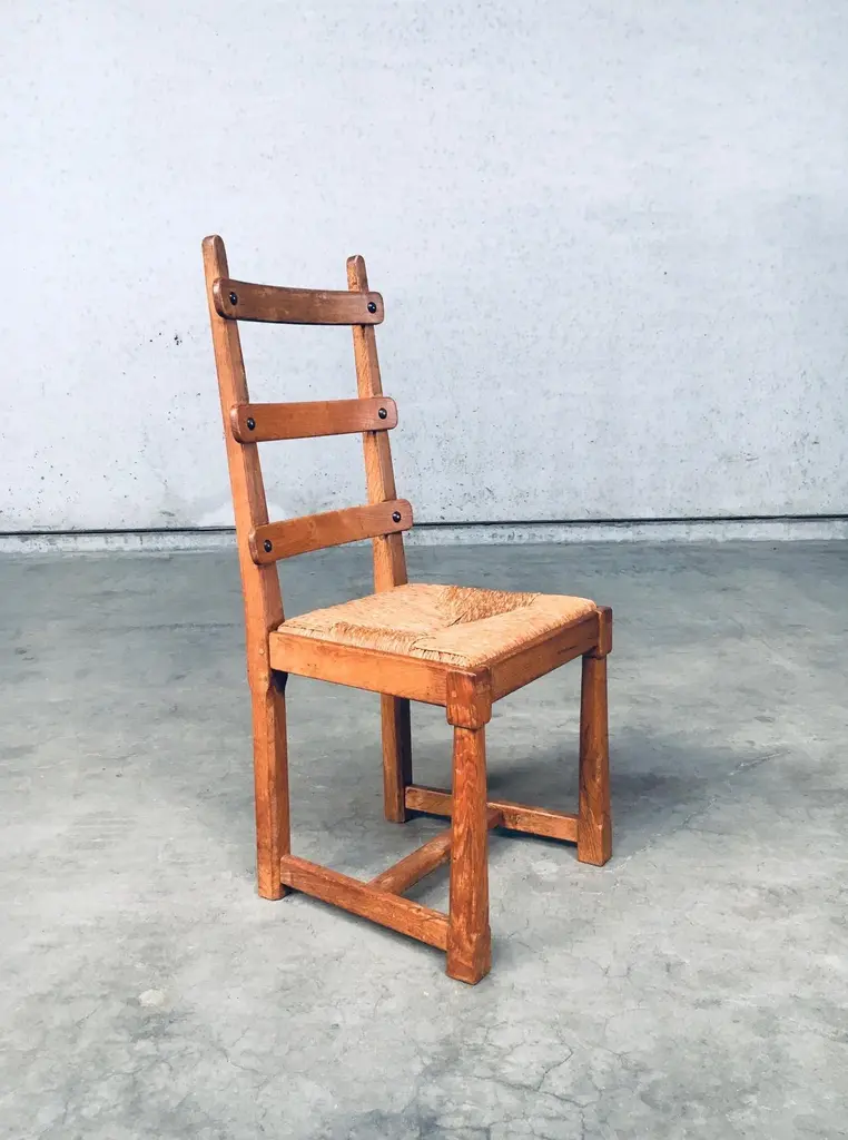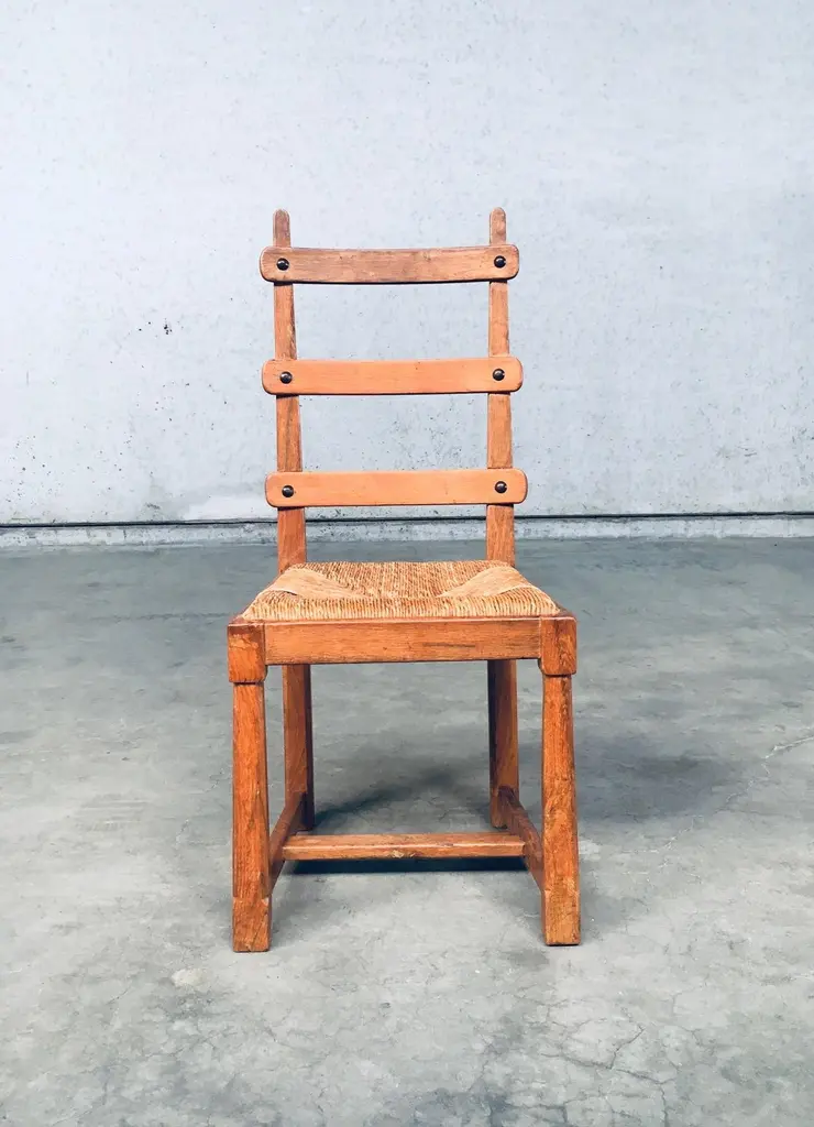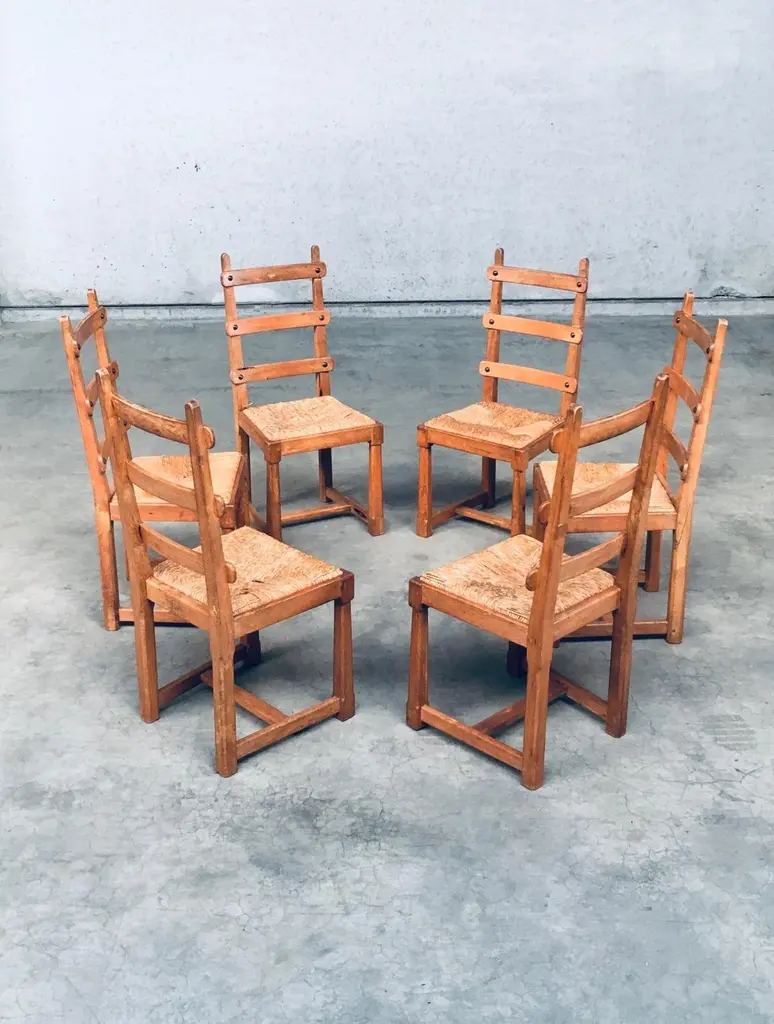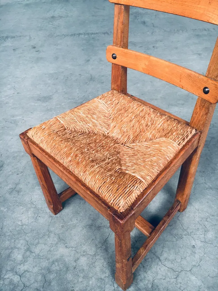 Vintage Rustic / Brutalist in Design Oak Slat Back Dining Chair set of 6. Made in Belgium, 1950's / 60's period. Solid oak constructed chairs with woven rush seats. The slats in the back are attached with brass studs. The design and construction gives them a brutalist look. All chairs are in good to very good condition. Some have a little bit damage on the rush seats, and all have signs of their age and use. Visible marks on the wood. One chair has a part broken of the leg bottom (see picture). Each chair measures 104cm x 45,5cm x 43cm - seat height measures 46cm.Sold as a set of 6 chairs.
