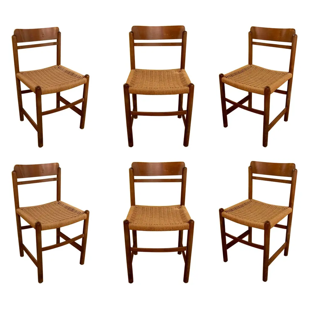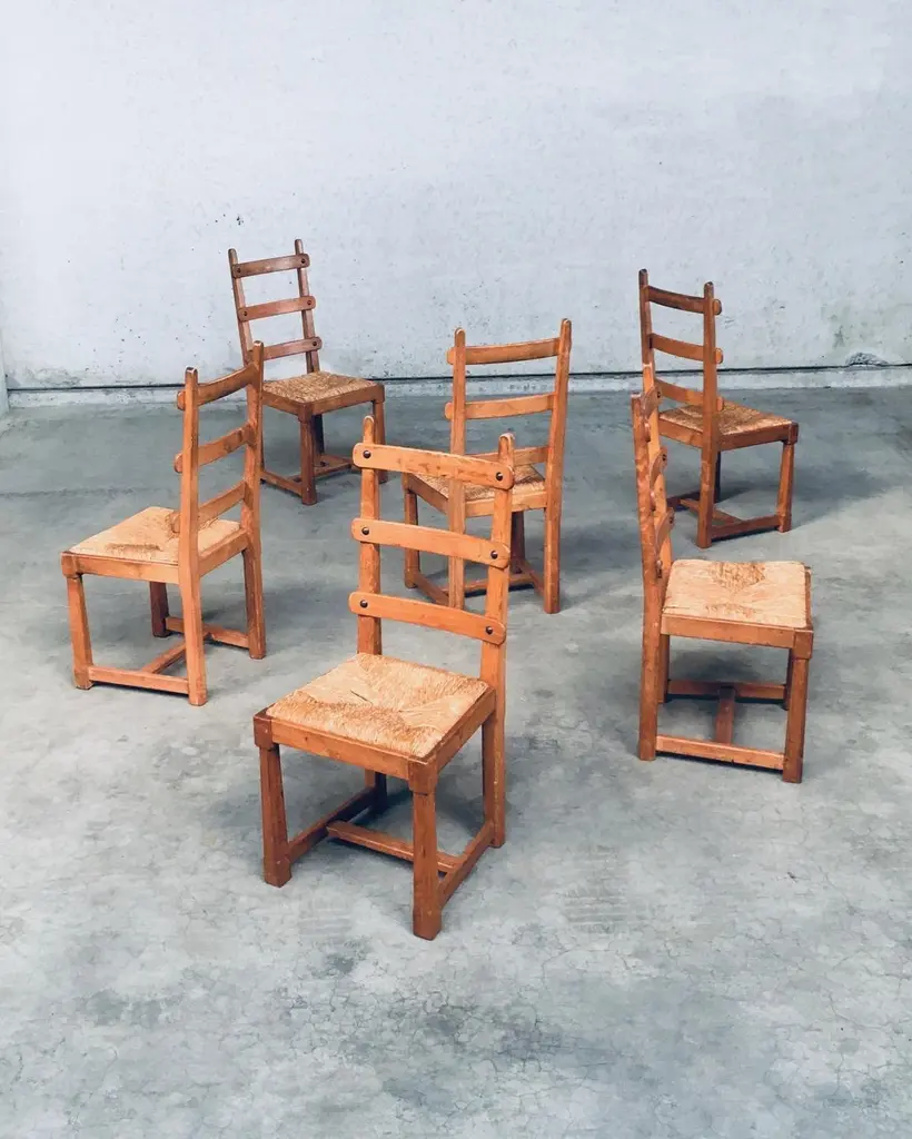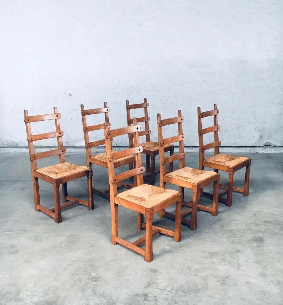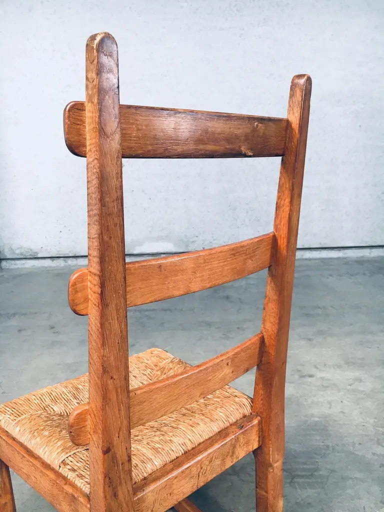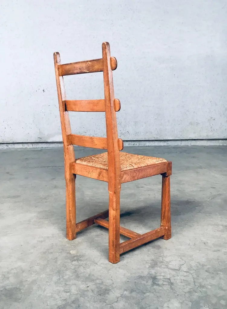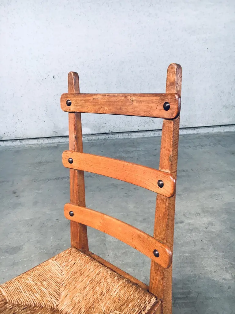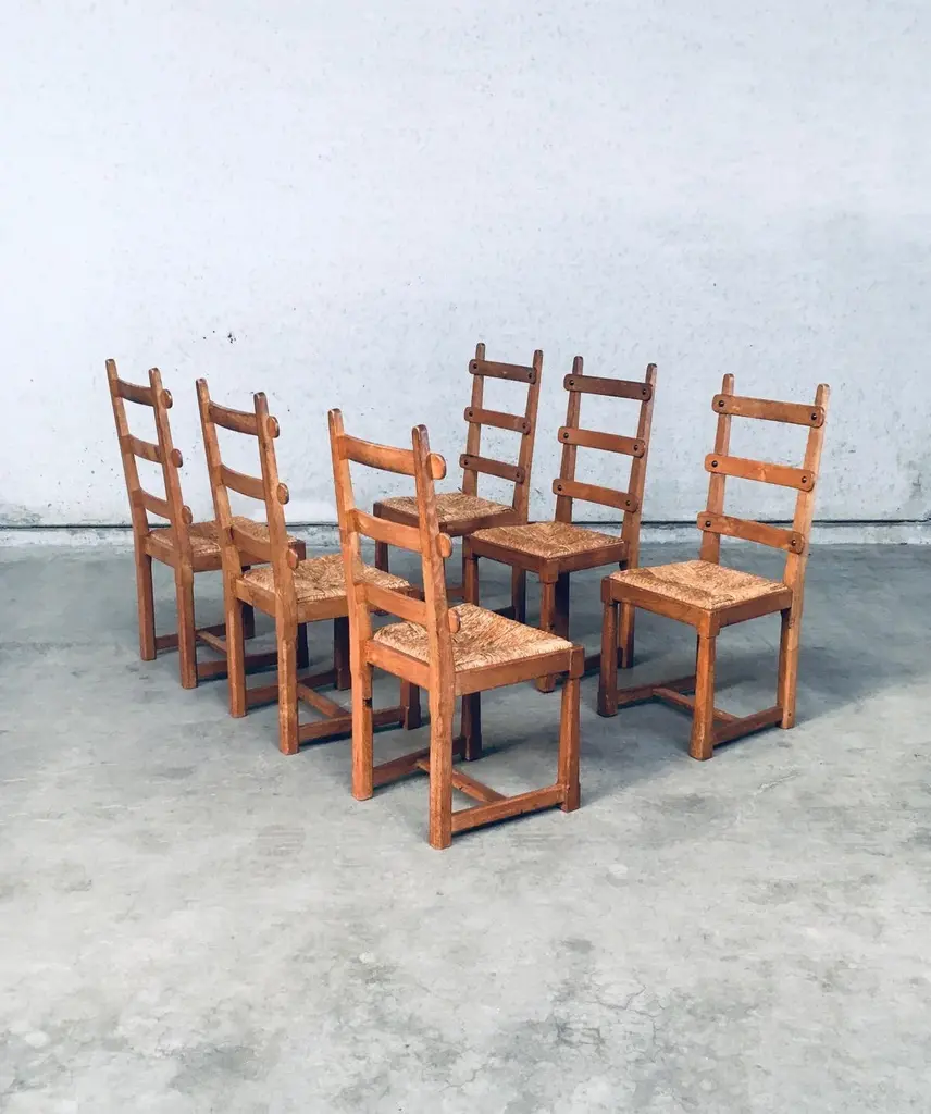 Vintage Rustic / Brutalist in Design Oak Slat Back Dining Chair set of 6. Made in Belgium, 1950's / 60's period. Solid oak constructed chairs with woven rush seats. The slats in the back are attached with brass studs. The design and construction gives them a brutalist look. All chairs are in good to very good condition. Some have a little bit damage on the rush seats, and all have signs of their age and use. Visible marks on the wood. One chair has a part broken of the leg bottom (see picture). Each chair measures 104cm x 45,5cm x 43cm - seat height measures 46cm.Sold as a set of 6 chairs.