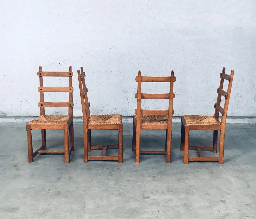 Rustic Brutalist Design Oak Slat Back Dining Chair Set, Belgium 1960's